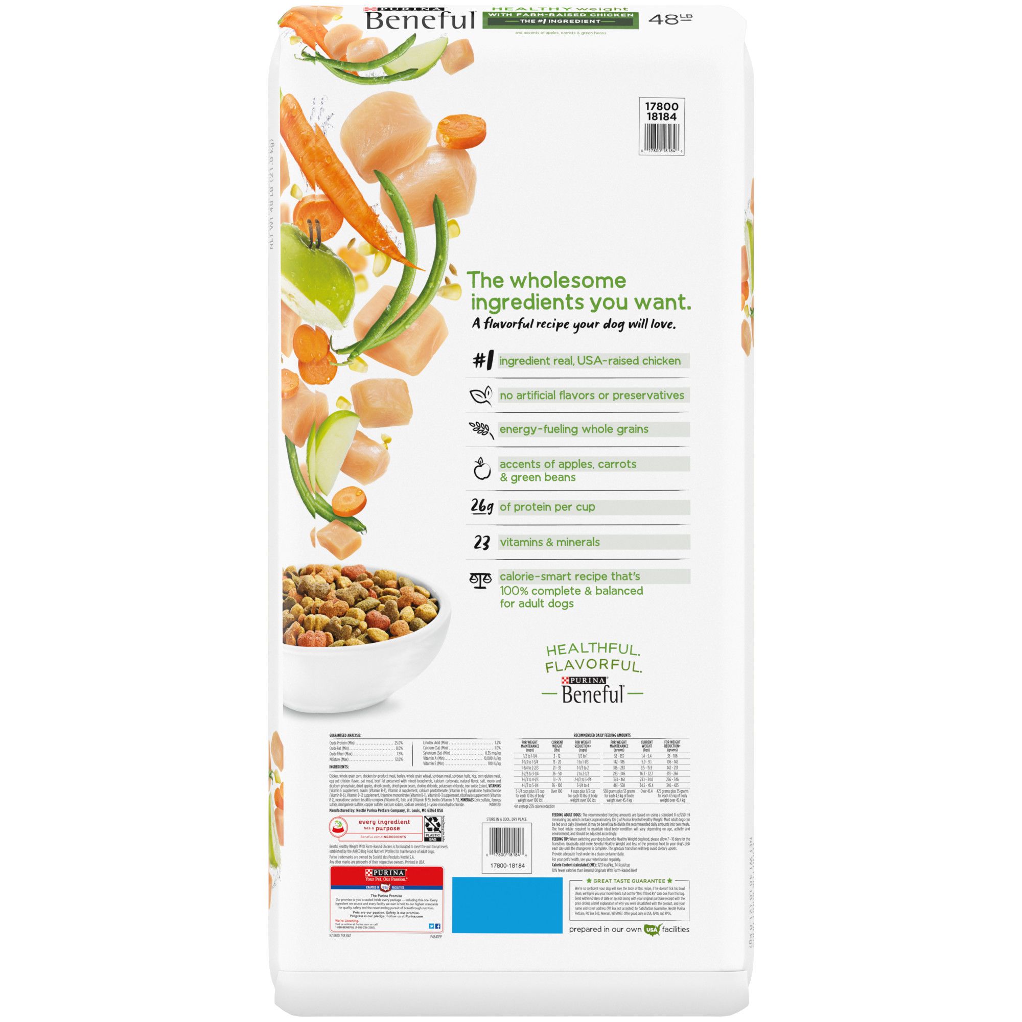 Natural dog food with added vitamins, minerals and nutrients that’s 100 percent complete and balanced for adult dogs with wholesome ingredients and a flavorful recipe your dog will love Dog kibble made with accents of apples, carrots and green beans and no artificial preservatives or flavors and added colors only from natural sources Purina Beneful dry dog food formula with 25 grams of high-quality protein per cup to help maintain strong muscles, while 23 vitamins and minerals to support overall health and wellness Produced in U.S. facilities where steps are taken to nurture your dog and the environment, like conserving water, investing in renewable electricity, and maintaining zero waste for disposal Includes Beneful Healthy Weight Fairmed-Raised Chicken 48 lbs.