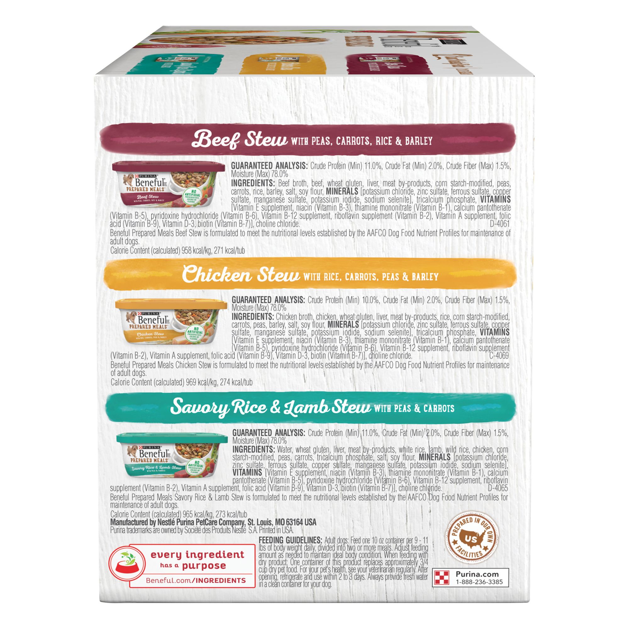 Fill your dog’s menu with 100% taste and 100% nutrition with a Purina Beneful Prepared Meals Stew adult wet dog food variety pack. It’s easy to create exciting mealtime experiences for your dog while nourishing his body with the wholesome ingredients found in three tasty flavor combos. Featuring tender, meaty chunks with real beef, chicken or lamb, this high-protein dog food helps support strong muscles. A delicious gravy adds flavor and texture to the savory stew recipes. Real vegetables and grains you can see in this dog food with gravy let you know you’re offering him a high-quality meal. Each adult dog food recipe is 100% complete and balanced and includes 23 essential vitamins and minerals to support his overall health. Plus, these yummy entrees contain no artificial colors, flavors or preservatives. The convenient reclosealable Purina Beneful dog food tubs make storing his leftovers a breeze. Serve the stews as hearty meals, or make his Purina Beneful Originals With Real Beef dry dog food even more enticing by using them as wet dog food toppers. Keep your four-legged best friend guessing which delicious meal is waiting in his bowl with this Purina Beneful Prepared Meals Stew variety pack dog food proudly produced in Purina-owned, U.S. facilities.