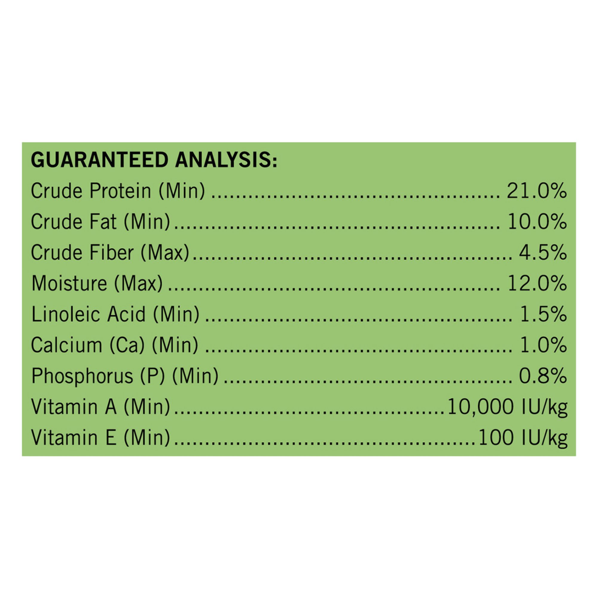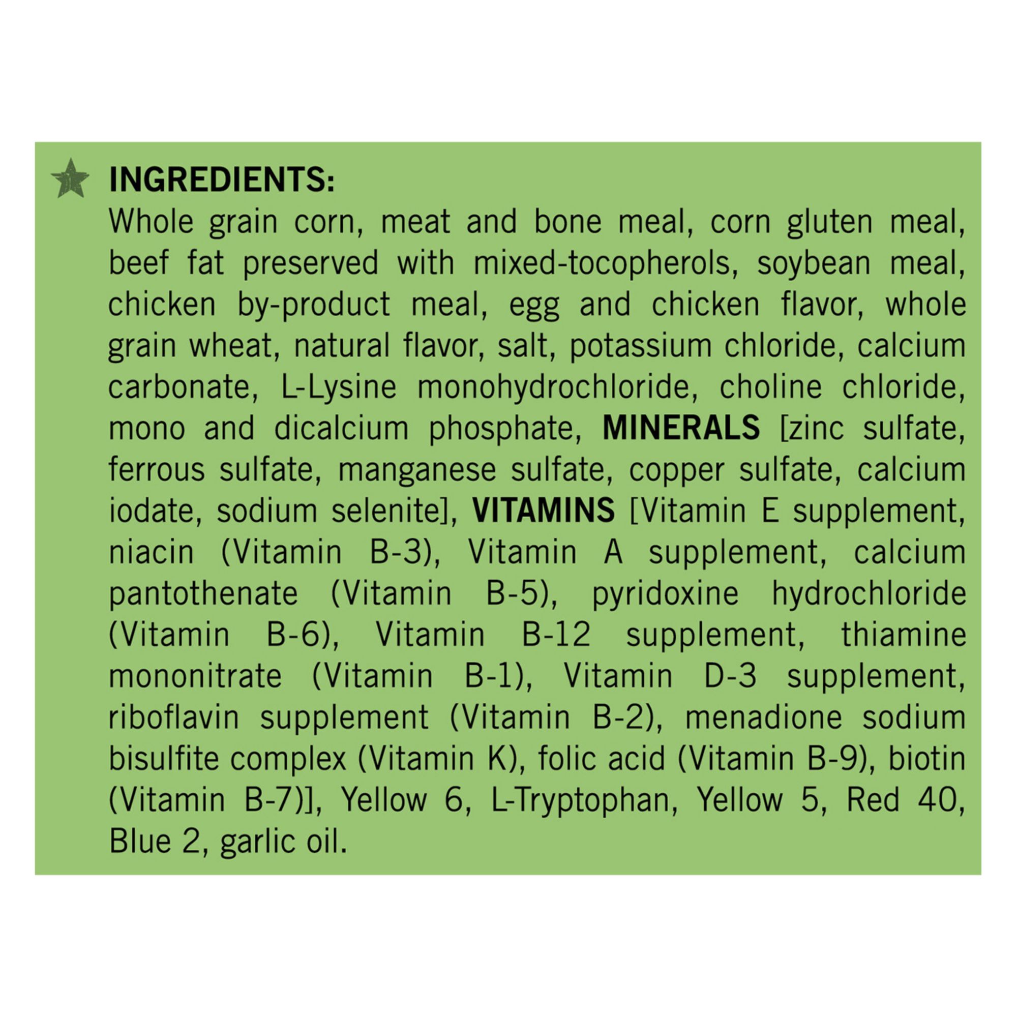 Ingredients:Whole Grain Corn, Meat and Bone Meal, Corn Gluten Meal, Beef Fat Preserved with Mixed-Tocopherols, Soybean Meal, Chicken By-Product Meal, Egg and Chicken Flavor, Whole Grain Wheat, Natural Flavor, Salt, Potassium Chloride, Calcium Carbonate, L-Lysine Monohydrochloride, Choline Chloride, Mono and Dicalcium Phosphate, Minerals [Zinc Sulfate, Ferrous Sulfate, Manganese Sulfate, Copper Sulfate, Calcium Iodate, sodium Selenite], Vitamins [Vitamin E Supplement, Niacin (Vitamin B-3), Vitamin A Supplement, Calcium Pantothenate (Vitamin B-5), Pyridoxine Hydrochloride (Vitamin B-6), Vitamin B-12 Supplement, Thiamine Mononitrate (Vitamin B-1), Vitamin D-3 Supplement, Riboflavin Supplement (Vitamin B-2), Menadione Sodium Bisulfite Complex (Vitamin K), Folic Acid (Vitamin B-9), Biotin (Vitamin B-7)], Yellow 6, L-Tryptophan, Yellow 5, Red 40, Blue 2, Garlic Oil. G410122.