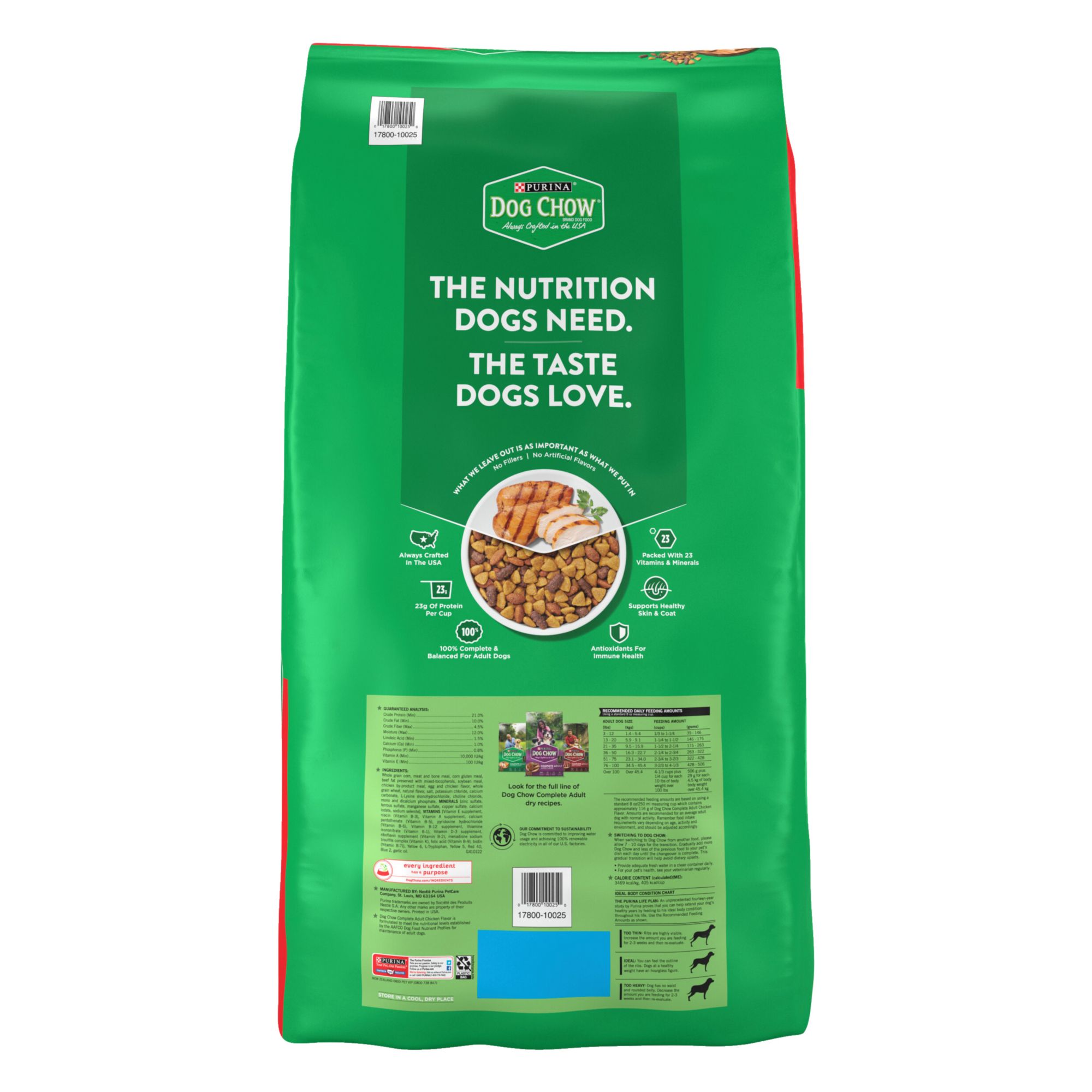 Dish up daily servings of Purina dog chow complete adult chicken flavor kibble dog food to give your dog the essential nutrition they need to keep up with you and your healthy life together. This delicious, wholesome dog food made with high-quality ingredients is carefully crafted to support your dog's healthy nutrition and has a taste dogs love. This Purina dry dog food is made to provide the 100 percent complete and balanced nutrition adult dogs need to help them live long, healthy lives. Nutritious ingredients and high-quality protein for dogs support strong muscles for an active lifestyle that helps keep your dog happy and healthy, while crunchy dog kibble helps clean teeth and offers a delightful texture. You can feel confident in the dog food you serve your best friend because Purina dog chow complete adult dog food is carefully crafted by employees who trust it enough to feed it to their own dogs.