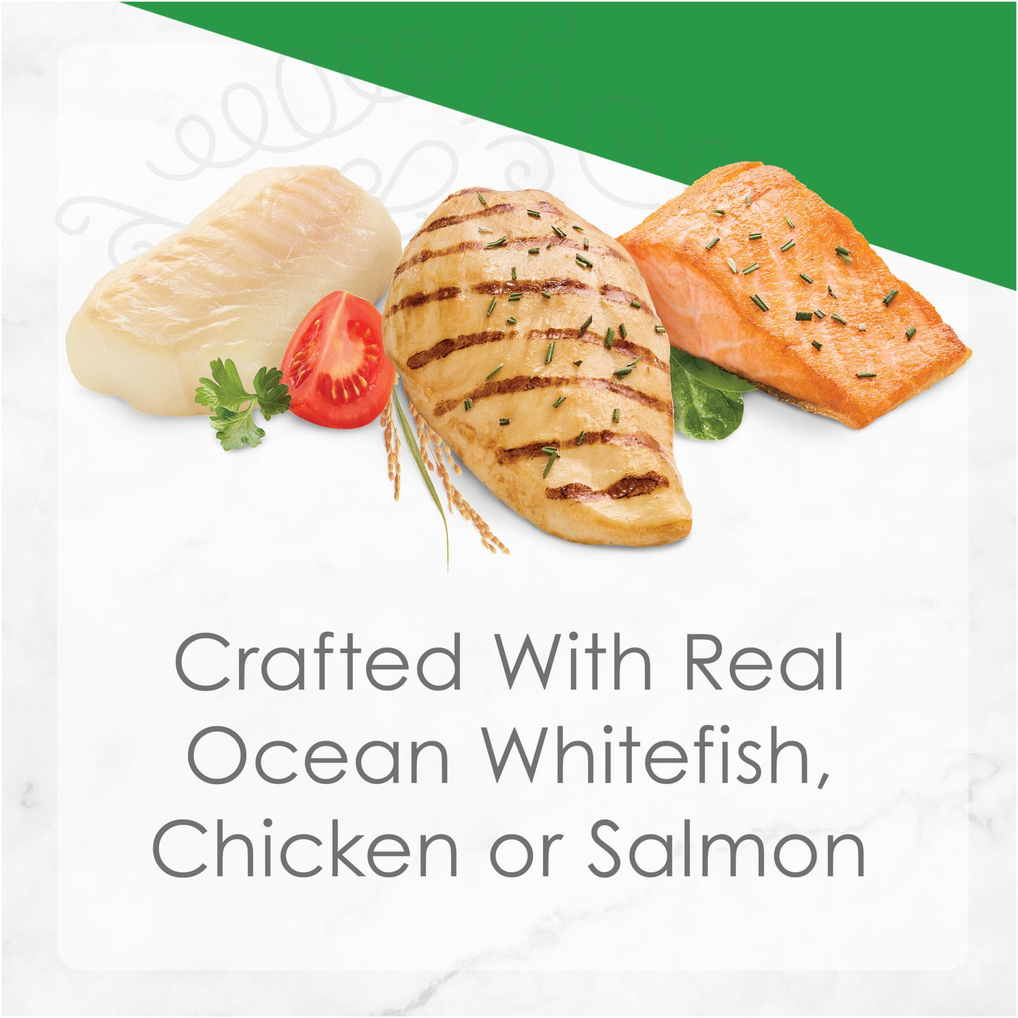 Ocean Whitefish: Fish Broth, Ocean Whitefish, Wheat Gluten, Tomatoes, Meat by-products, Liver, Corn Starch-modified, Chicken, Artificial and Natural Flavors, Corn Oil, Salt, Soy Protein Concentrate, Tricalcium Phosphate, Minerals [potassium Chloride, Mono and Dicalcium Phosphate, Magnesium Sulfate, Zinc Sulfate, Ferrous Sulfate, Copper Sulfate, Manganese Sulfate, Potassium Iodide], Taurine, Choline Chloride, Vitamins [thiamine Mononitrate, Vitamin E Supplement, Niacin, Calcium Pantothenate, Vitamin A Supplement, Menadione Sodium Bisulfite Complex, Pyridoxine Hydrochloride, Riboflavin Supplement, Vitamin B-12 Supplement, Biotin, Folic Acid, Vitamin D-3 Supplement]. A661419; Salmon: Salmon Broth, Salmon, Wheat Gluten, Liver, Meat by-products, Chicken, Corn Starch-modified, Spinach, Artificial, and Natural Flavors, Salt, Soy Protein Concentrate, Tricalcium Phosphate, Minerals [potassium Chloride, Mono and Dicalcium Phosphate, Magnesium Sulfate, Zinc Sulfate, Ferrous Sulfate, Copper Sulfate, Manganese Sulfate, Potassium Iodide], Taurine, Choline Chloride, Vitamins [thiamine Mononitrate, Vitamin E Supplement, Niacin, Calcium Pantothenate, Vitamin a Supplement, Menadione Sodium Bisulfite Complex, Pyridoxine Hydrochloride, Riboflavin Supplement, Vitamin B-12 Supplement, Biotin, Folic Acid, Vitamin D-3 Supplement]. A661319; Chicken: Chicken Broth, Chicken, Wheat Gluten, Liver, Meat by-products, Rice, Corn Starch-modified, Artificial, and Natural Flavors, Salt, Tricalcium Phosphate, Soy Protein Concentrate, Minerals [potassium Chloride, Magnesium Sulfate, Mono and Dicalcium Phosphate, Zinc Sulfate, Ferrous Sulfate, Copper Sulfate, Manganese Sulfate, Potassium Iodide], Taurine, Choline Chloride, Vitamins [Thiamine Mononitrate, Vitamin E Supplement, Niacin, Calcium Pantothenate, Vitamin a Supplement, Menadione Sodium Bisulfite Complex, Pyridoxine Hydrochloride, Riboflavin Supplement, Vitamin B-12 Supplement, Biotin, Folic Acid, Vitamin D-3 Supplement]. A661119