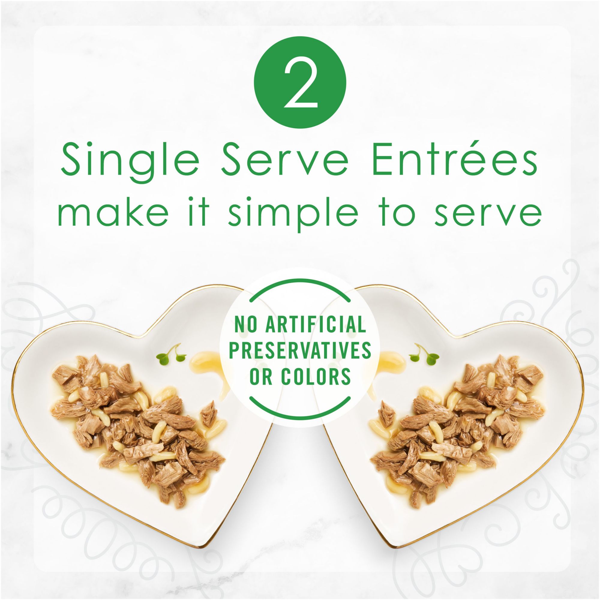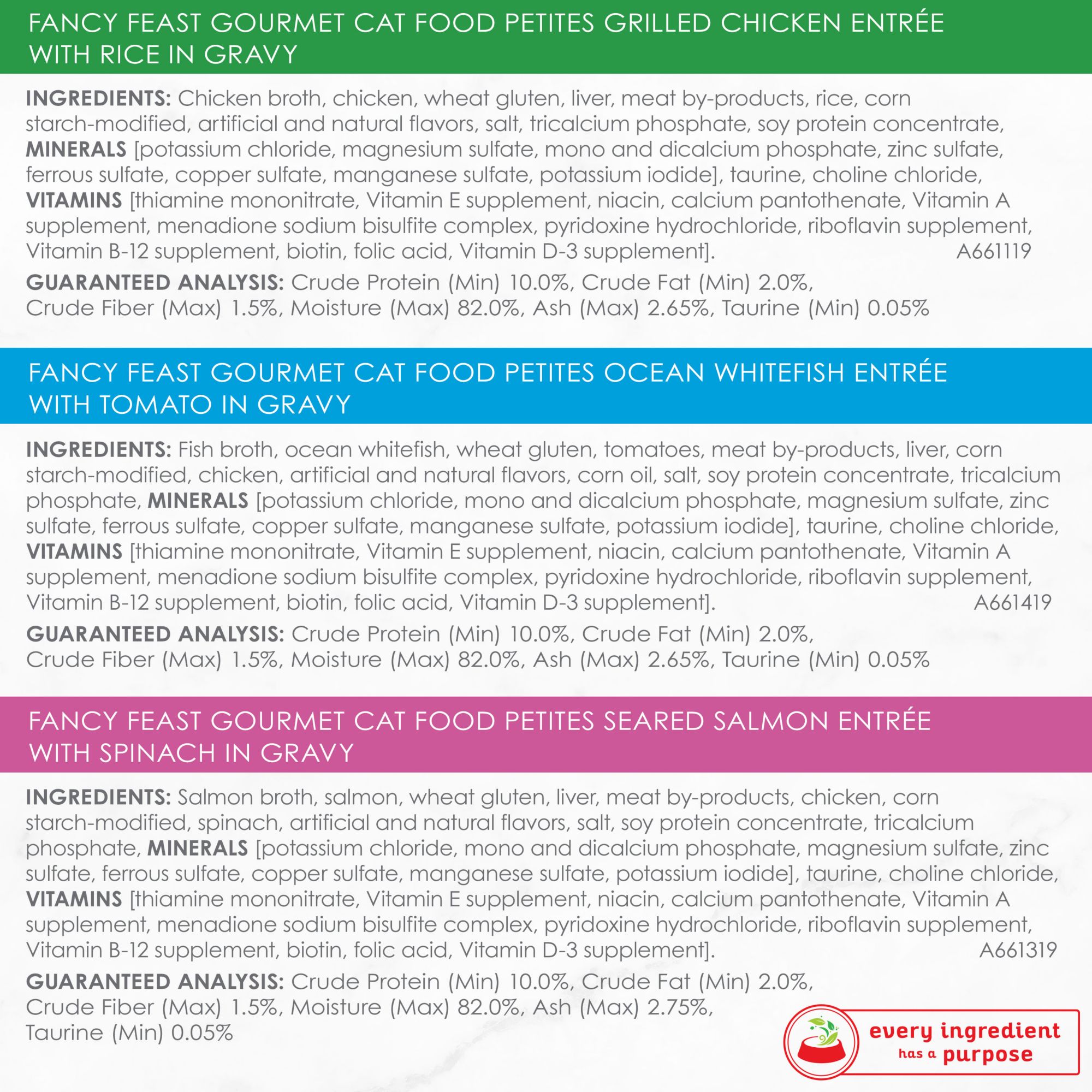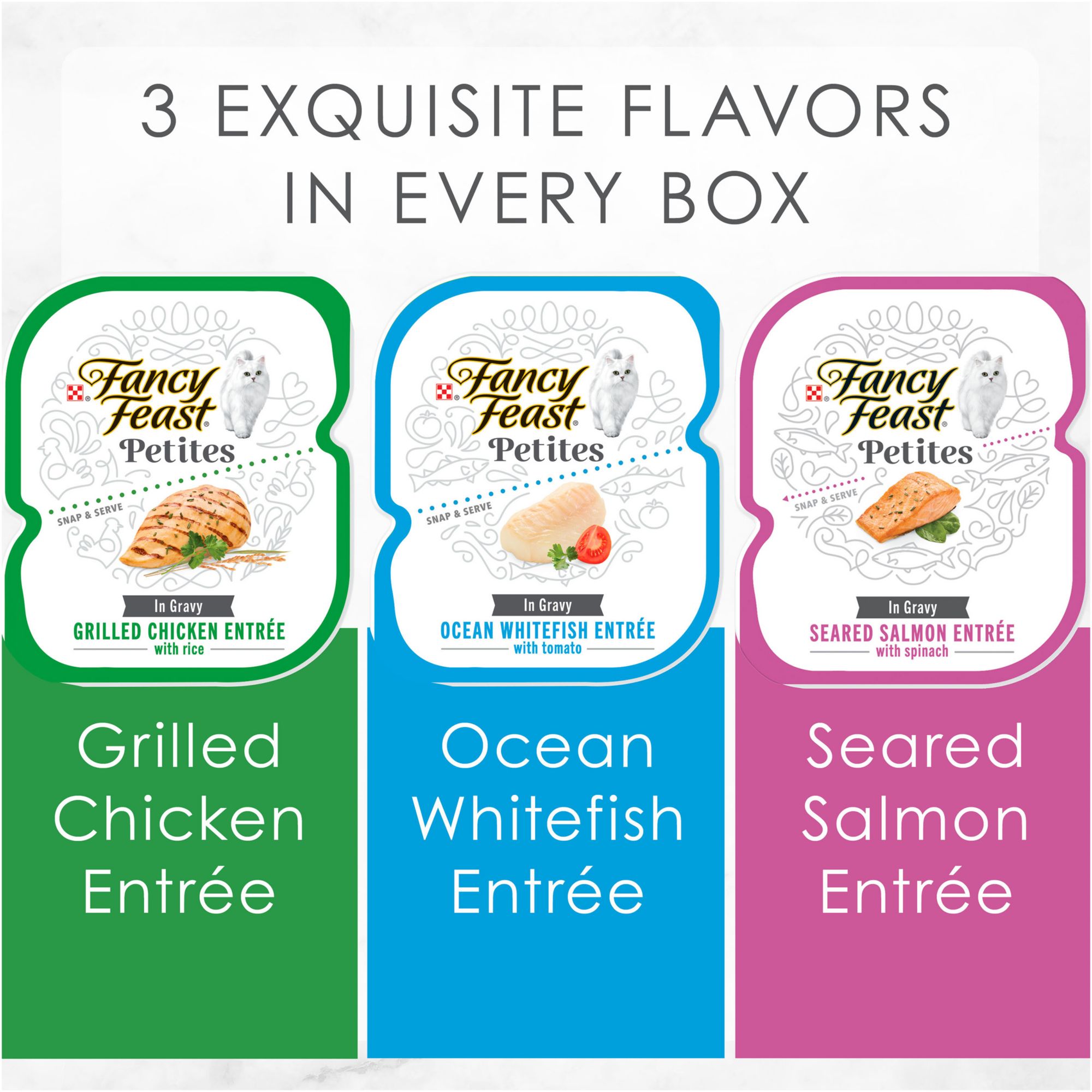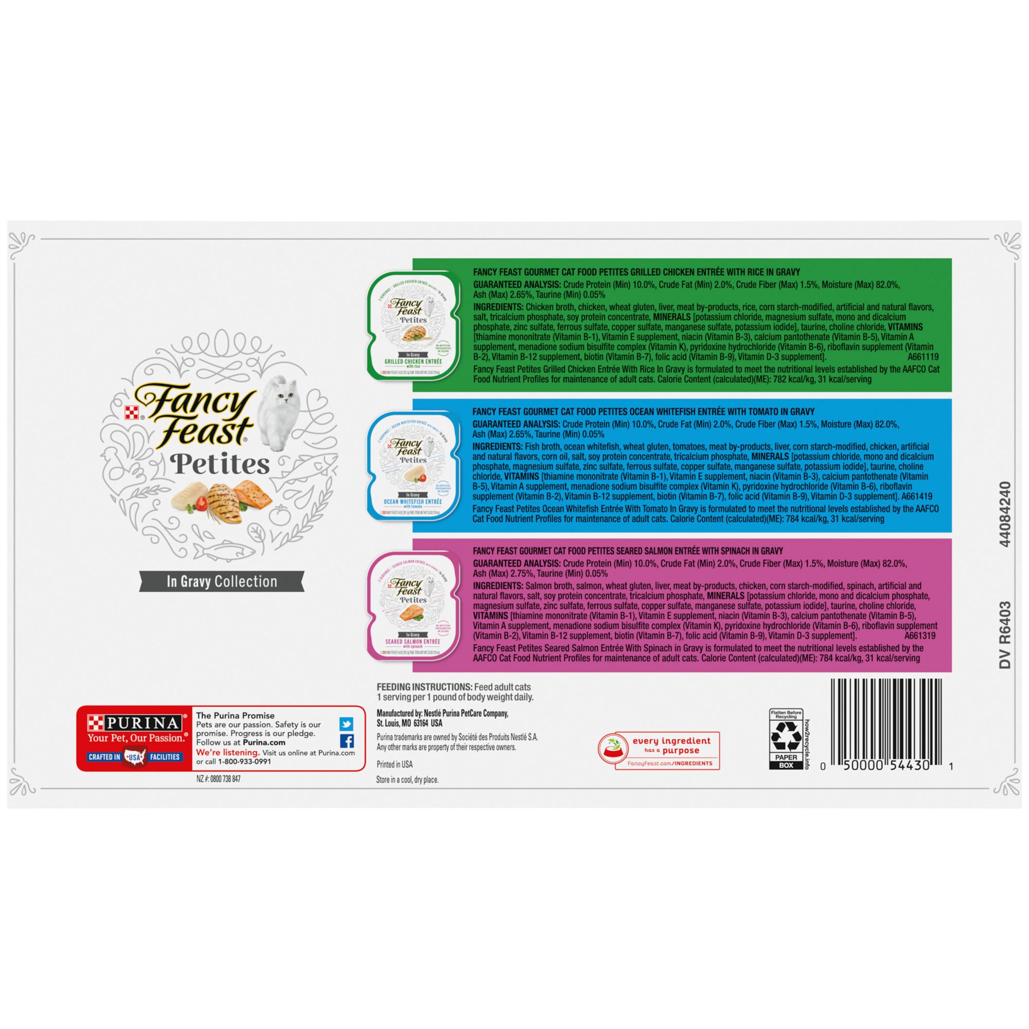 Turn feeding time into a gourmet experience for your cat with the sophisticated entrees in the Purina Fancy Feast Petites gourmet wet cat food gravy collection variety pack. Packaged in convenient, single-serving cat food trays, the tasty recipes let you tempt her discerning palate anytime with no mess and no leftovers. Simply snap the divided tray in half, peel back the top and serve. We craft gourmet cat food with gravy with no artificial preservatives or colors to meet your ingredient preferences. Your cat is sure to love the irresistible flavors of the elevated entrees in this cat food wet variety pack, which includes ocean whitefish entree with tomato in gravy, roasted Turkey entree with sweet potato in gravy, and grilled chicken entree with rice in gravy. While she savors the decadently delicious recipes made with real poultry or fish, you can appreciate knowing you're providing complete and balanced nutrition for the maintenance of adult cats.
