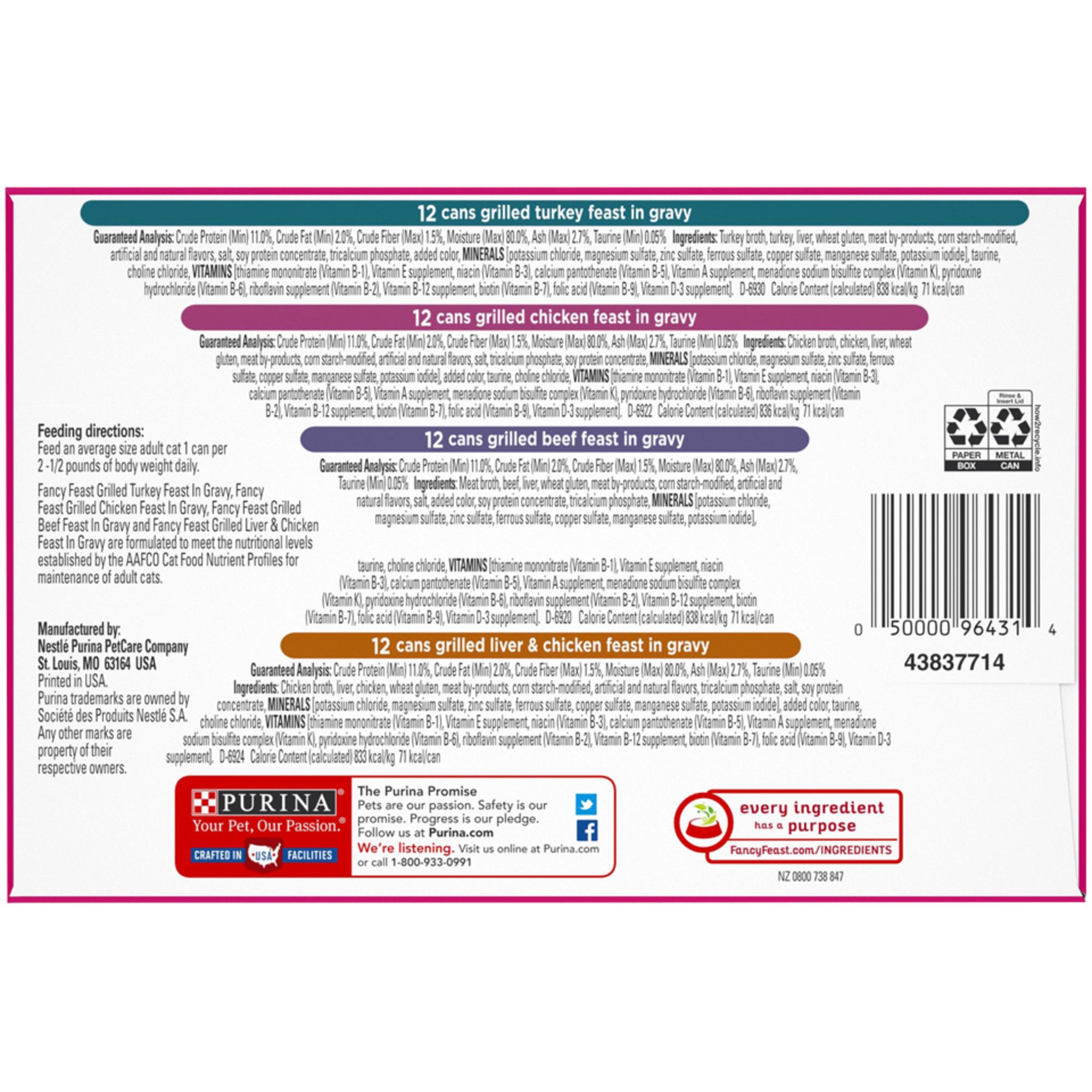 Let your sophisticated cat choose from a mouthwatering array of gourmet recipes with Purina Fancy Feast Grilled Poultry & Beef Collection adult wet cat food. Tender cuts of beef, turkey, and chicken slow-cooked to perfection give your cat the savory tastes she loves, and the delicate gravy balances out each protein-rich cat food variety for added flavor and moisture. Essential vitamins and minerals in every serving plus 100% complete and balanced nutrition for adult cats help to support her overall health and wellness, so you can feel confident every time you reach for a can. With four different delectable recipes in each variety pack, this gourmet wet cat food makes it easy to keep her feedings as exciting as they are nutritious. Watch as she delights in the different tastes and textures of each gourmet recipe, and take comfort in knowing she's getting high-quality ingredients backed by a cat food brand you can trust.