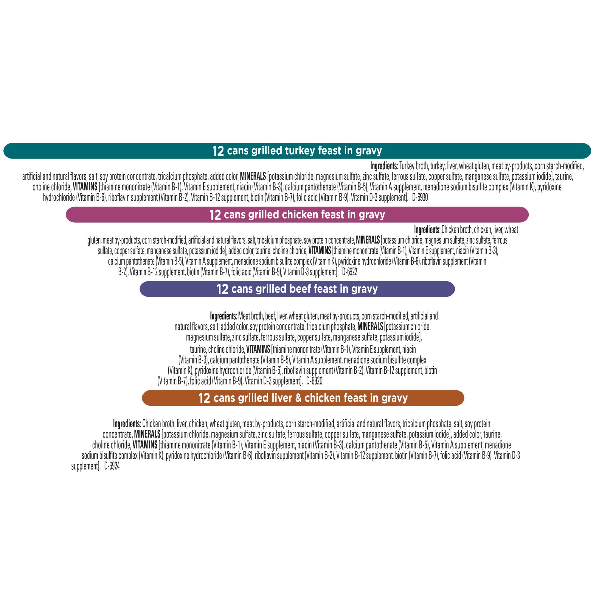 Ingredients: Turkey Feast In Gravy: Turkey Broth, Turkey, Liver, Wheat Gluten, Meat By-Products, Corn Starch-Modified, Artificial And Natural Flavors, Salt, Soy Protein Concentrate, Tricalcium Phosphate, Added Color, Minerals [Potassium Chloride, Magnesium Sulfate, Zinc Sulfate, Ferrous Sulfate, Copper Sulfate, Manganese Sulfate, Potassium Iodide], Taurine, Choline Chloride, Vitamins [Thiamine Mononitrate (Vitamin B-1), Vitamin E Supplement, Niacin (Vitamin B-3), Calcium Pantothenate (Vitamin B-5), Vitamin A Supplement, Menadione Sodium Bisulfite Complex (Vitamin K), Pyridoxine Hydrochloride (Vitamin B-6), Riboflavin Supplement (Vitamin B-2), Vitamin B-12 Supplement, Biotin (Vitamin B-7), Folic Acid (Vitamin B-9), Vitamin D-3 Supplement]. D-6930. Chicken Feast In Gravy: Chicken Broth, Chicken, Liver, Wheat Gluten, Meat By-Products, Corn Starch-Modified, Artificial And Natural Flavors, Salt Tricalcium Phosphate, Soy Protein Concentrate, Minerals [Potassium Chloride, Magnesium Sulfate, Zinc Sulfate, Ferrous Sulfate, Copper Sulfate, Manganese Sulfate, Potassium Iodide], Added Color, Taurine, Choline Chloride, Vitamins [Thiamine Mononitrate (Vitamin B-1), Vitamin E Supplement, Niacin (Vitamin B-3), Calcium Pantothenate (Vitamin B-5), Vitamin A Supplement, Menadione Sodium Bisulfite Complex (Vitamin K), Pyridoxine Hydrochloride (Vitamin B-6), Riboflavin Supplement (Vitamin B-2), Vitamin B-12 Supplement, Biotin (Vitamin B-7), Folic Acid (Vitamin B-9), Vitamin D-3 Supplement]. D-6922. Beef Feast In Gravy: Meat Broth, Beef, Liver, Wheat Gluten, Meat By-Products, Corn Starch-Modified, Artificial And Natural Flavors, Salt, Added Color, Soy Protein Concentrate, Tricalcium Phosphate, Minerals [Potassium Chloride, Magnesium Sulfate, Zinc Sulfate, Ferrous Sulfate, Copper Sulfate, Manganese Sulfate, Potassium Iodide], Taurine, Choline Chloride, Vitamins [Thiamine Mononitrate (Vitamin B-1), Vitamin E Supplement Niacin (Vitamin B-3), Calcium Pantothenate (Vitamin B-5), Vitamin A Supplement, Menadione Sodium Bisulfite Complex (Vitamin K), Pyridoxine Hydrochloride (Vitamin B-6), Riboflavin Supplement (Vitamin B-2), Vitamin B-12 Supplement, Biotin (Vitamin B-7), Folic Acid (Vitamin B-9), Vitamin D-3 Supplement). D-6920. Liver & Chicken Feast In Gravy: Chicken Broth, Liver, Chicken, Wheat Gluten, Meat By-Products, Corn Starch-Modified, Artificial And Natural Flavors, Tricalcium Phosphate, Salt, Soy Protein Concentrate, Minerals [Potassium Chloride, Magnesium Sulfate, Zinc Sulfate, Ferrous Sulfate, Copper Sulfate, Manganese Sulfate, Potassium Iodide], Added Color, Taurine, Choline Chloride, Vitamins [Thiamine Mononitrate (Vitamin B-1), Vitamin E Supplement, Niacin (Vitamin B-3), Calcium Pantothenate (Vitamin B-5), Vitamin A Supplement, Menadione Sodium Bisulfite Complex (Vitamin K), Pyridoxine Hydrochloride (Vitamin B-6), Riboflavin Supplement (Vitamin B-2), Vitamin B-12 Supplement, Biotin (Vitamin B-7), Folic Acid (Vitamin B-9), Vitamin D-3 Supplement]. D-6924.