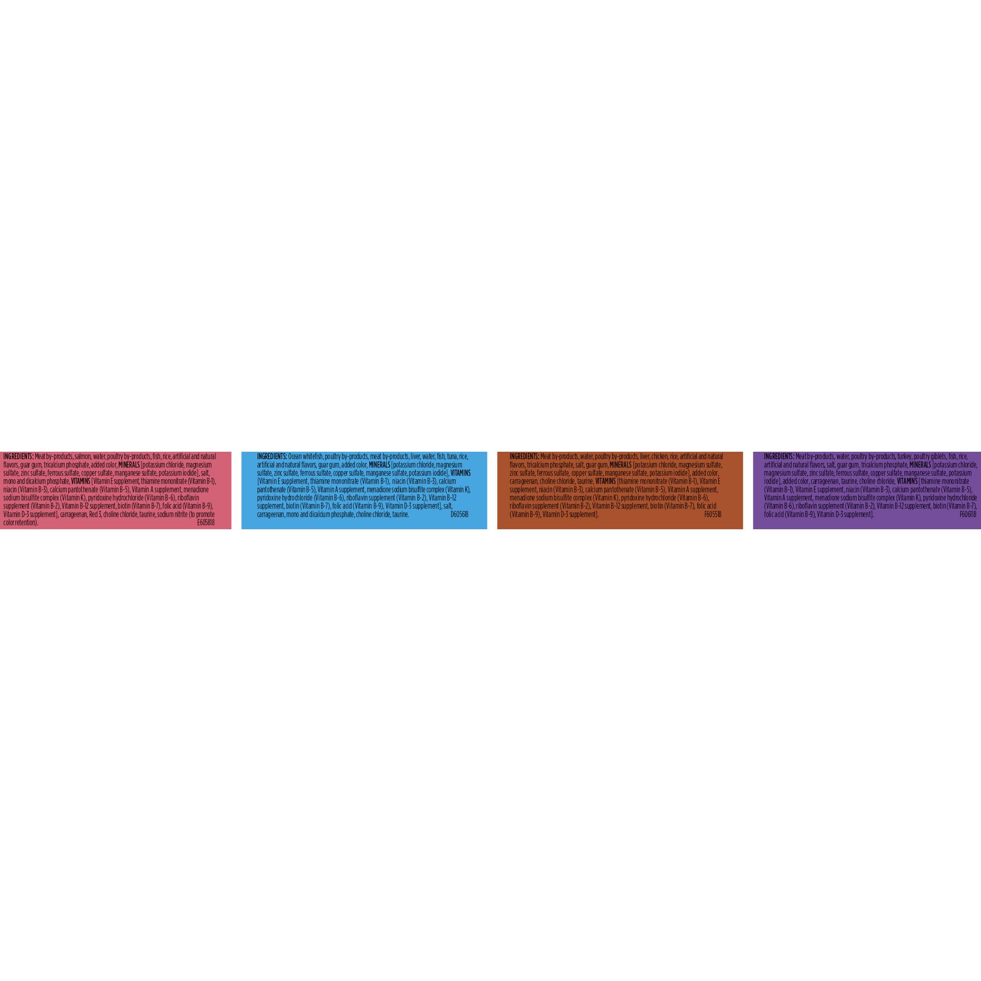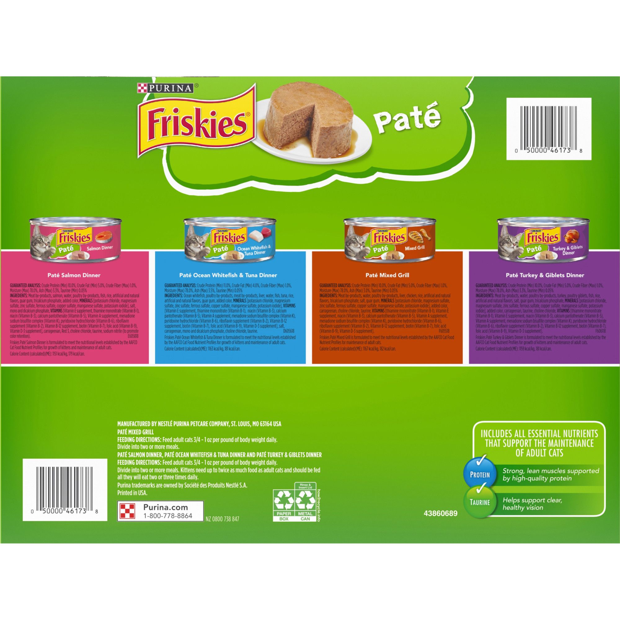The Purina Friskies Classic Pate Variety Pack gives you everything your cat needs for a satisifying, balanced meal. This wet cat food is formulated to meet the nutritional levels established by the AAFCO Cat Food Nutrient Profiles for growth of kittens and maintenance of adult cats. Each variety pack includes 12 cans of Salmon Dinner, 12 cans of Ocean Whitefish and Tuna Dinner, 12 cans of Mixed Grill and 12 cans of Turkey and Giblets Dinner.