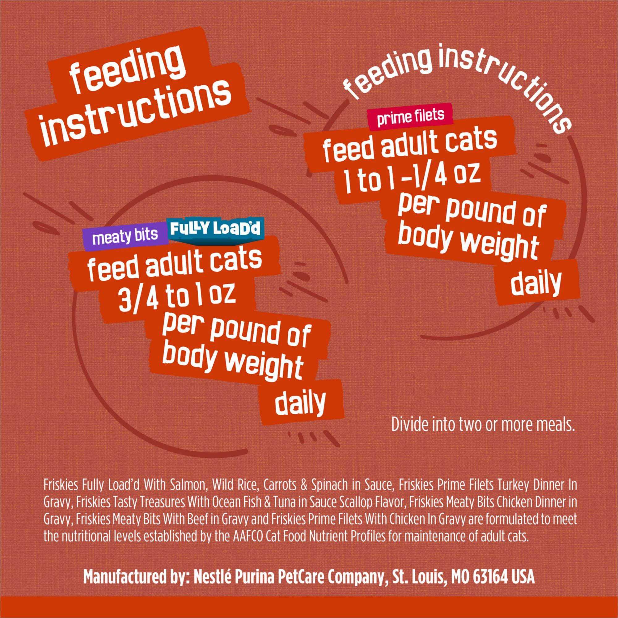Make mealtime fun for your cat with the six exciting recipes in this Purina Friskies Gravy Pleasers Meaty Bits, Fully Load'd, and Prime Filets moist cat food variety pack. This 60 ct. soft cat food assortment is chock-full of yummy recipes cats love in a medley of enticing textures, including Meaty Bits, Fully Loaded, and Prime Filets. The tender, moist cat food bites entice felines to finish every morsel, and real gravy adds flavor to the tasty recipes. This gravy cat food has high-quality protein to support your cat's strong muscles as she runs, pounces, and climbs. Each recipe includes 100% complete and balanced nutrition for adult cats with no artificial colors or preservatives.