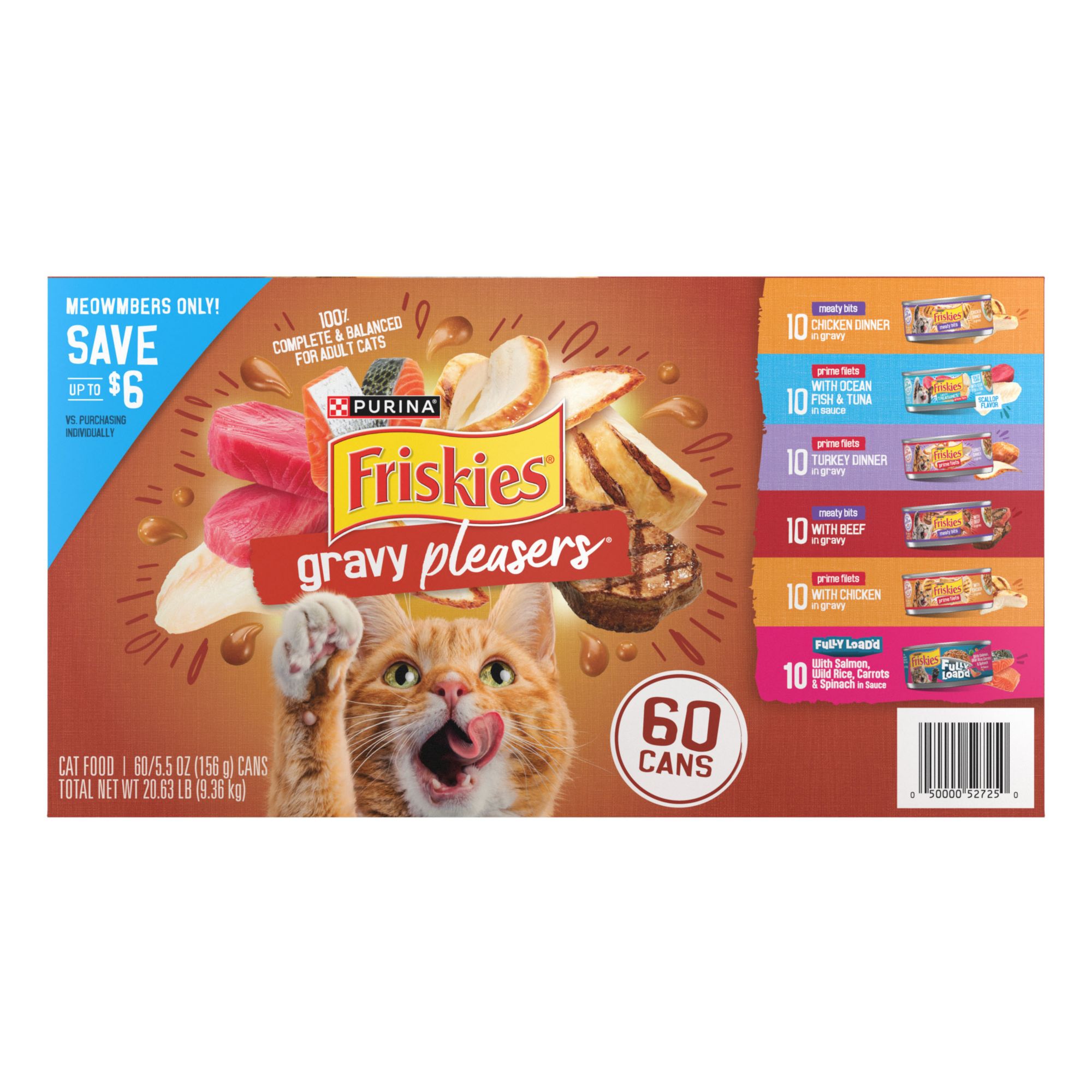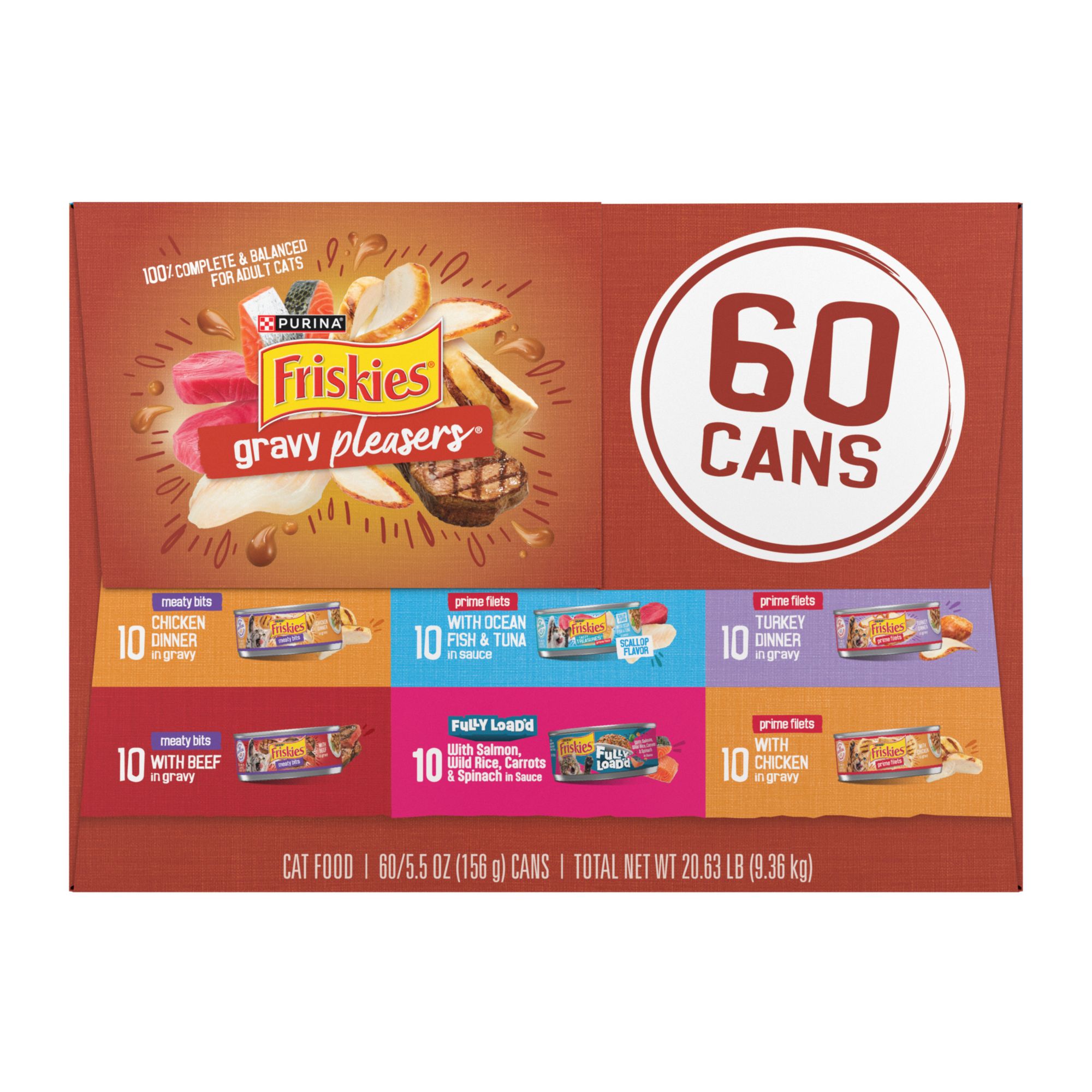 60 ct. in gravy cat food variety pack with six yummy varieties of wet cat food in gravy, including Fully Loaded, Prime Filets, and Meaty Bits cat food recipes