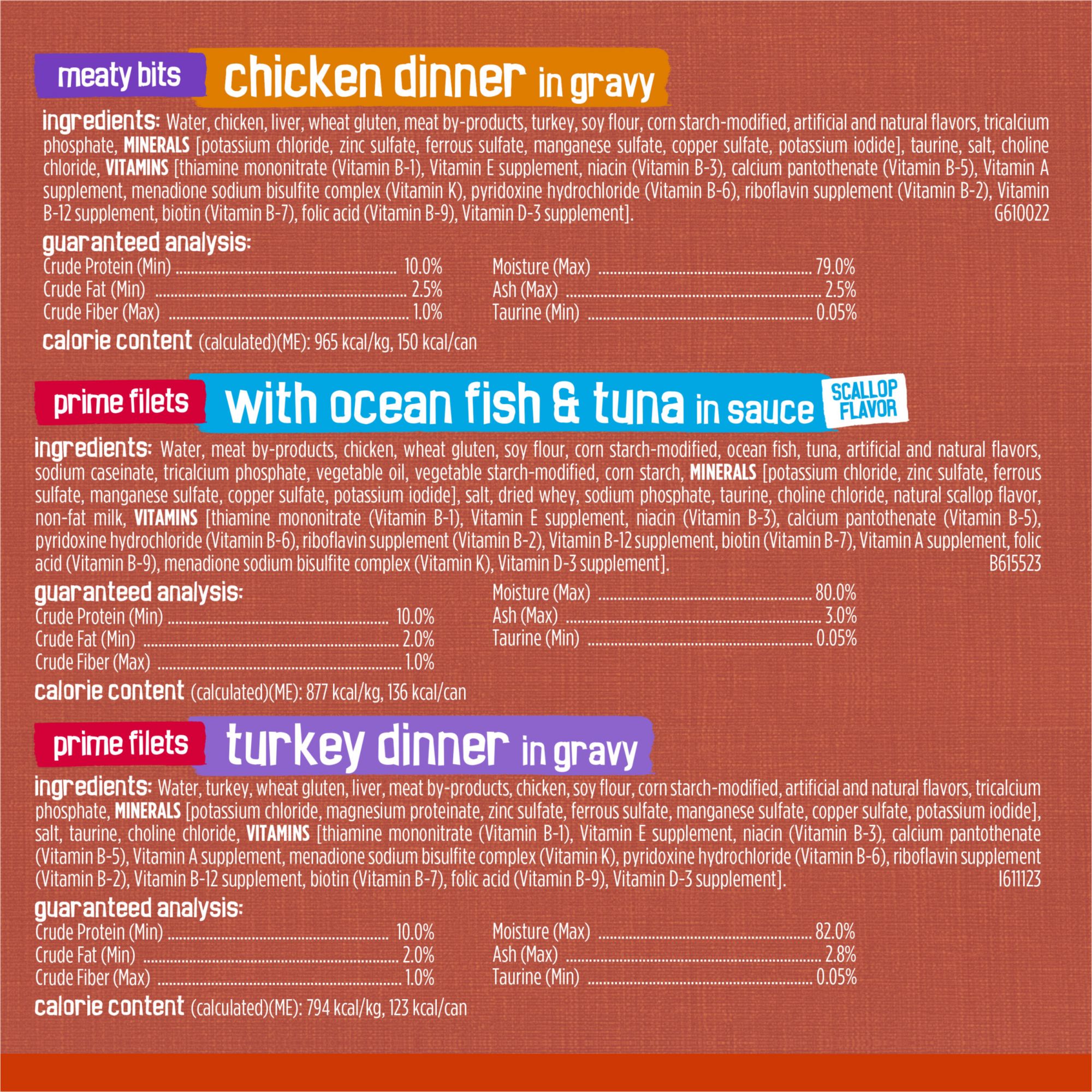 Ingredients: Chicken Dinner: Water, Chicken, Liver, Wheat Gluten, Meat By-Products, Turkey, Soy Flour, Corn Starch-Modified, Artificial And Natural Flavors, Tricalcium Phosphate, MINERALS [Potassium Chloride, Zinc Sulfate, Ferrous Sulfate, Manganese Sulfate, Copper Sulfate, Potassium Iodide], Taurine, Salt, Choline Chloride, VITAMINS [Thiamine Mononitrate (Vitamin B-1), Vitamin E Supplement, Niacin (Vitamin B-3), Calcium Pantothenate (Vitamin B-5), Vitamin A Supplement, Menadione Sodium Bisulfite Complex (Vitamin K), Pyridoxine Hydrochloride (Vitamin B-6), Riboflavin Supplement (Vitamin B-2), Vitamin B-12 Supplement, Biotin (Vitamin B-7), Folic Acid (Vitamin B-9), Vitamin D-3 Supplement]. G610022; Beef in Gravy: Water, Meat By-Products, Beef, Wheat Gluten, Chicken, Fish, Soy Flour, Corn Starch-Modified, Natural And Artificial Flavors, MINERALS [Potassium Chloride, Zinc Sulfate, Ferrous Sulfate, Manganese Sulfate, Copper Sulfate, Potassium Iodide], Tricalcium Phosphate, Taurine, Salt, Choline Chloride, VITAMINS [Thiamine Mononitrate (Vitamin B-1), Vitamin E Supplement, Niacin (Vitamin B-3), Calcium Pantothenate (Vitamin B-5), Vitamin A Supplement, Menadione Sodium Bisulfite Complex (Vitamin K), Pyridoxine Hydrochloride (Vitamin B-6), Riboflavin Supplement (Vitamin B-2), Vitamin B-12 Supplement, Biotin (Vitamin B-7), Folic Acid (Vitamin B-9), Vitamin D-3 Supplement]. G610222; Ocean Whitefish & Tuna: Water, Chicken, Wheat Gluten, Liver, Meat By-Products, Ocean Whitefish, Corn Starch-Modified, Soy Flour, Tuna, Artificial And Natural Flavors, Tricalcium Phosphate, MINERALS [Potassium Chloride, Magnesium Proteinate, Zinc Sulfate, Ferrous Sulfate, Manganese Sulfate, Copper Sulfate, Potassium Iodide], Taurine, Choline Chloride, Salt, VITAMINS [Thiamine Mononitrate (Vitamin B-1), Vitamin E Supplement, Niacin (Vitamin B-3), Calcium Pantothenate (Vitamin B-5), Vitamin A Supplement, Menadione Sodium Bisulfite Complex (Vitamin K), Pyridoxine Hydrochloride (Vitamin B-6), Riboflavin Supplement (Vitamin B-2), Vitamin B-12 Supplement, Biotin (Vitamin B-7), Folic Acid (Vitamin B-9), Vitamin D-3 Supplement]. G612422; Turkey Dinner: Water, Turkey, Wheat Gluten, Liver, Meat By-Products, Chicken, Soy Flour, Corn Starch-Modified, Artificial And Natural Flavors, Tricalcium Phosphate, MINERALS [Potassium Chloride, Magnesium Proteinate, Zinc Sulfate, Ferrous Sulfate, Manganese Sulfate, Copper Sulfate, Potassium Iodide], Salt, Taurine, Choline Chloride, VITAMINS [Thiamine Mononitrate (Vitamin B-1), Vitamin E Supplement, Niacin (Vitamin B-3), Calcium Pantothenate (Vitamin B-5), Vitamin A Supplement, Menadione Sodium Bisulfite Complex (Vitamin K), Pyridoxine Hydrochloride (Vitamin B-6), Riboflavin Supplement (Vitamin B-2), Vitamin B-12 Supplement, Biotin (Vitamin B-7), Folic Acid (Vitamin B-9), Vitamin D-3 Supplement]. I611123; Chicken & Tuna Dinner: Water, Chicken, Liver, Wheat Gluten, Meat By-Products, Soy Flour, Tuna, Corn Starch-Modified, Artificial And Natural Flavors, Tricalcium Phosphate, MINERALS [Potassium Chloride, Zinc Sulfate, Ferrous Sulfate, Manganese Sulfate, Copper Sulfate, Potassium Iodide], Salt, Taurine, Choline Chloride, VITAMINS [Thiamine Mononitrate (Vitamin B-1), Vitamin E Supplement, Niacin (Vitamin B-3), Calcium Pantothenate (Vitamin B-5), Vitamin A Supplement, Menadione Sodium Bisulfite Complex (Vitamin K), Pyridoxine Hydrochloride (Vitamin B-6), Riboflavin Supplement (Vitamin B-2), Vitamin B-12 Supplement, Biotin (Vitamin B-7), Folic Acid (Vitamin B-9), Vitamin D-3 Supplement]. H611023; Salmon, Wild Rice, Carrots & Spinach Water, Chicken, Wheat Gluten, meat by-product, liver, soy flour, corn starch-modified, salmon, rice, carrots, spinach, artificial and natural flavors MINERALS [Potassium Chloride, Zinc Sulfate, Ferrous Sulfate, Manganese Sulfate, Copper Sulfate, Potassium Iodide], Taurine, Salt, Choline Chloride, VITAMINS [Thiamine Mononitrate (Vitamin B-1), Vitamin E Supplement, Niacin (Vitamin B-3), Calcium Pantothenate (Vitamin B-5), Vitamin A Supplement, Menadione Sodium Bisulfite Complex (Vitamin K), Pyridoxine Hydrochloride (Vitamin B-6), Riboflavin Supplement (Vitamin B-2), Vitamin B-12 Supplement, Biotin (Vitamin B-7), Folic Acid (Vitamin B-9), Vitamin D-3 Supplement].