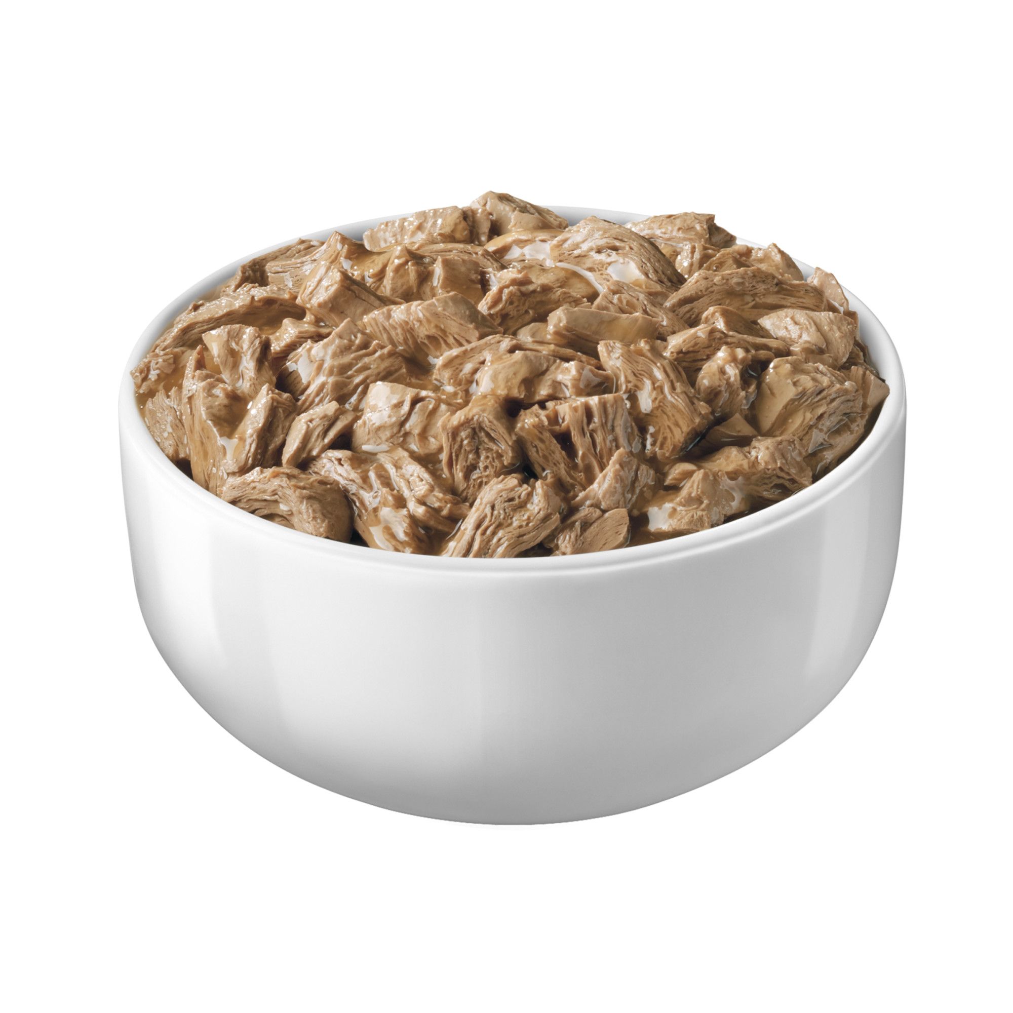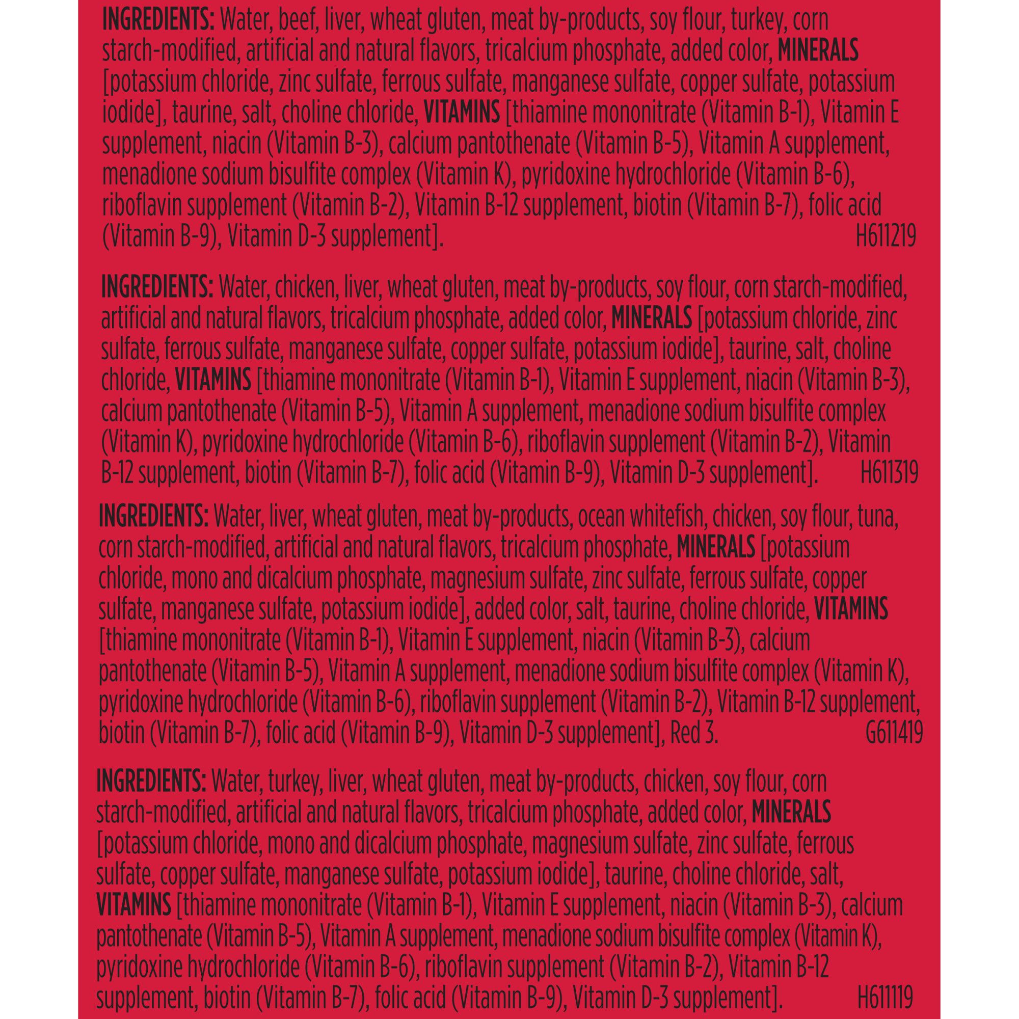 Beef in Gravy, Chicken in Gravy, Ocean Whitefish and Tuna in Sauce, and Turkey Dinner in Gravy,