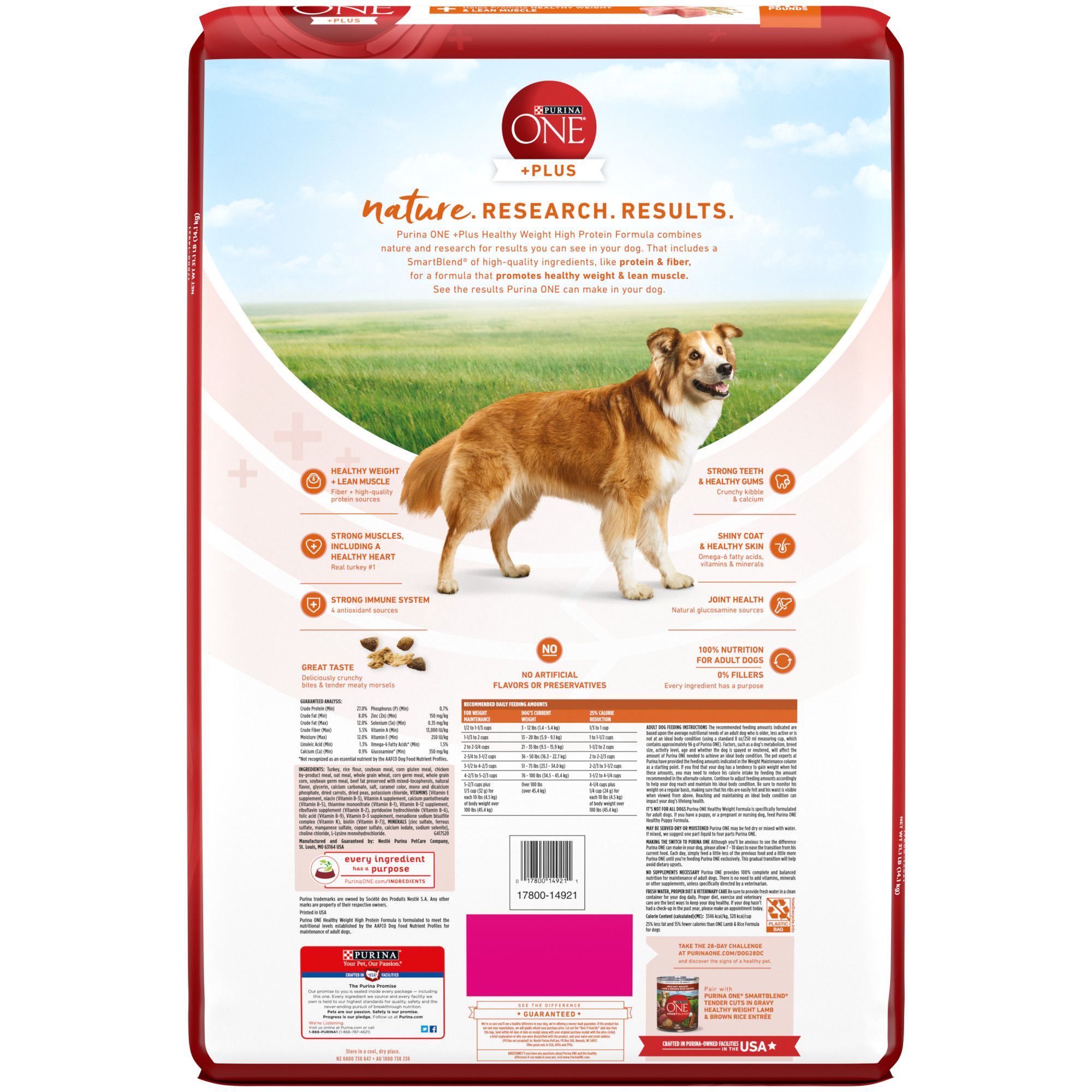 Real turkey is the primary ingredient 25% less fat, 15% fewer calories than Purina ONE SmartBlend Lamb and Rice formula Antioxidant blend to help support a strong immune system Natural sources of glucosamine Omega-6 fatty acids help support healthy skin and coat Protein-rich, tender, meaty morsels plus crunchy kibble for a taste your dog will love Includes 31.1 lb. bag