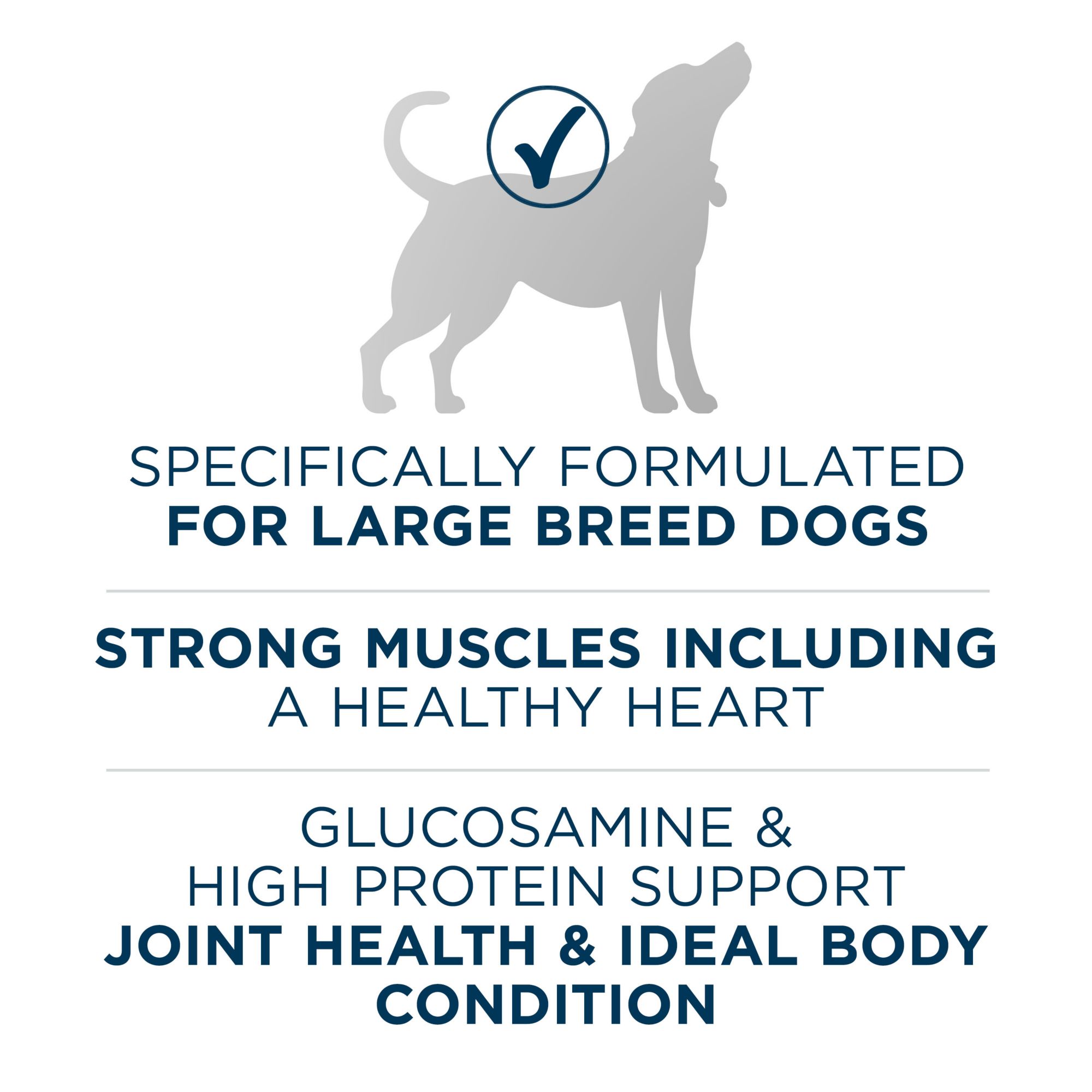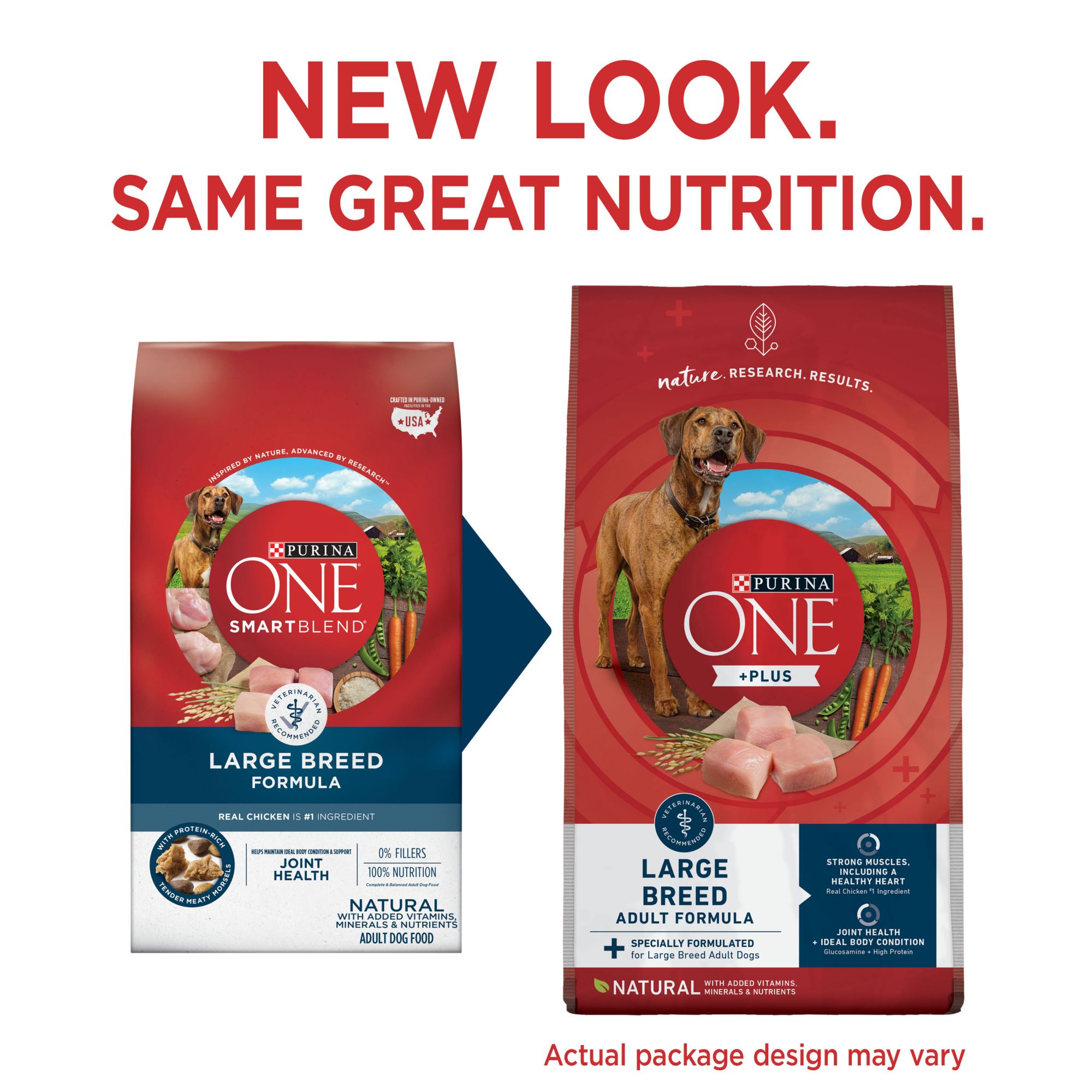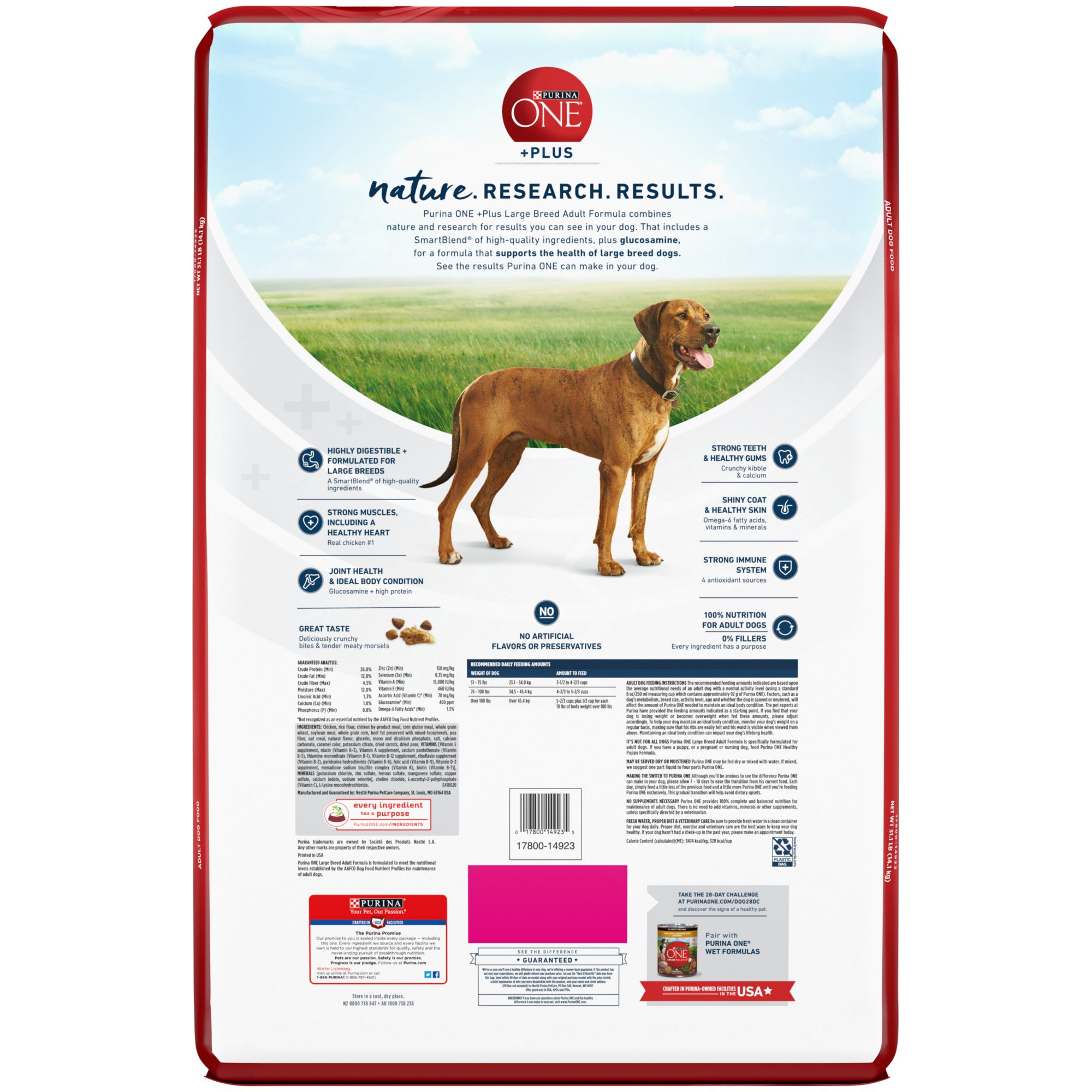 Delight your large breed dog with the wholesome goodness of Purina ONE +Plus Natural Large Breed Formula adult dry dog food. Real chicken is the number one ingredient in this delicious recipe, and the unique combination of tender, protein-rich meaty morsels and crunchy kibble delivers the tastes and textures he can't get enough of at feeding time. This premium dry dog food is formulated to help maintain their ideal body condition and joint health, so you can feel good about the food you serve them every day. High protein helps to support strong muscles, including a healthy heart. Because this dry dog food is made with zero fillers, you can rest easy knowing that every high-quality ingredient has a purpose. With 100% complete and balanced nutrition in every serving, this Purina ONE SmartBlend formula helps to support your dog's lifelong whole body health.