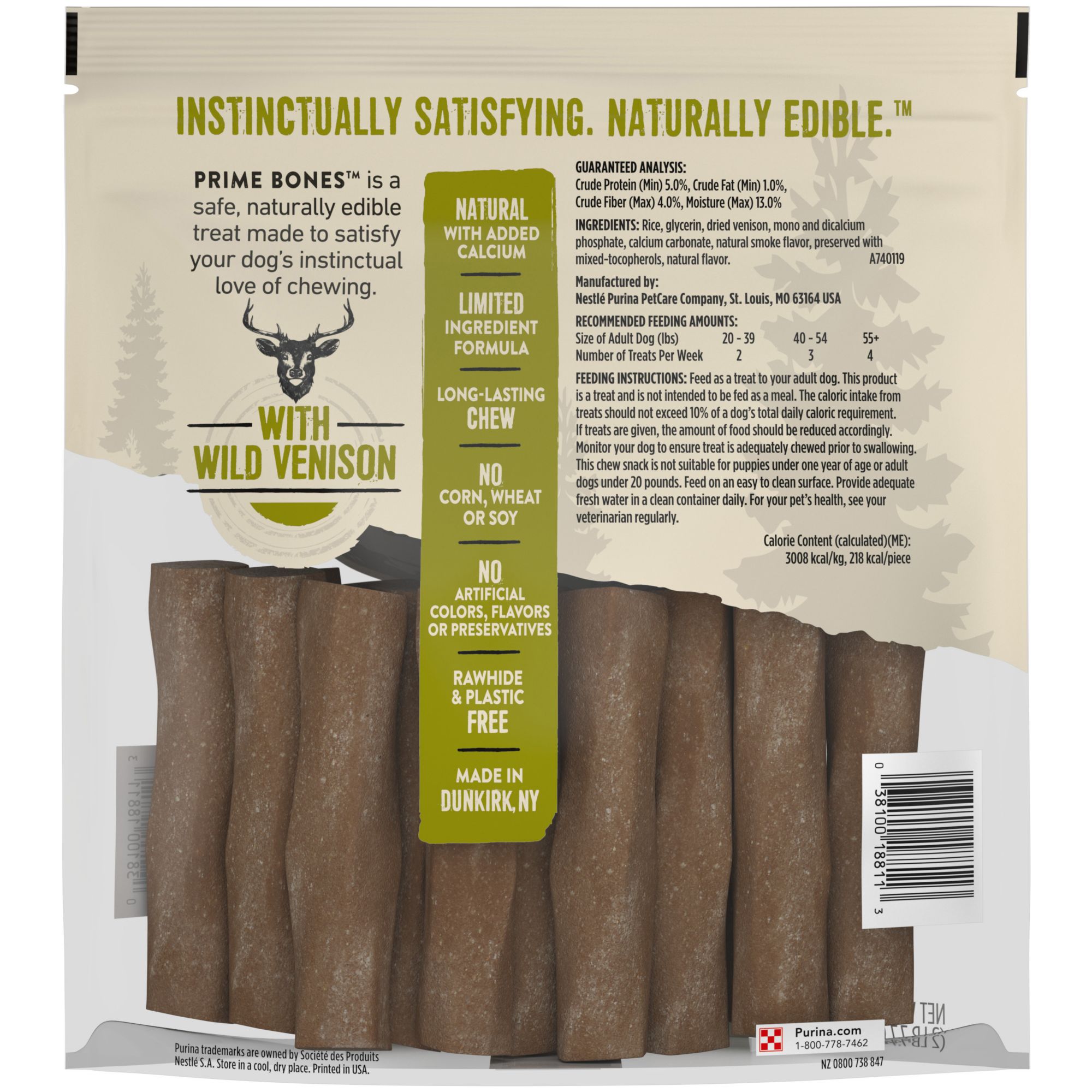 Satisfy your dog's instinctual love of chewing with Purina Prime Bones Chew Stick With Wild Venison large dog bones. These extra-long-lasting, natural dog chews with added calcium are rawhide free and provide a safe and naturally edible treat that your large dog is sure to love. Each of these limited ingredient dog treats provides extra-long-lasting enjoyment with an antler-shaped chew to keep him entertained and thinking about his next big adventure in the wild. With big, untamed flavor, these rawhide free dog chews are just the right size for your large dog to chew, giving him natural dog treats that help clean his teeth, too.