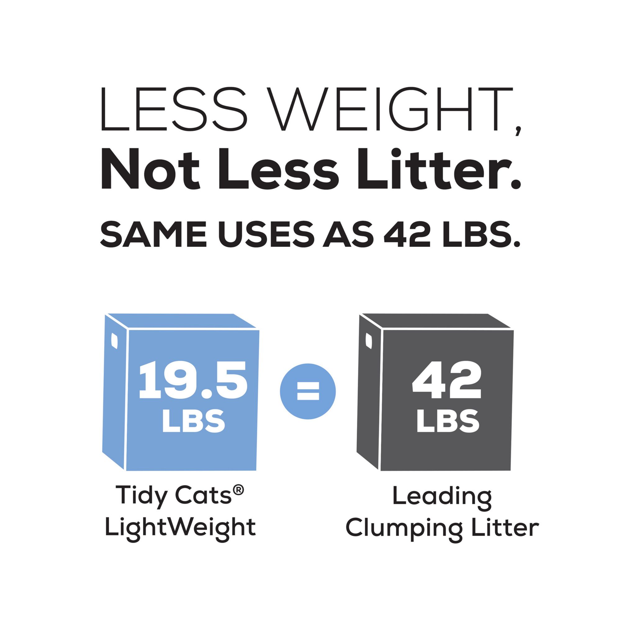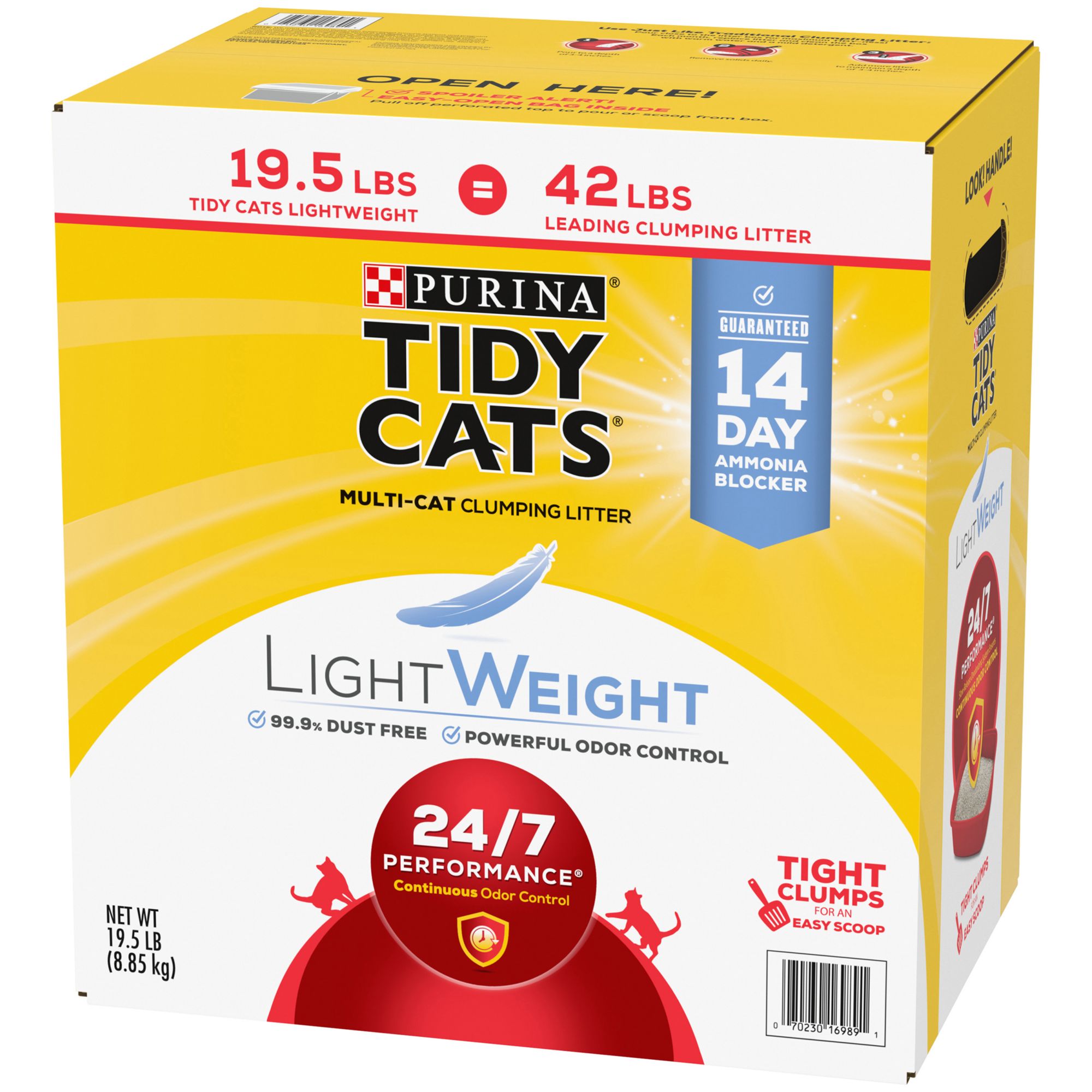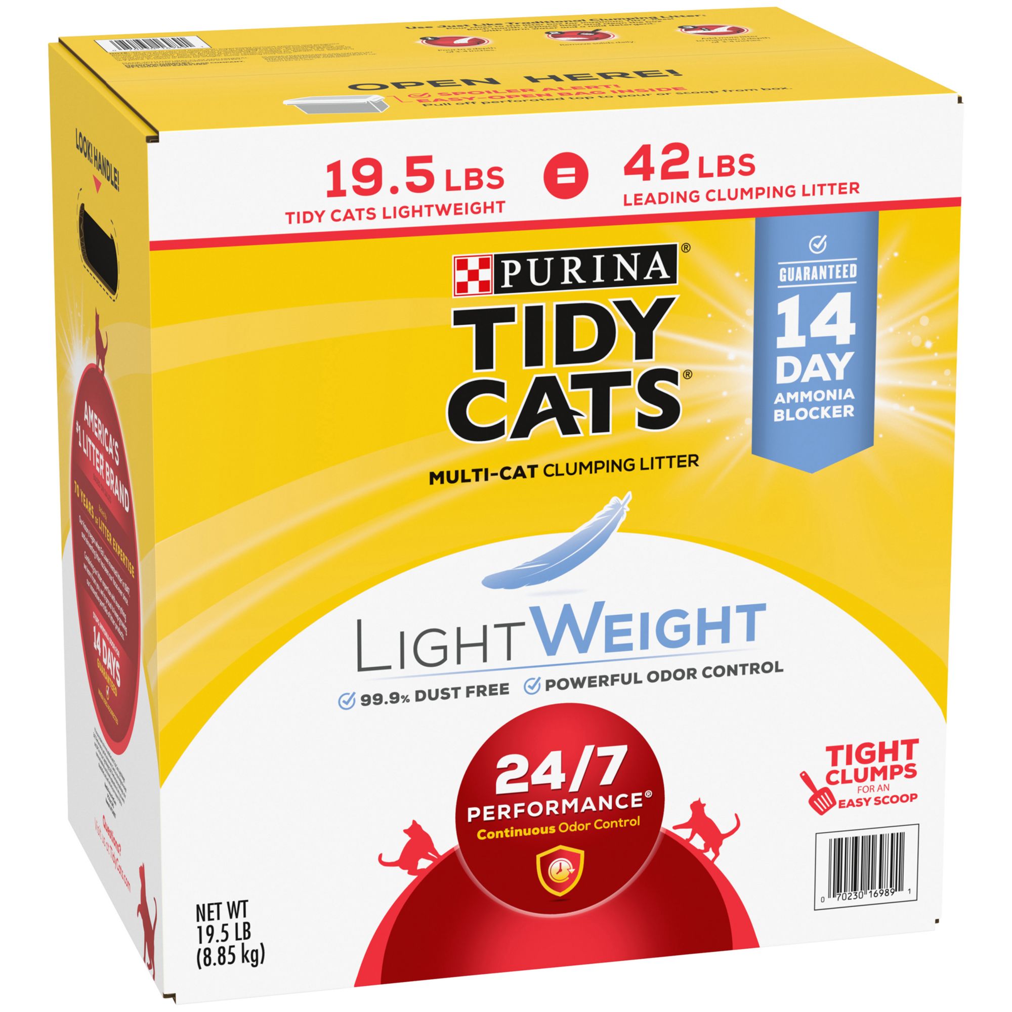 Lighten your load as you maintain your cats' litter boxes with Purina Tidy Cats LightWeight 24/7 Performance clumping litter. The powerful triple-odor protection defends your home against strong smells. The lightweight formula weighs half as much as leading clumping litter for cats, making it so easy to carry, it will have you saying, "Toss me that litter." With an added Ammonia Blocker that keeps ammonia odor from forming for at least two weeks when used as directed, this litter provides protection from lingering smells all day and all night. The strong, tight clumps allow for convenient scooping, so litter box cleaning is simple and speedy. The powerful guaranteed TidyLock protection helps lock away odors, and the low-dust formula means the litter pours cleanly into the box. This Tidy Cats clumping litter is formulated for multiple cats over the age of four to six months, keeping your home fresh, clean and ready for company even as your cats stroll about. Fill their boxes with around-the-clock odor control, and give them a tidy place to call their own.