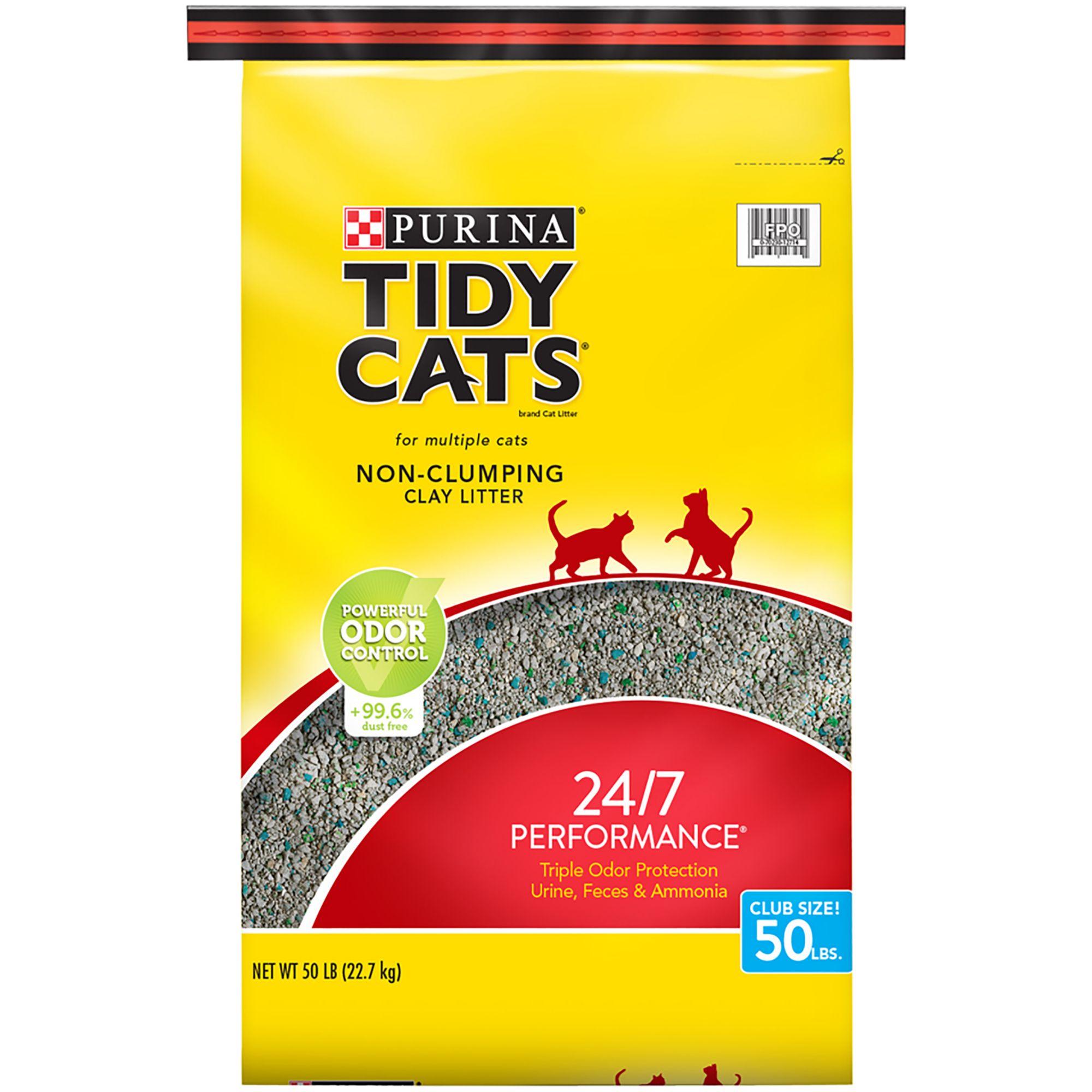 Thanks to the Purina Tidy Cats 50 Lb. 24/7 Performance Non-Clumping Clay Litter's triple odor protection, you won't have to worry about any lingering urine, feces or ammonia smells. This litter also boasts a 99.6% dust-free, non-clumping formula with low tracking.