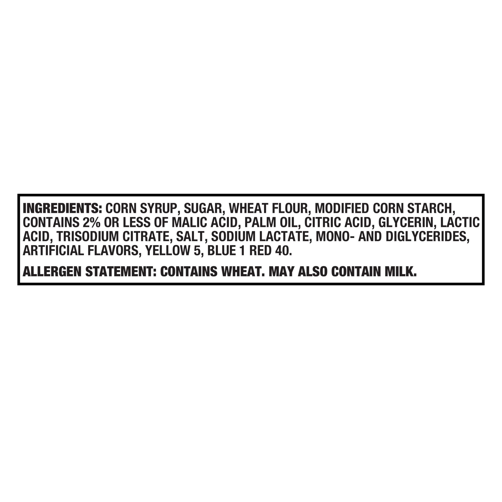 Ingredients: Blue Raspberry: Corn Syrup, Sugar, Wheat Flour, Modified Corn Starch, Contains 2% Or Less Of Malic Acid, Palm Oil, Citric Acid, Glycerin, Lactic Acid, Trisodium Citrate, Salt, Sodium Lactate, Mono- And Diglycerides, Artificial Flavors, Blue 1. Strawberry: Corn Syrup, Sugar, Wheat Flour, Modified Corn Starch, Contains 2% Or Less Of Malic Acid, Palm Oil, Citric Acid, Glycerin, Lactic Acid, Trisodium Citrate, Salt, Sodium Lactate, Mono- And Diglycerides, Artificial Flavors, Red 40. Berry Blast: Corn Syrup, Sugar, Wheat Flour, Modified Corn Starch, Contains 2% Or Less Of Malic Acid, Palm Oil, Citric Acid, Glycerin, Lactic Acid, Trisodium Citrate, Salt, Sodium Lactate, Mono- And Diglycerides, Artificial Flavors, Blue 1. Watermelon: Corn Syrup, Sugar, Wheat Flour, Modified Corn Starch, Contains 2% Or Less Of Malic Acid, Palm Oil, Citric Acid, Glycerin, Lactic Acid, Trisodium Citrate, Salt, Sodium Lactate, Mono- And Diglycerides, Artificial Flavors, Yellow 5, Blue 1.