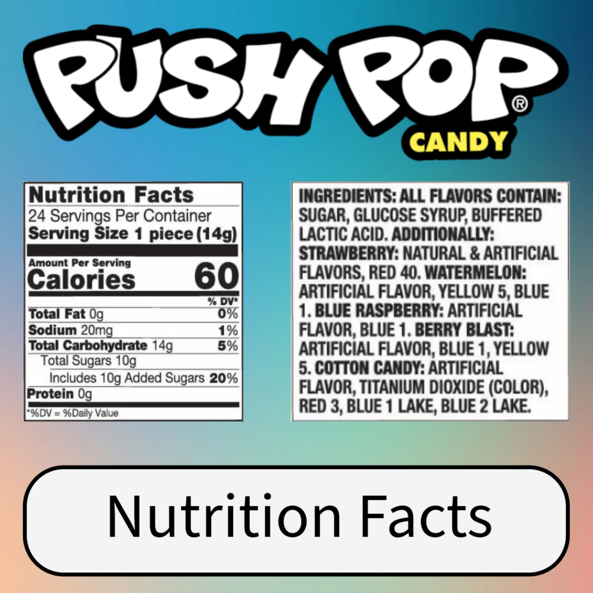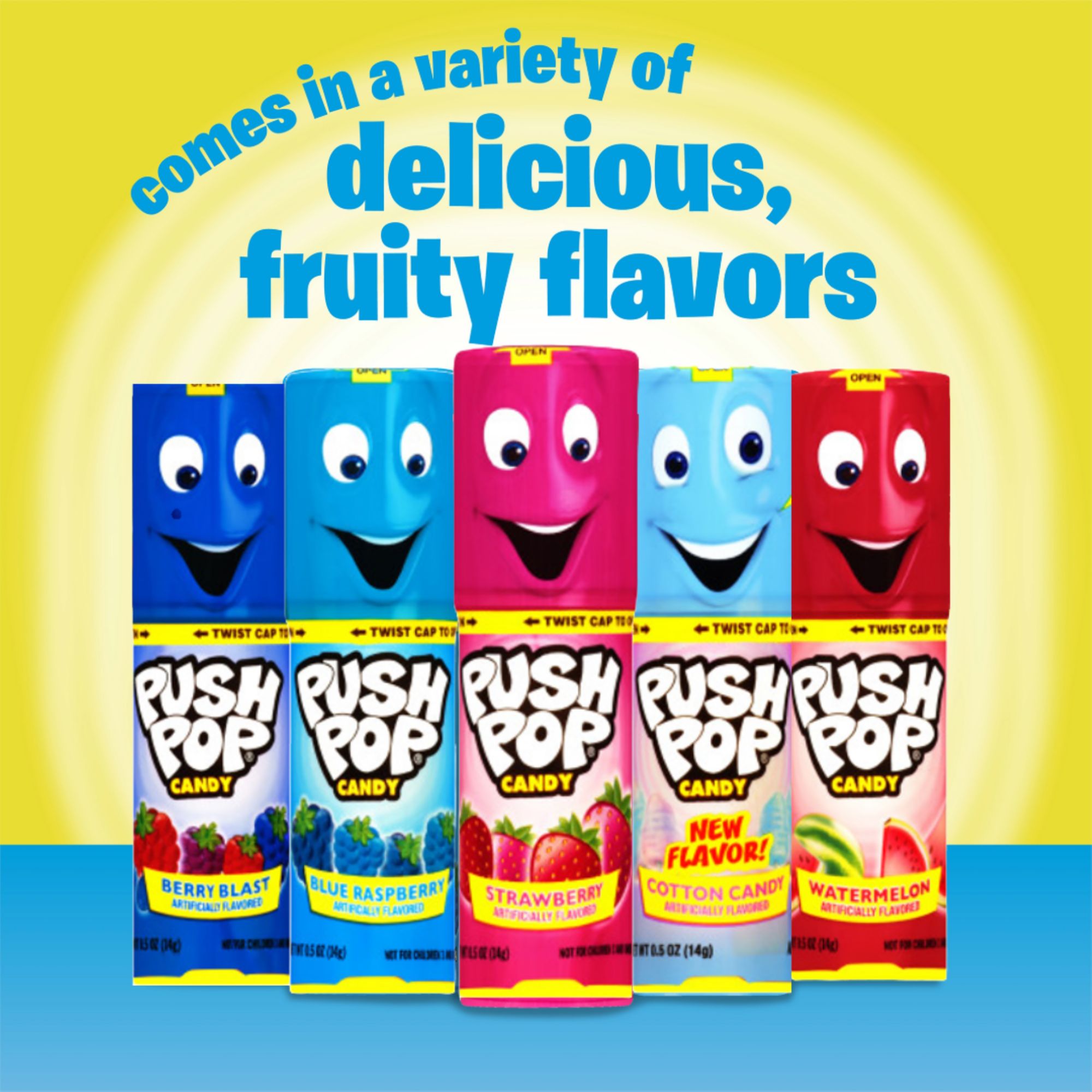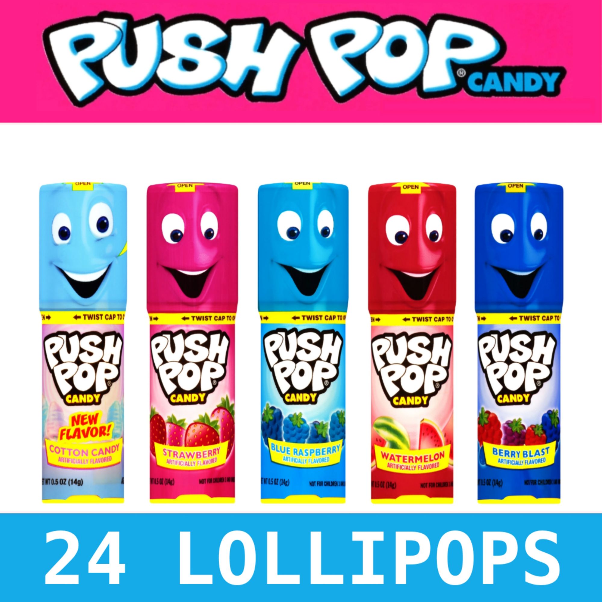 In need of a candy break? Grab a Push Pop Lollipop! Push Pop is the lollipop that lets you push the amount of delicious hard candy that you want. Simply push and enjoy! Each one comes in a rugged plastic case that has a cap with a clip so you can easily bring it with you anywhere. Eat some now and save the rest for later - wherever you go! Box includes 24 0.5 oz. Push Pop lollipops in assorted flavors. Make your candy break start now! Disclaimer: Not for children 3 and under.