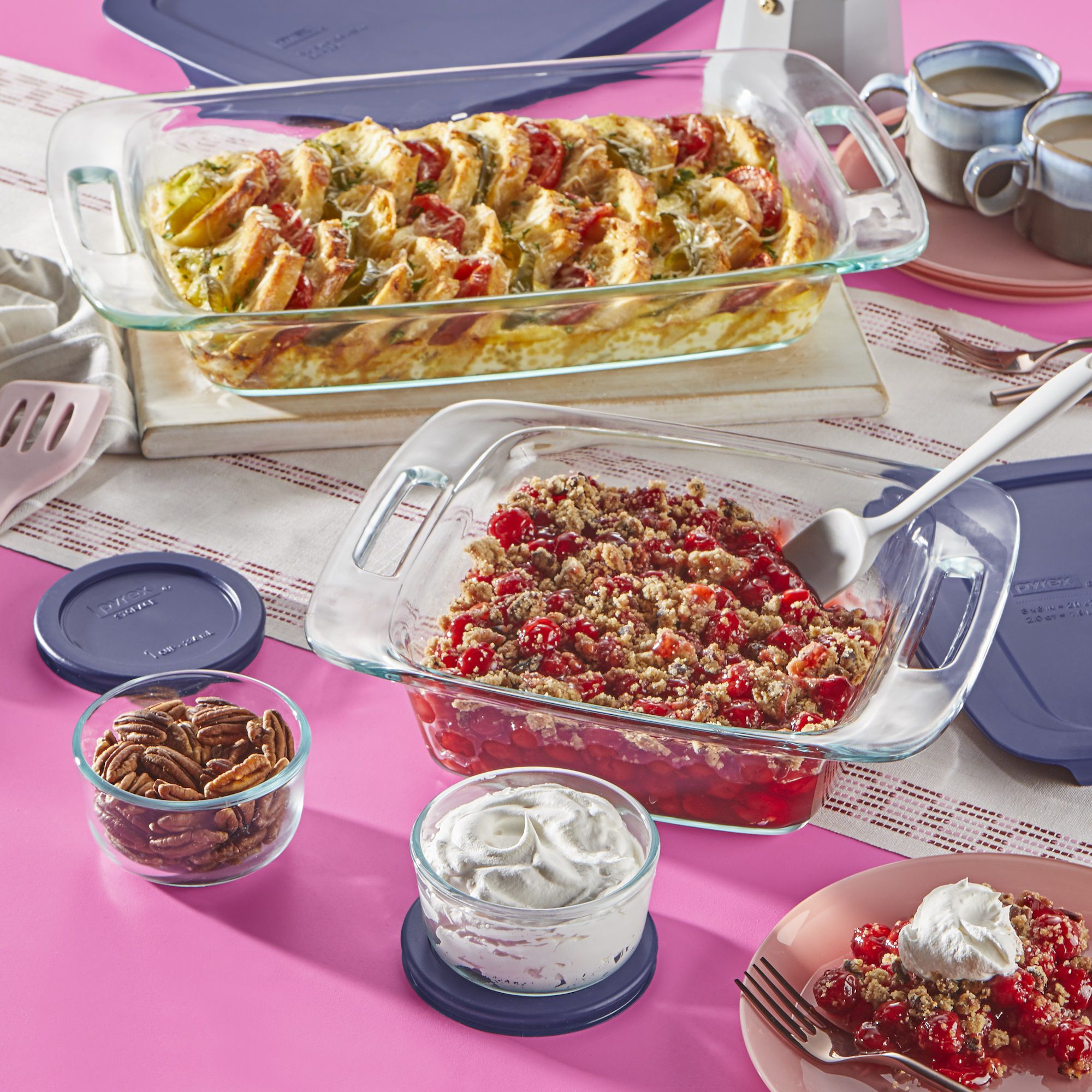 Includes (1) 3 qt. oblong easy grab glass bakeware with blue lid, (1) 8" square easy grab glass bakeware with blue lid, (2) 1 cup round glass simply store with blue lids