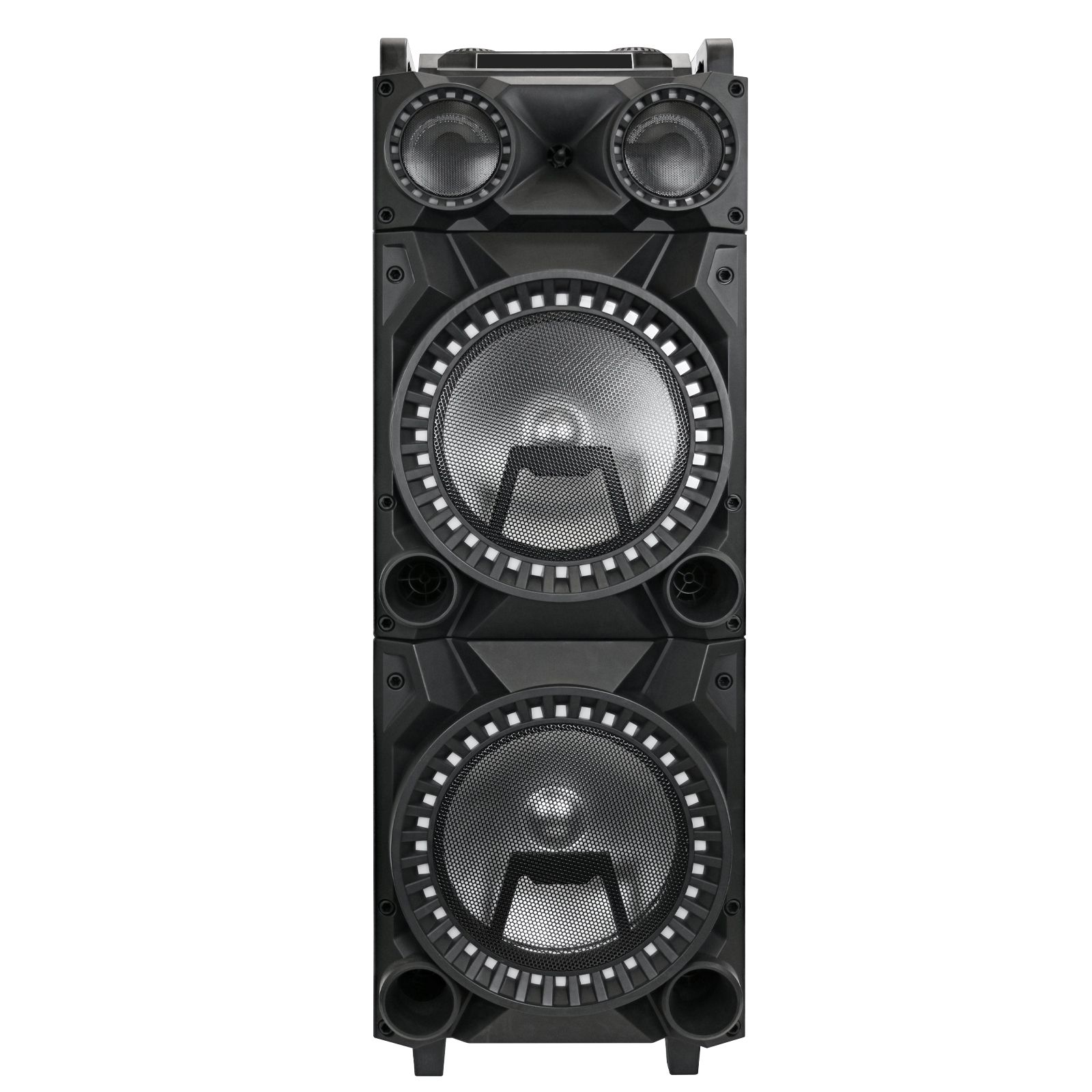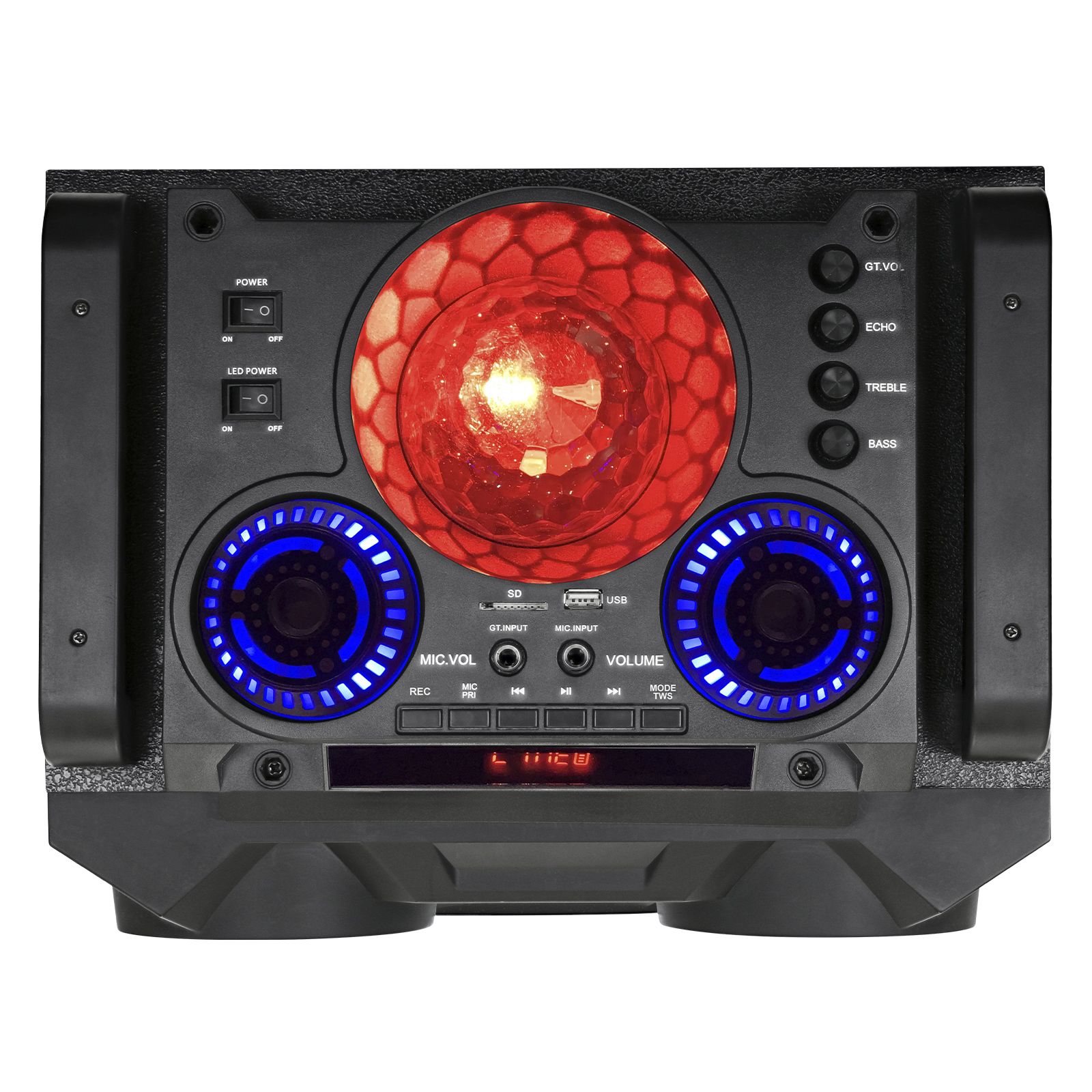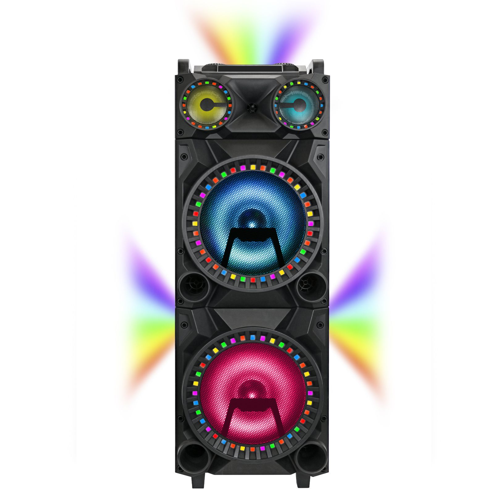 Two 12" speakers Rechargeable battery Bluetooth connection Surround lighting RCA, microphone and guitar input Handle and wheels and portability LED display USB/SD card Includes speaker
