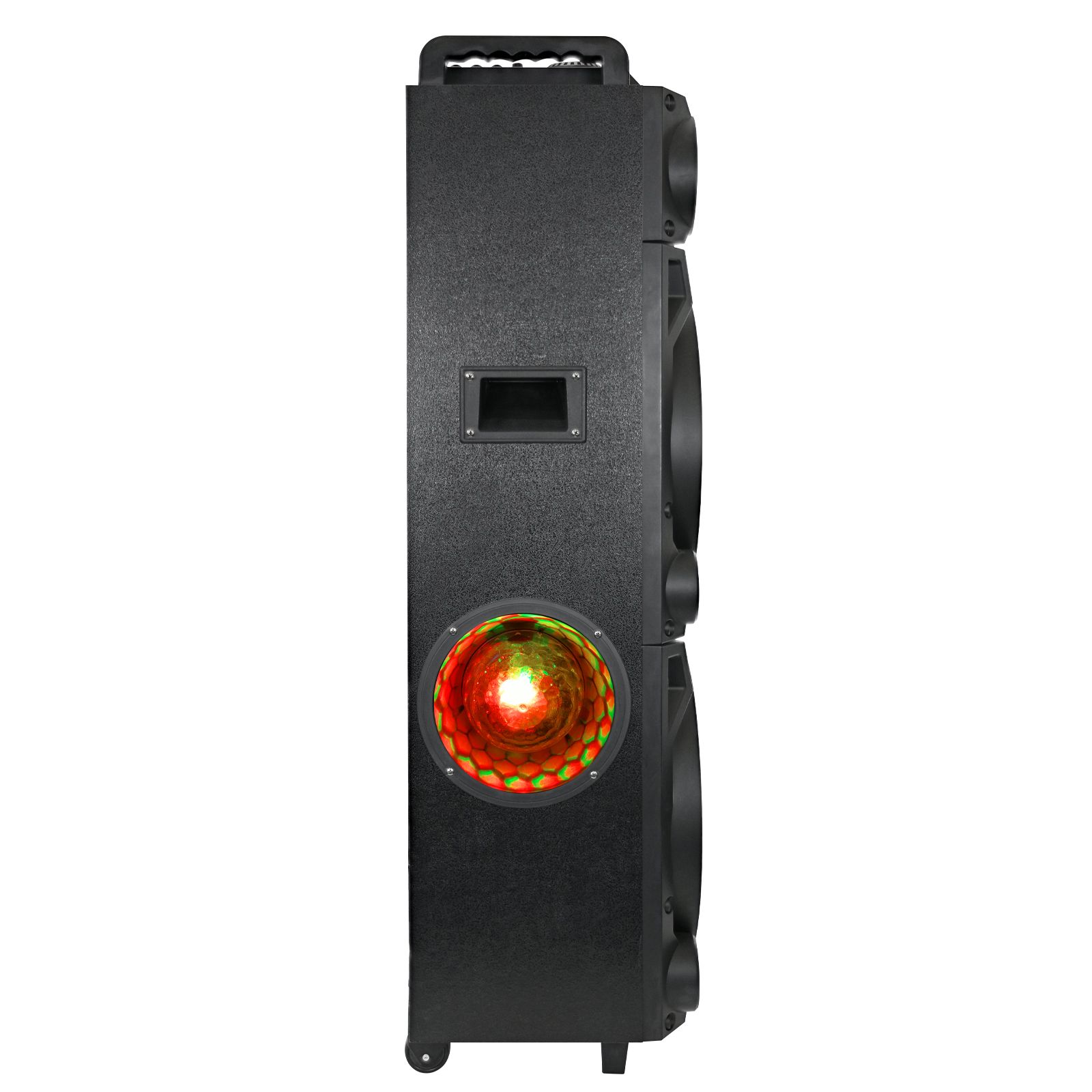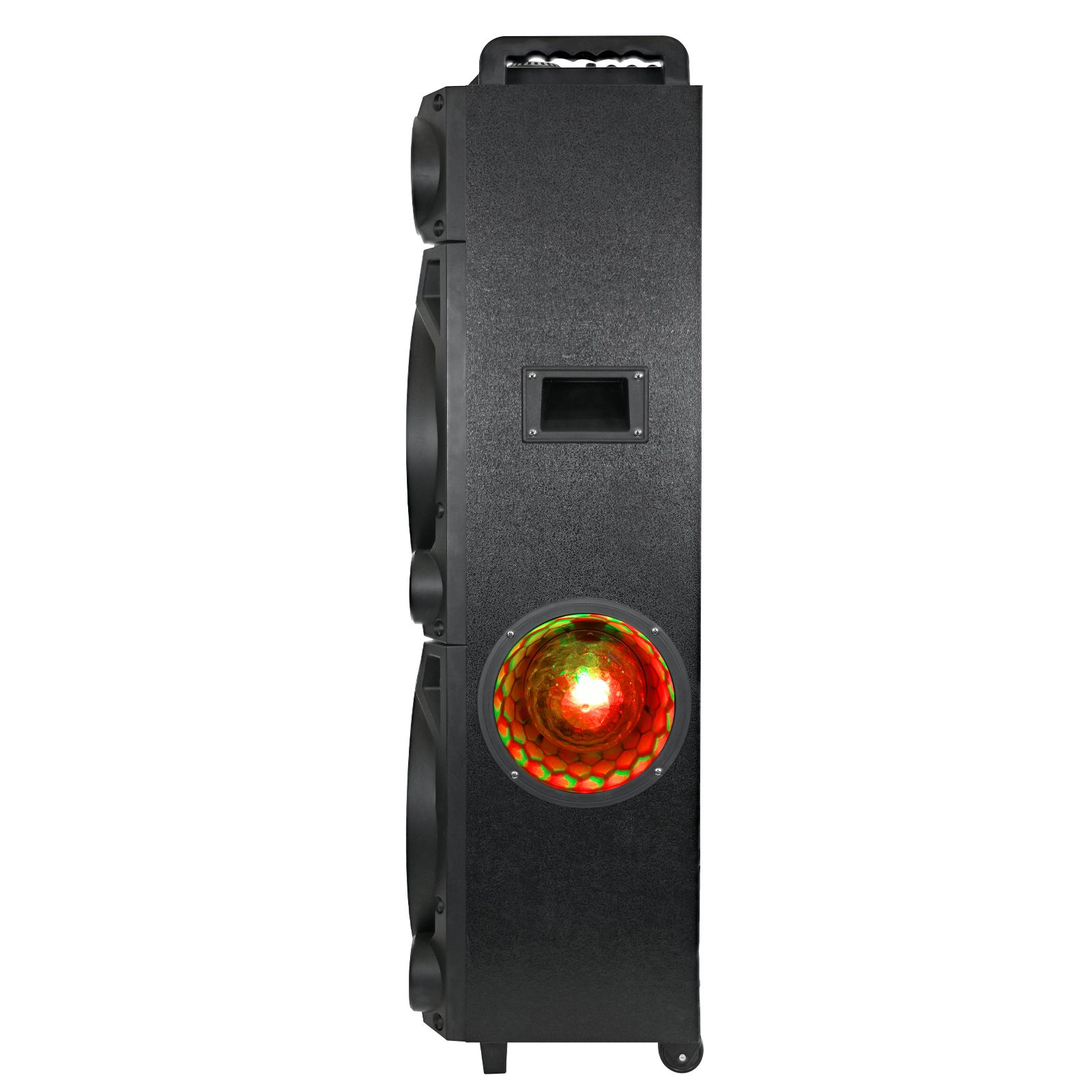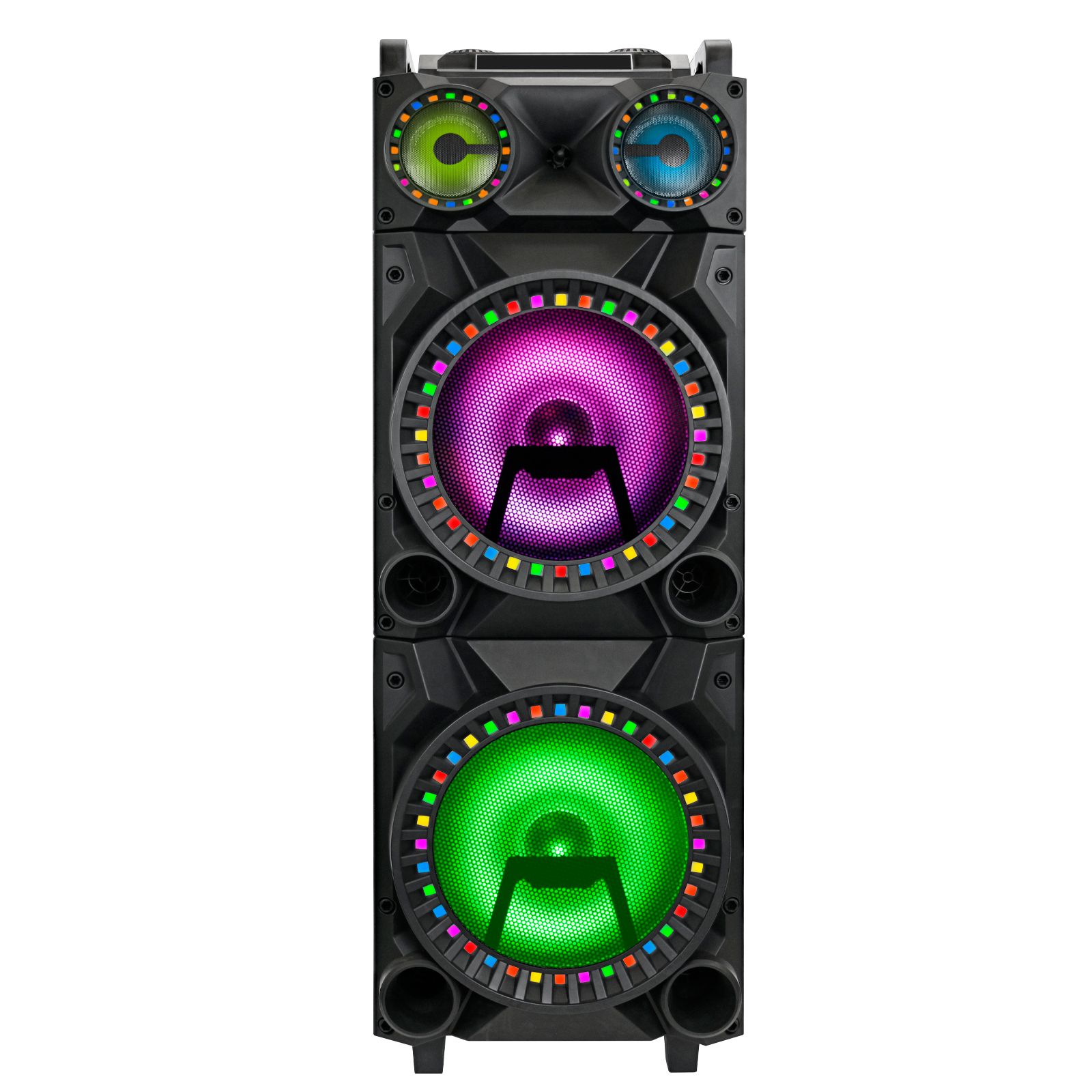 Two 12" speakers Rechargeable battery Bluetooth connection Surround lighting RCA, microphone and guitar input Handle and wheels and portability LED display USB/SD card Includes speaker