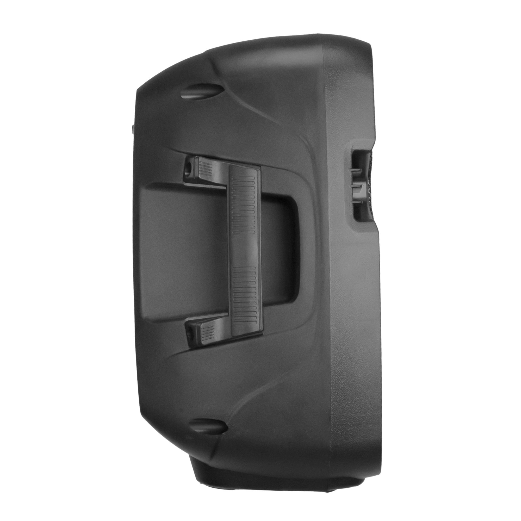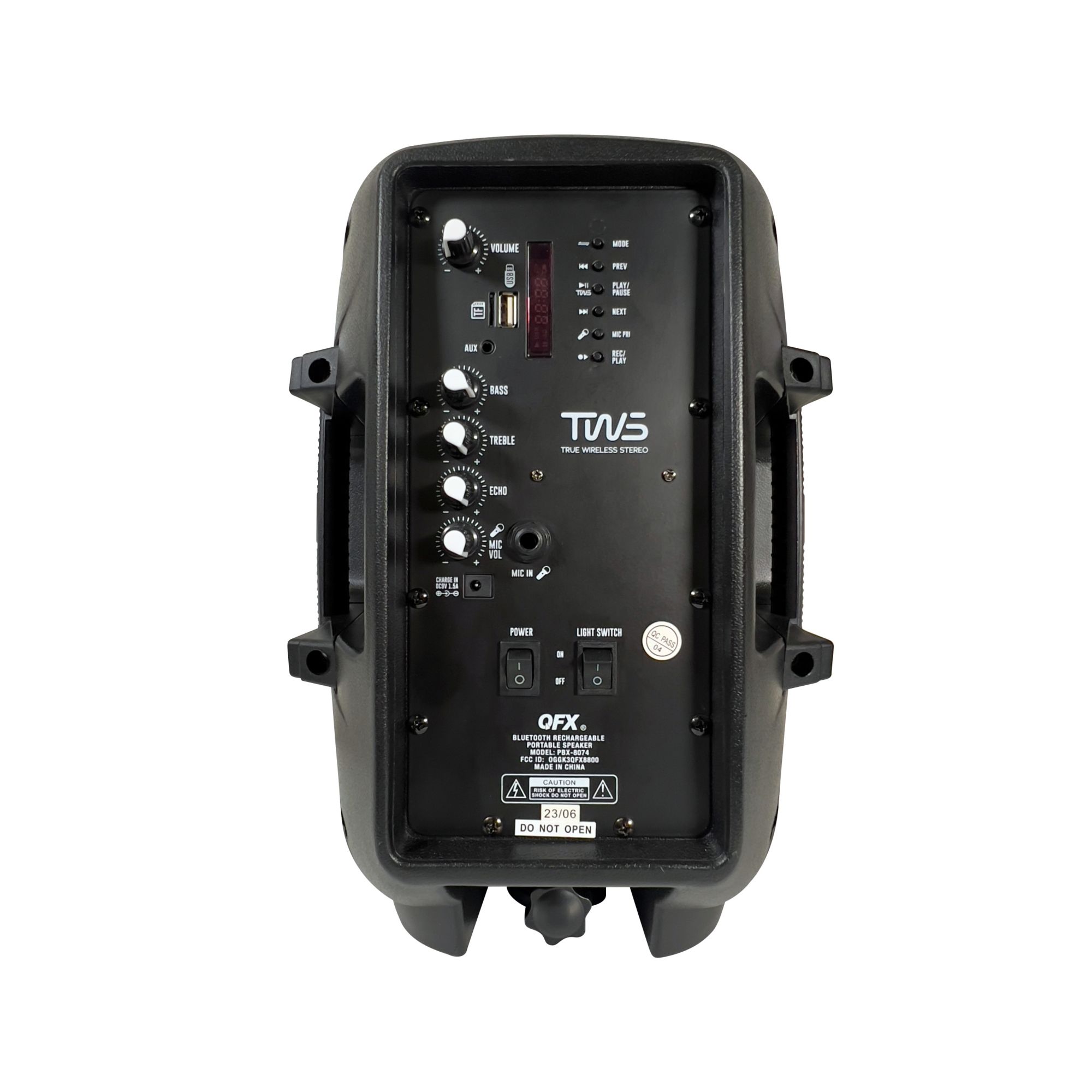 8" Bluetooth speaker with built-in handle & wired microphone Rechargeable battery Connect wireless through Bluetooth with smart device and pair 2 speakers via TWS Lightweight design and handle for easy transport Average charge lasts 6-8 hours FM radio Liquid motion lights in speaker Microphone and Aux-in input USB/TF card ports Includes 8" Speaker, Wired Microphone, User Manual, Power Cord, Aux-In Cable, Warranty Card and Remote Control