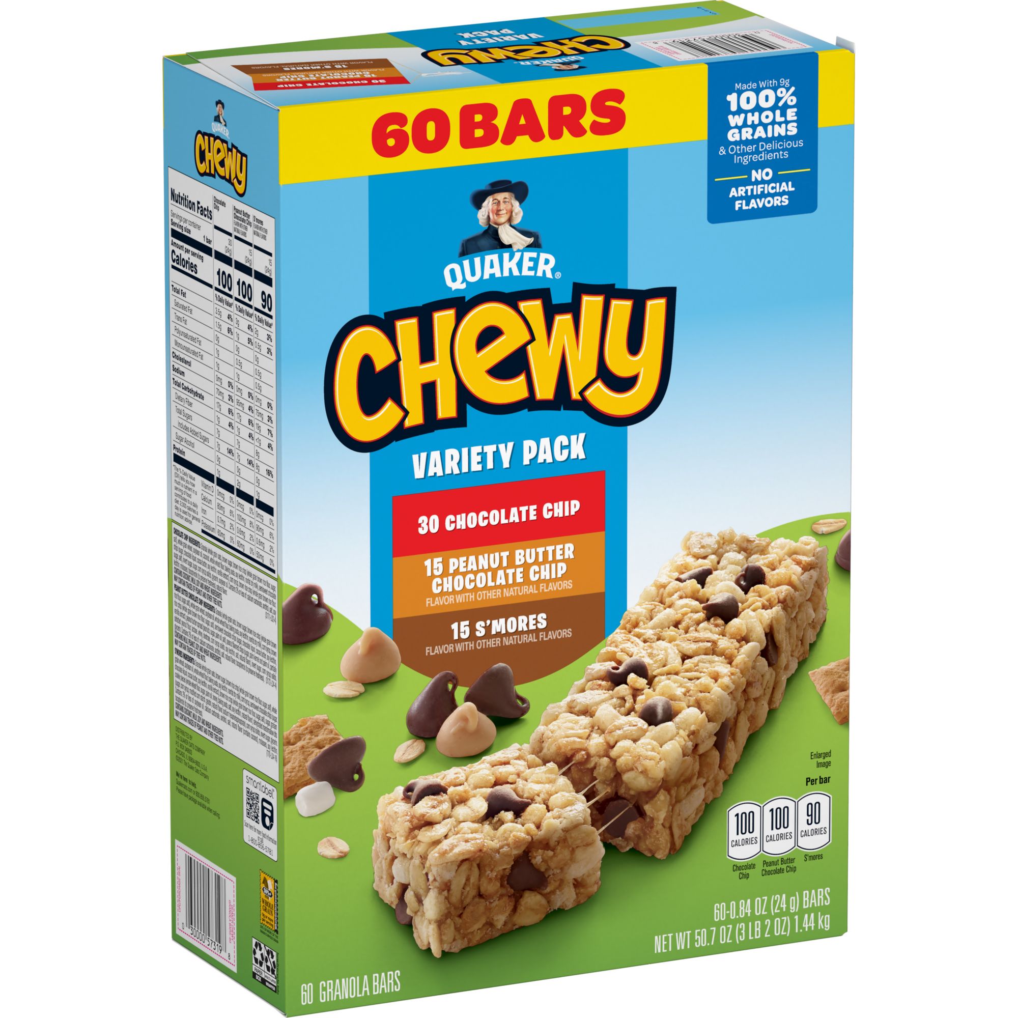 Includes 30 chocolate chip, 15 s'mores, and 15 peanut butter chocolate chip Quaker Chewy granola bars
