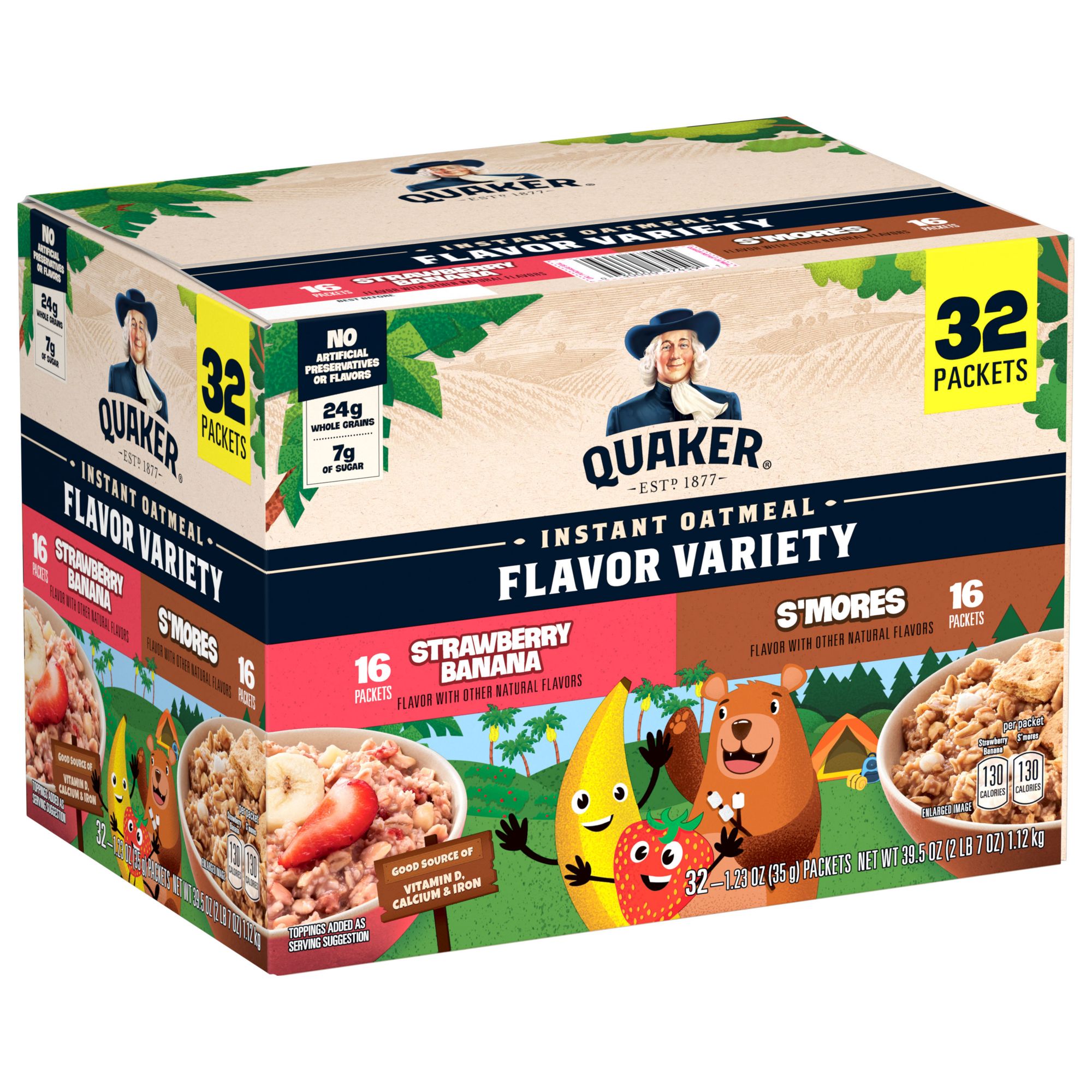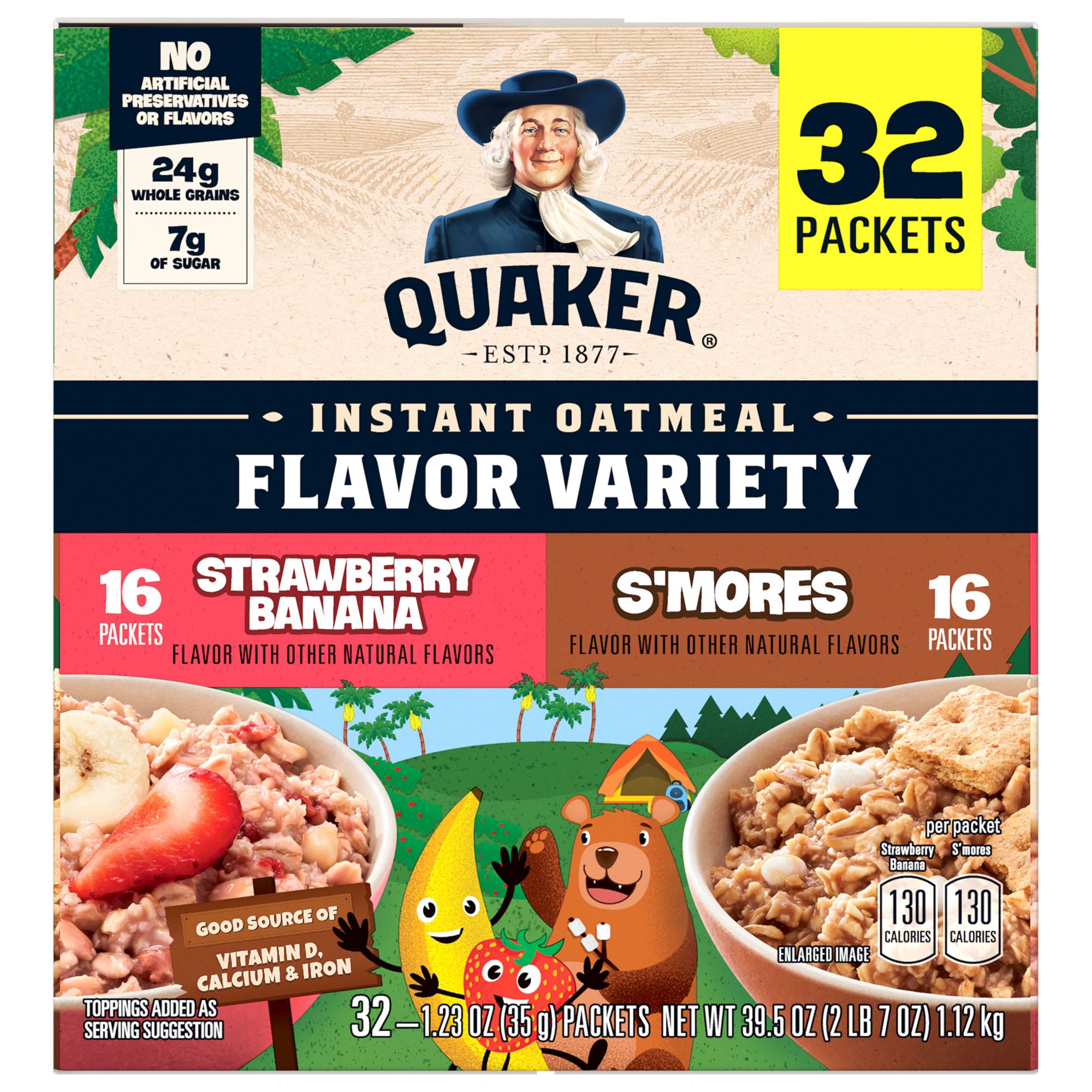A quick and easy option for those busy mornings, the Quaker Instant Oatmeal Variety Pack only takes two minutes or less to cook. Just pick one of the 32 packets and prepare it in the microwave. This variety pack includes two kid-friendly flavors. Choose from Strawberry Banana and S'mores flavored instant oatmeal for a warm, delicious start to the day.