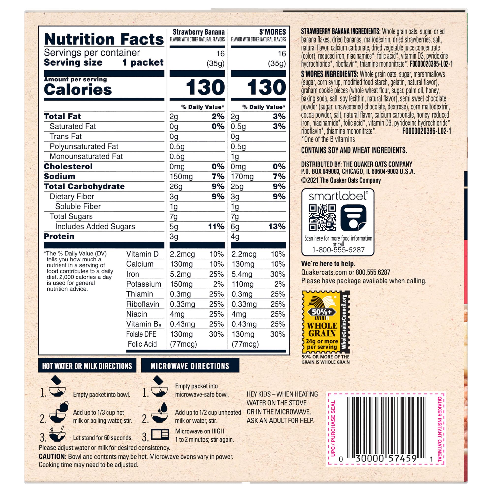 Cooks easily and quickly in the microwave Ready and warm in two minutes or less Includes two kid-friendly flavors - strawberry Banana and S'mores No artificial preservatives or flavors 24g whole grains Includes 32 packets of Quaker instant oatmeal - 16 strawberry banana flavor and 16 S'mores flavor