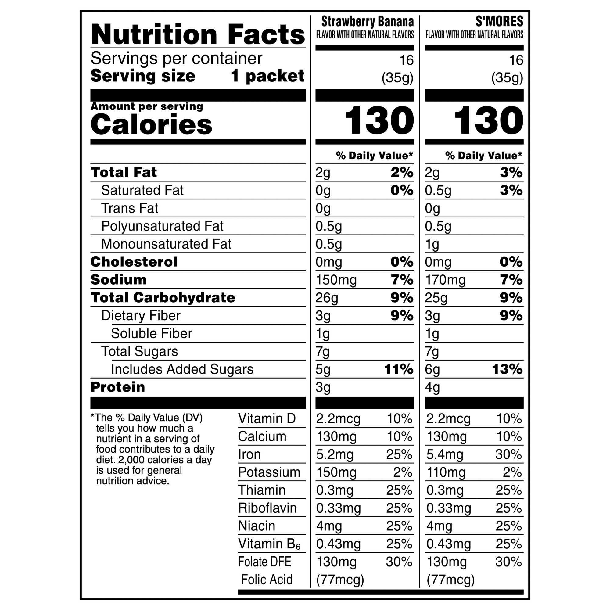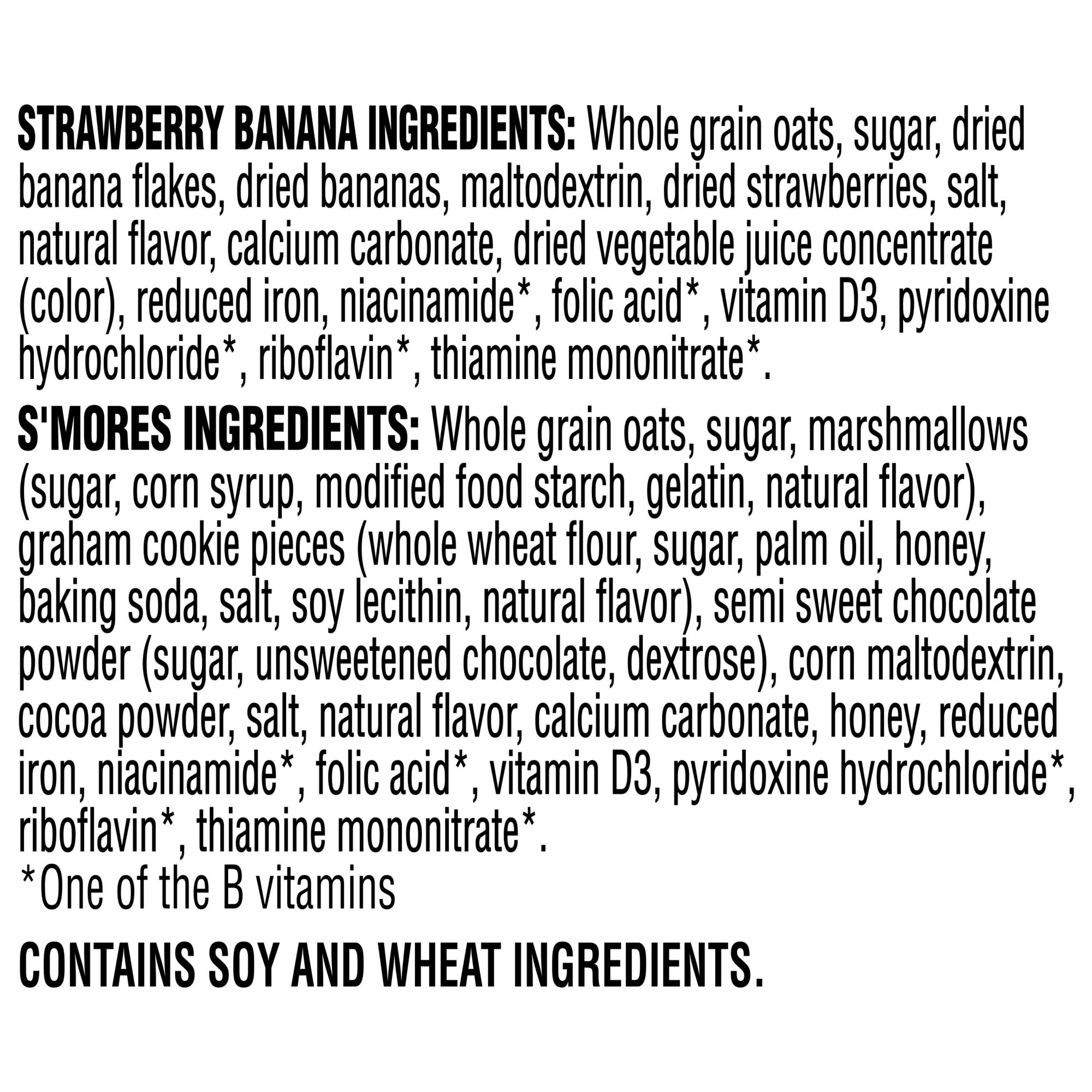 Strawberry Banana Flavor Instant Oatmeal - Whole Grain Oats, Sugar, Dried Banana Flakes, Dried Bananas, Maltodextrin, Dried Strawberries, Salt, Natural Flavor, Calcium Carbonate, Dried Vegetable Juice Concentrate (Color), Reduced Iron, Niacinamide*, Folic Acid*, Vitamin D3, Pyridoxine Hydrochloride*, Riboflavin*, Thiamine Mononitrate*. *one of the B Vitamins S'mores Flavor Instant Oatmeal - Whole Grain Oats, Sugar, Marshmallows (Sugar, Corn Syrup, Modified Food Starch, Gelatin, Natural Flavor), Graham Cookie Pieces (Whole Wheat Flour, Sugar, Palm Oil, Honey, Baking Soda, Salt, Soy Lecithin, Natural Flavor), Semi-Sweet Chocolate Powder (Sugar, Unsweetened Chocolate, Dextrose), Corn Maltodextrin, Cocoa Powder, Salt, Natural Flavor, Calcium Carbonate, Honey, Reduced Iron, Niacinamide*, Folic Acid*, Vitamin D3, Pyridoxine Hydrochloride*, Riboflavin*, Thiamine Mononitrate*.*One of the B Vitamins Contains Soy and Wheat Ingredients.