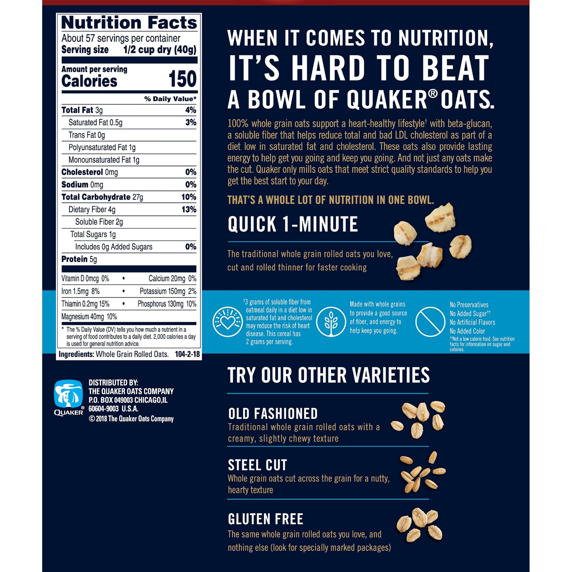 Don't have a lot of time in the mornings? There's always time for Quaker Oats 40 Oz. 100% Natural Whole-Grain Quick 1-Minute Oats. Ready in just 1 minute, you'll have a warm, healthy breakfast before you know it. Customize the flavor by adding fruit, nuts or cinnamon on top.