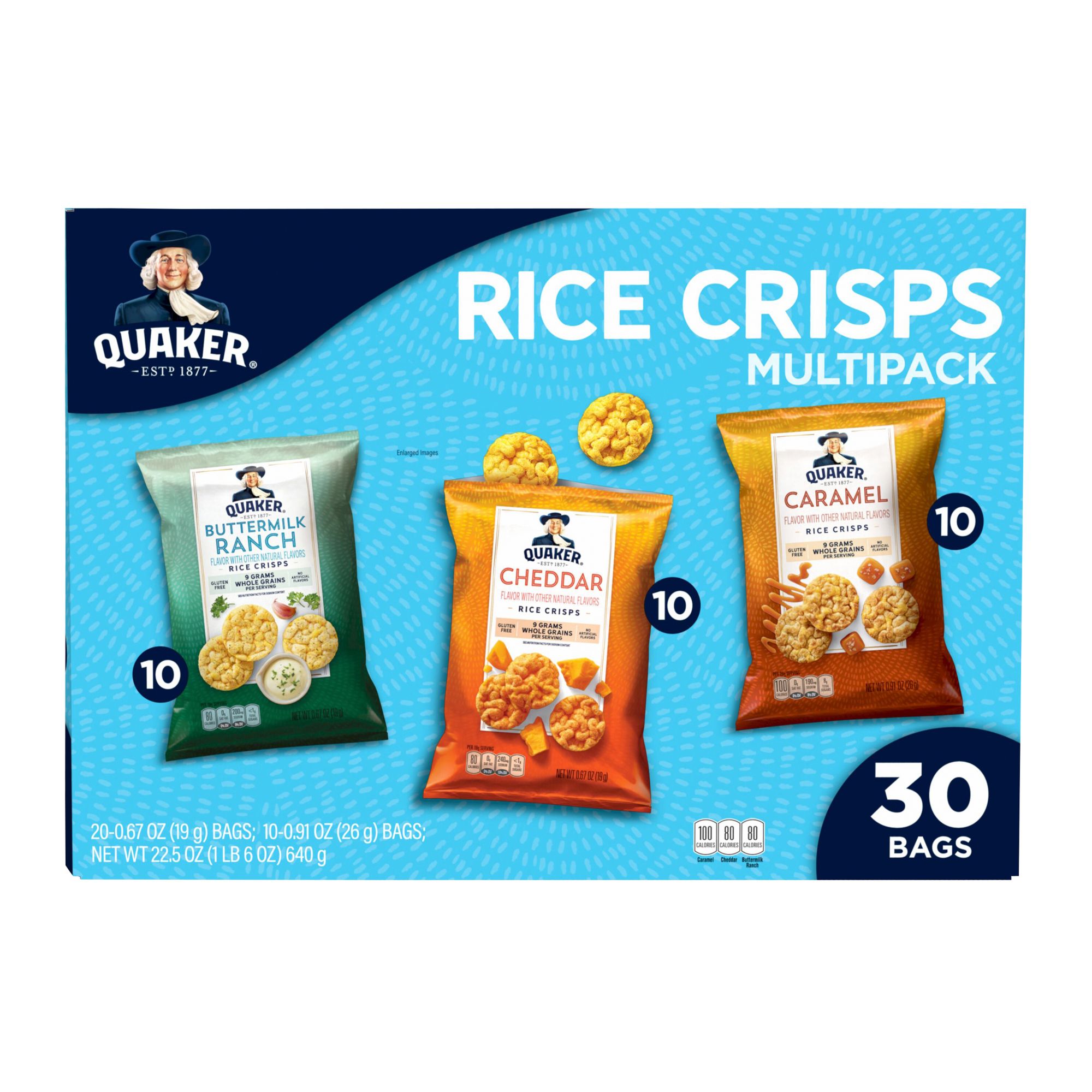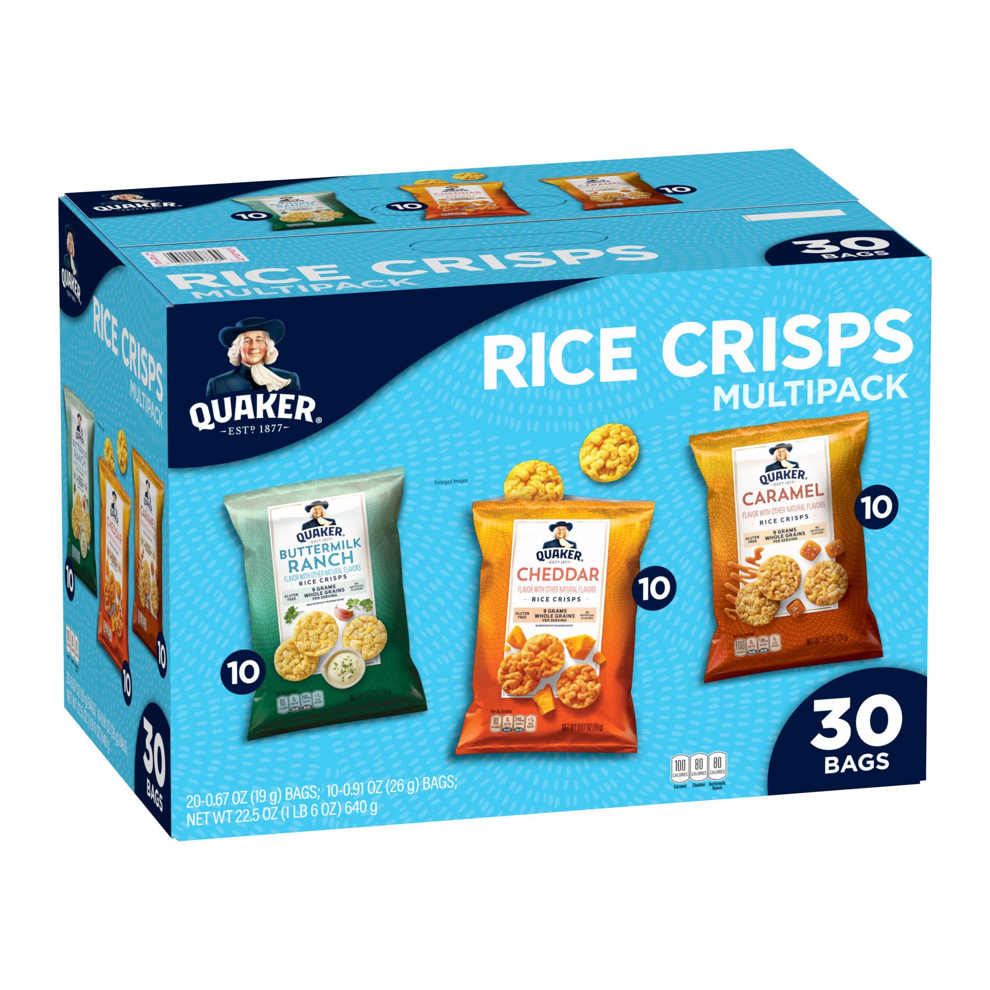 Includes variety pack of rice crisps snacks, 30 ct.