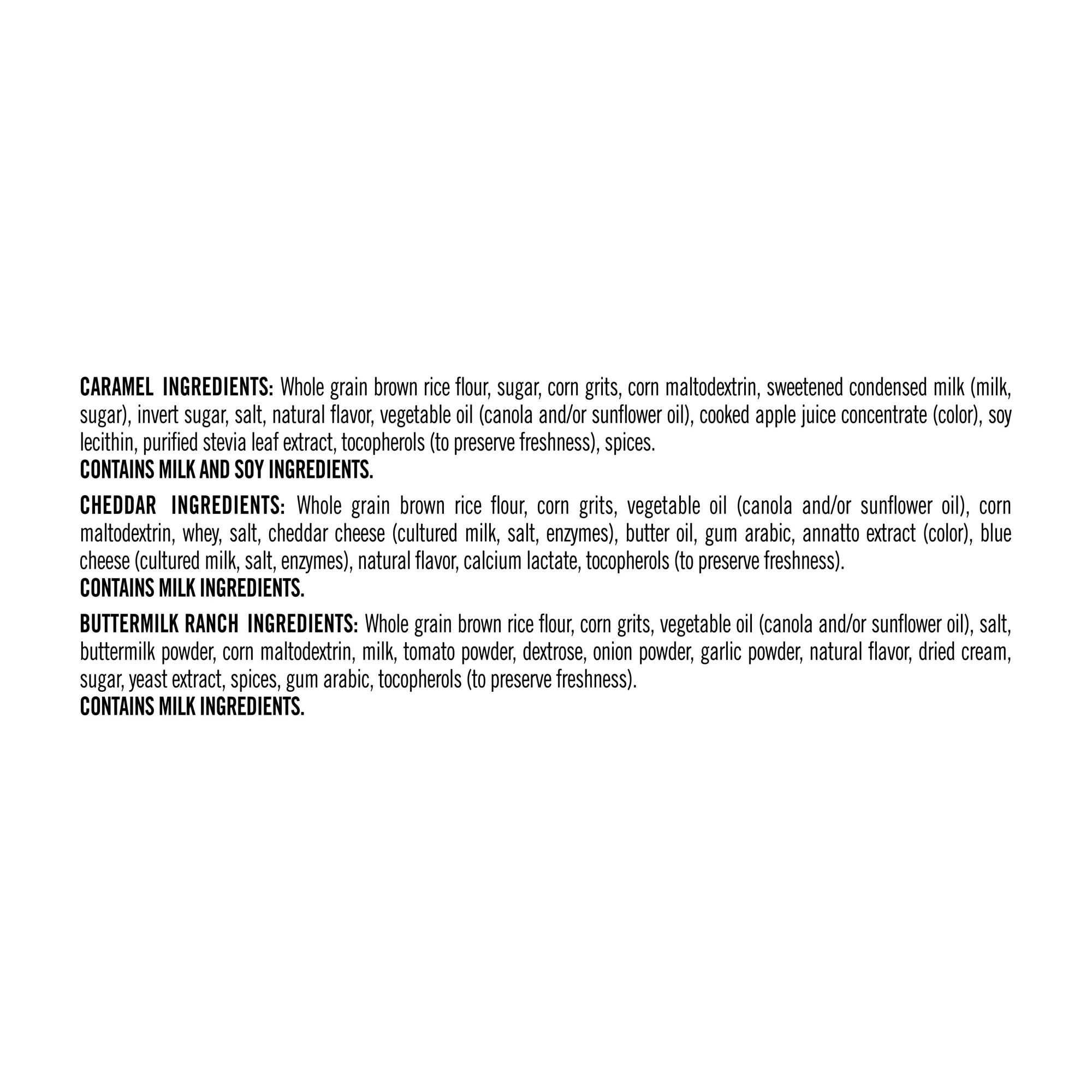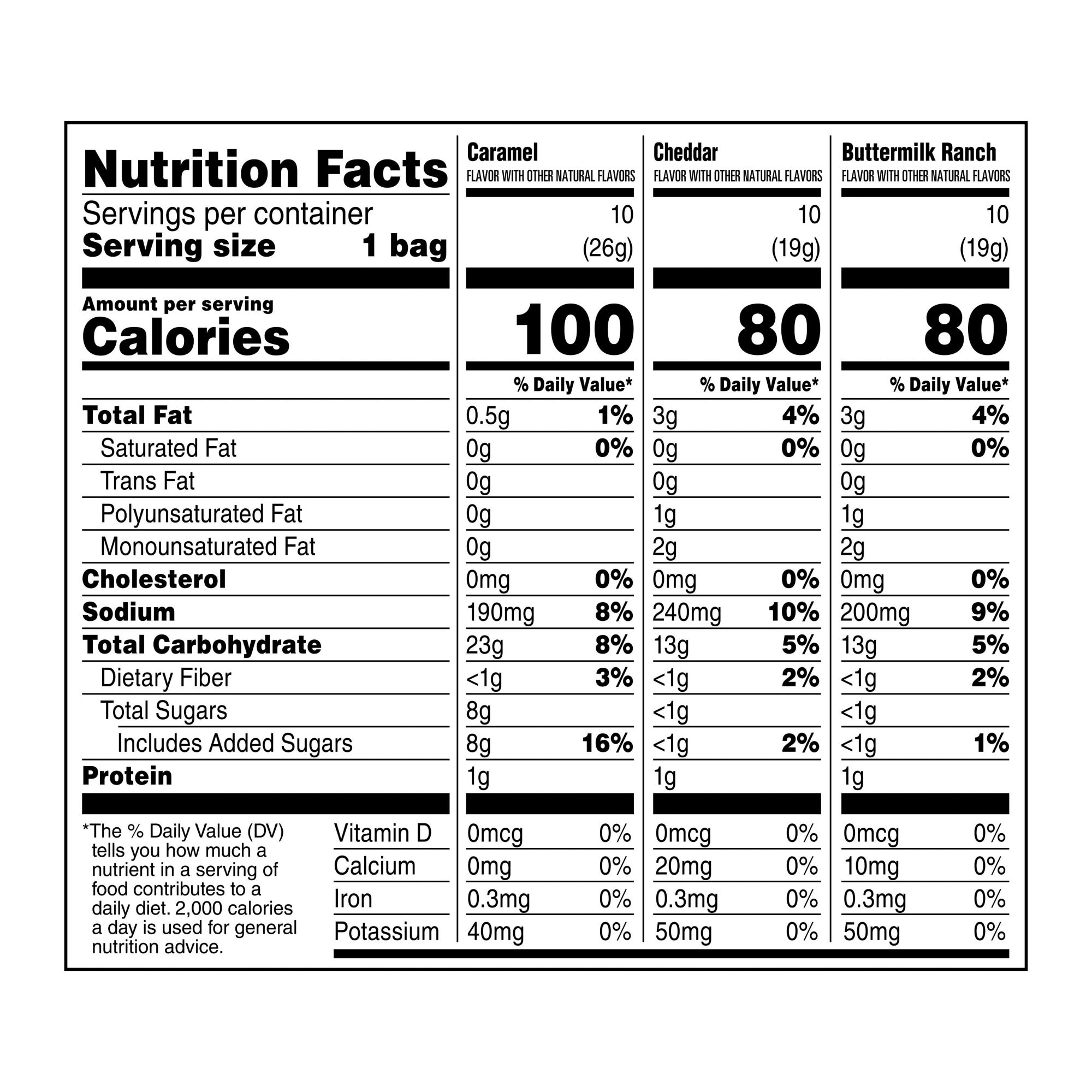 Variety pack includes 10 Buttermilk Ranch flavor, 10 Cheddar flavor, and 10 Caramel flavor