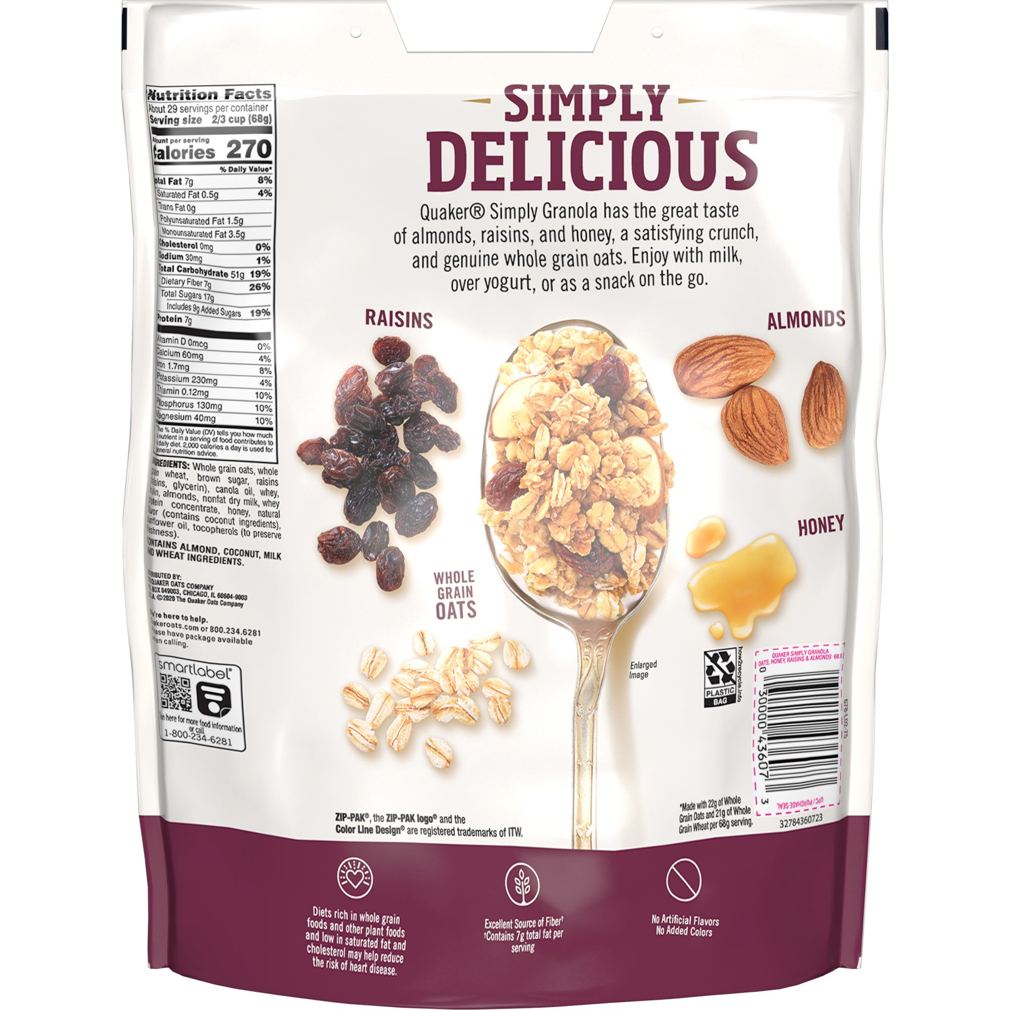 Get 5g of protein and fiber with each serving of Quaker Simply Granola Oats 34.5 Oz. Honey, Raisins and Almonds Cereal. Add it to a bowl of milk, or snack on it throughout the day for a hearty dose of whole grain oats.