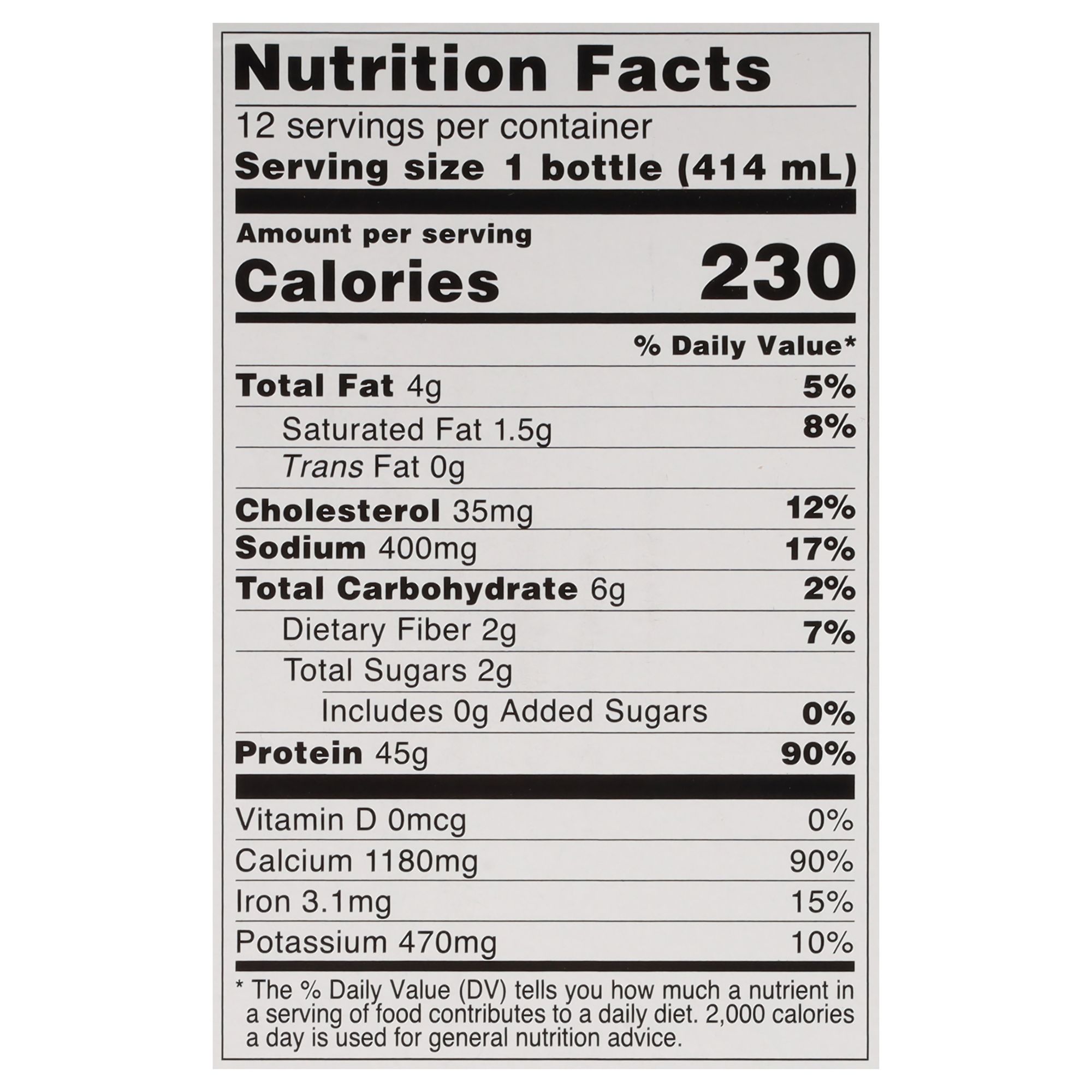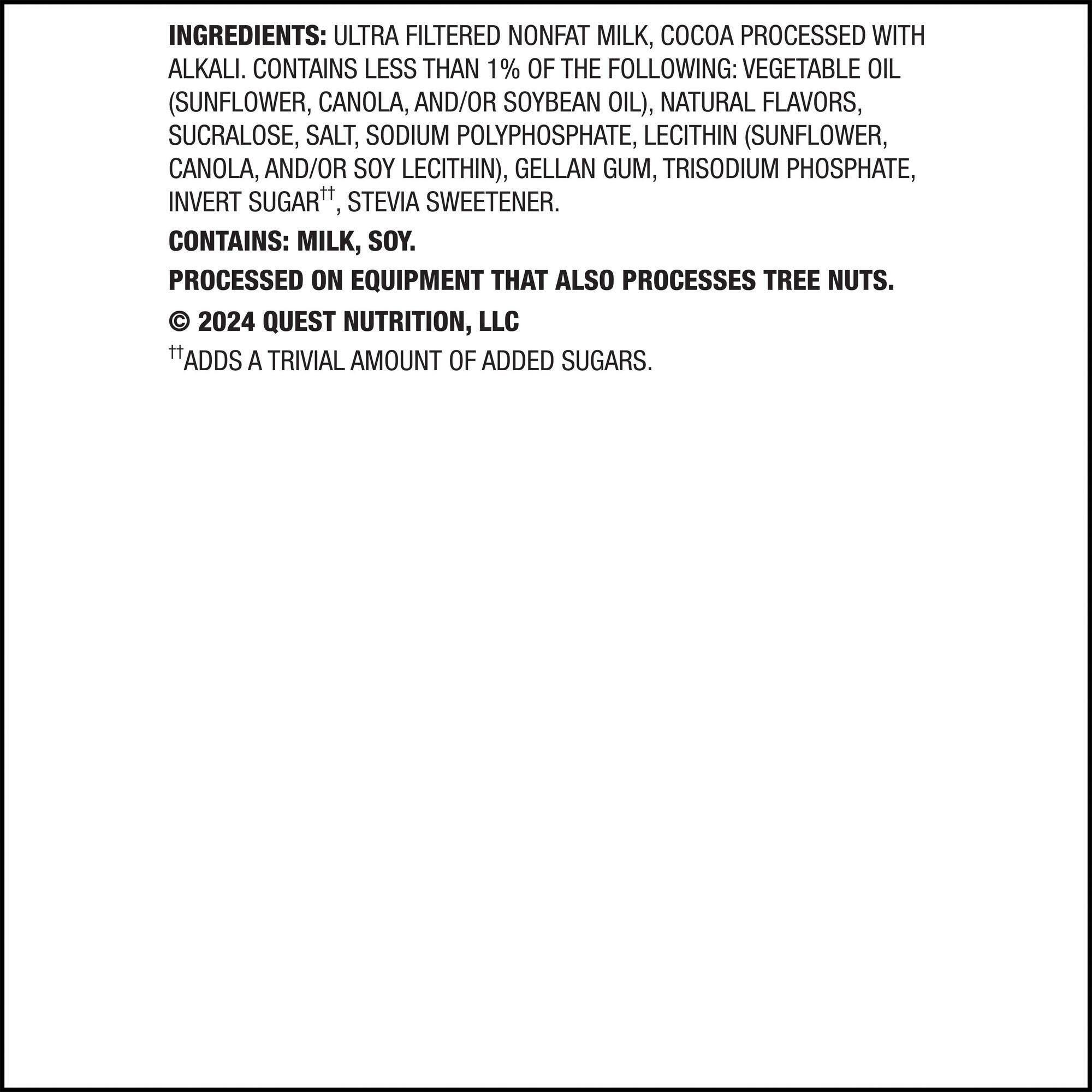 Ingredients: Ultra Filtered Nonfat Milk, Cocoa Processed with Alkali, Contains Less than 1% of the Following: Vegetable Oil (Sunflower, Canola, and/or Soybean Oil), Natural Flavors, Sucralose, Salt, Sodium Polyphosphate, Lecithin (Sunflower, Canola, and/or Soy Lecithin), Gellan Gum, Trisodium Phosphate, Invert Sugar(a), Stevia Sweetener, (a) Adds a Trivial Amount of Added Sugars.