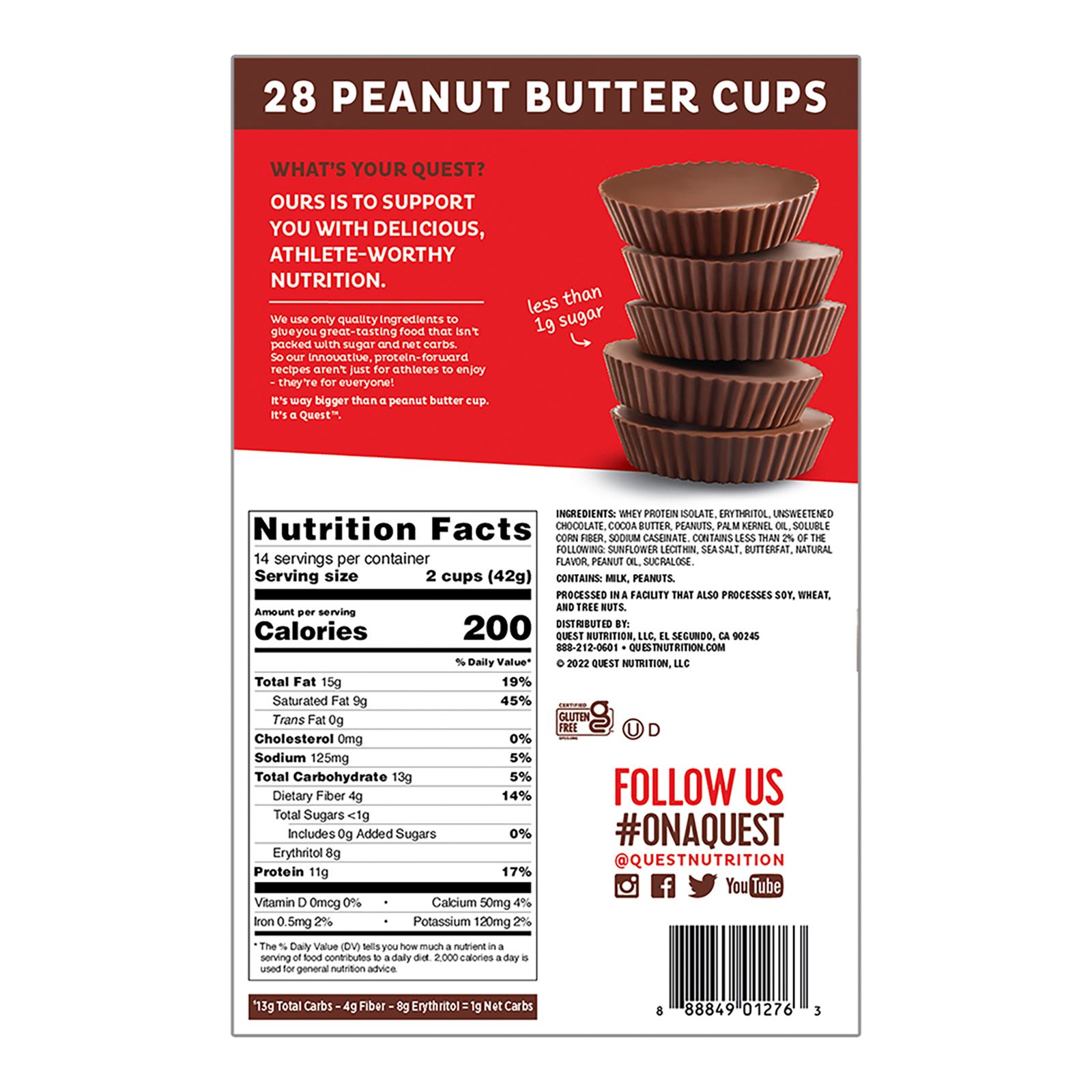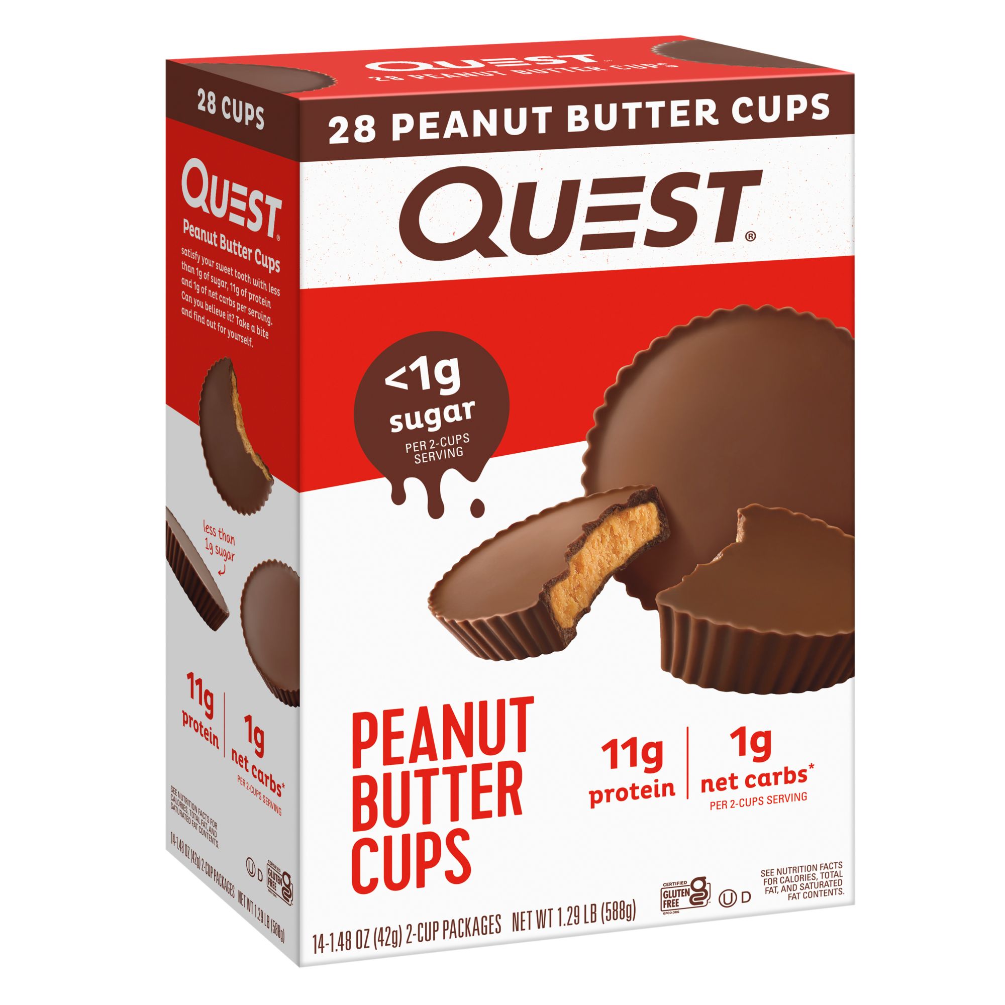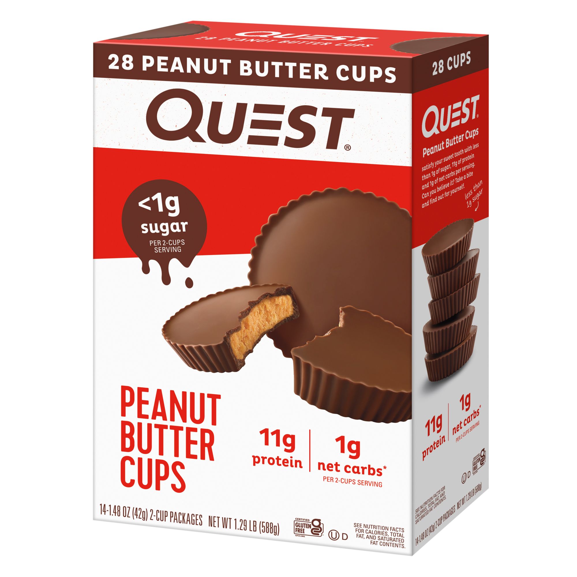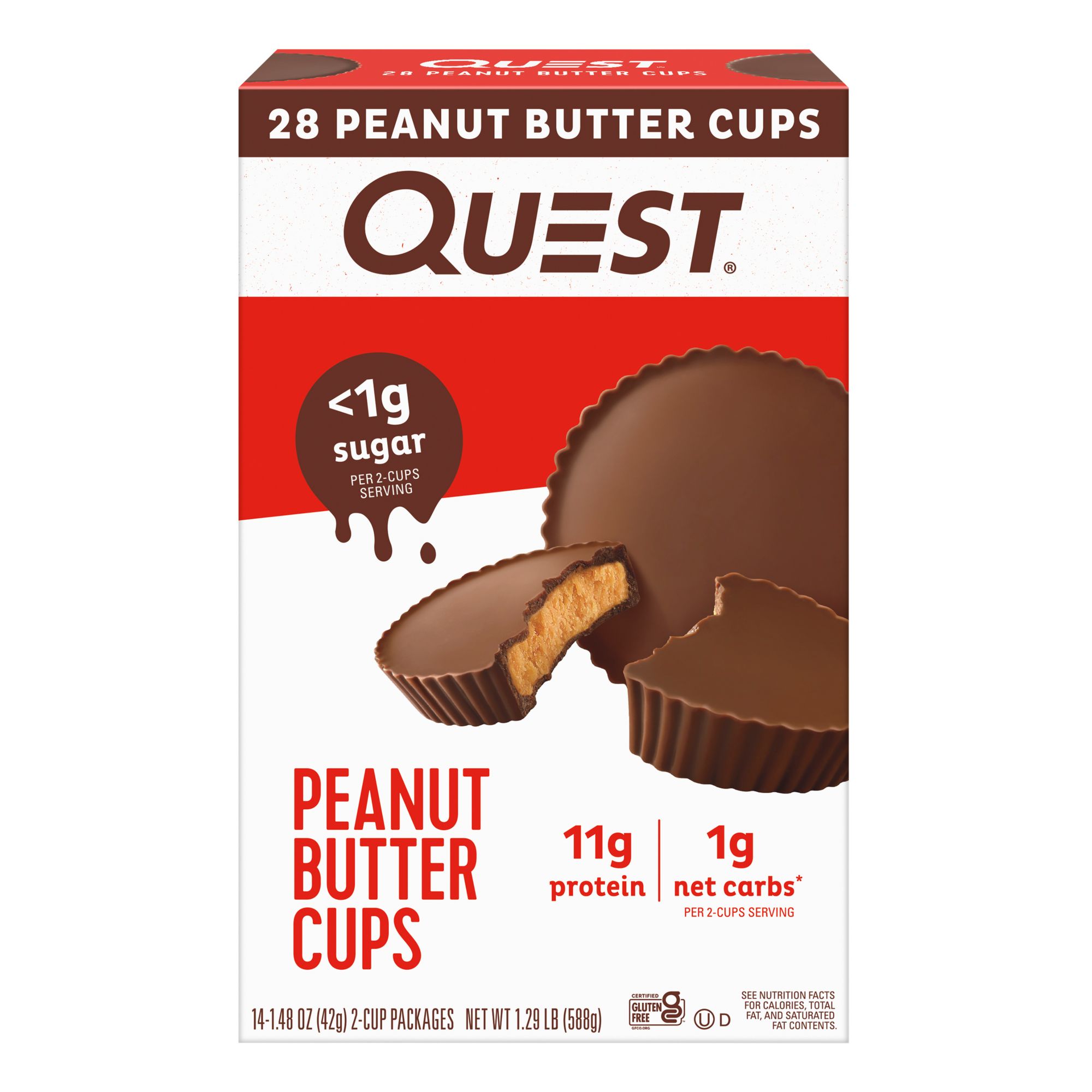 It's way bigger than a Peanut Butter Cup, it's a Quest! Treat yourself to the satisfying taste of indulgent chocolate and creamy peanut butter flavors. Take a bite and find out what makes these so popular. Quest aims to support you with delicious, athlete-worthy nutrition. Quest Peanut Butter Cups satisfy your sweet tooth with less than 1g of sugar, 11g of protein and 1g of net carbs per serving. They use only quality ingredients to give you great-tasting food that isn't packed with sugar and net carbs. Their innovative, protein-forward recipes aren't just for athletes to enjoy, they're for everyone. This special pack size includes 14 packs of two peanut butter cups each, for a total of 28 delicious cups in every box.