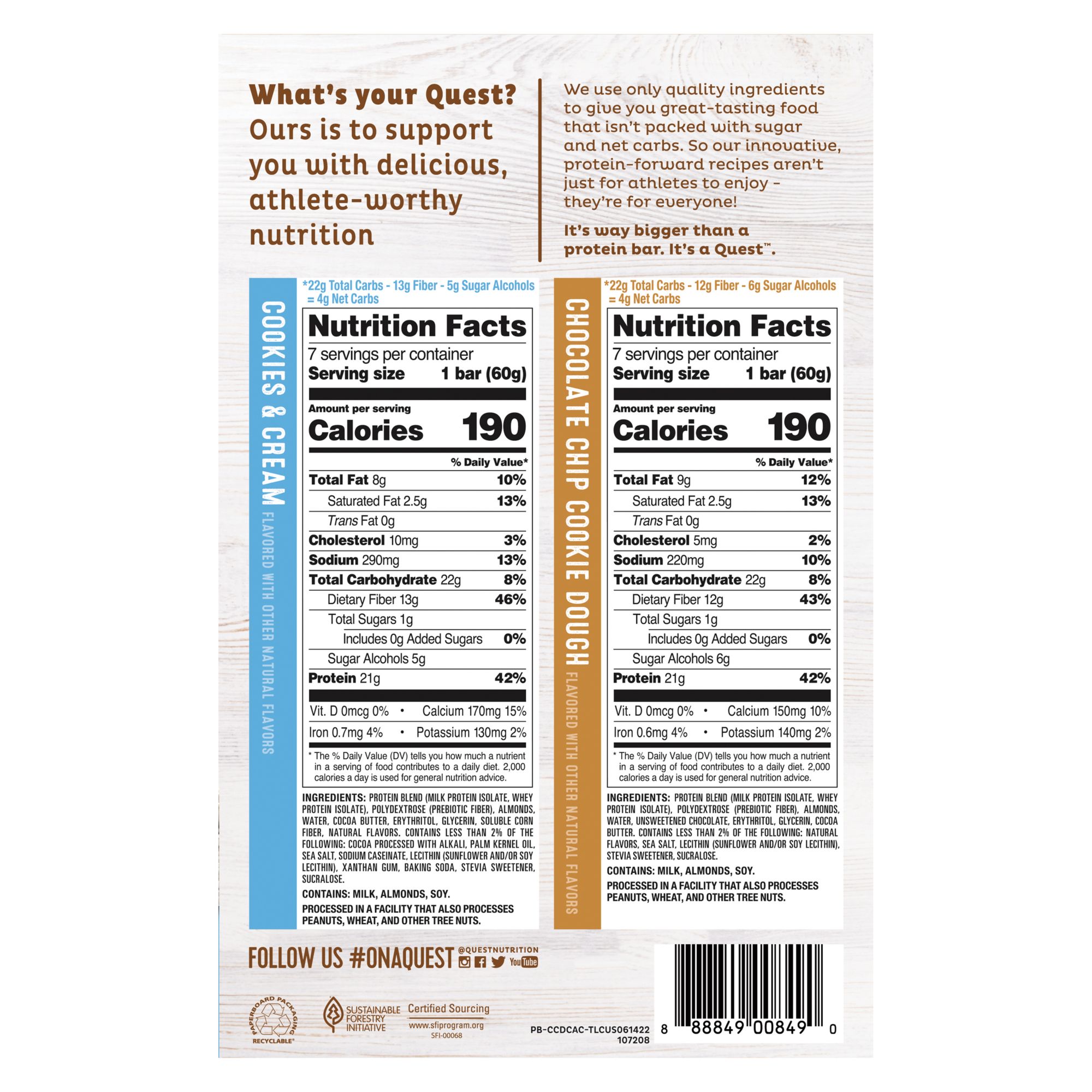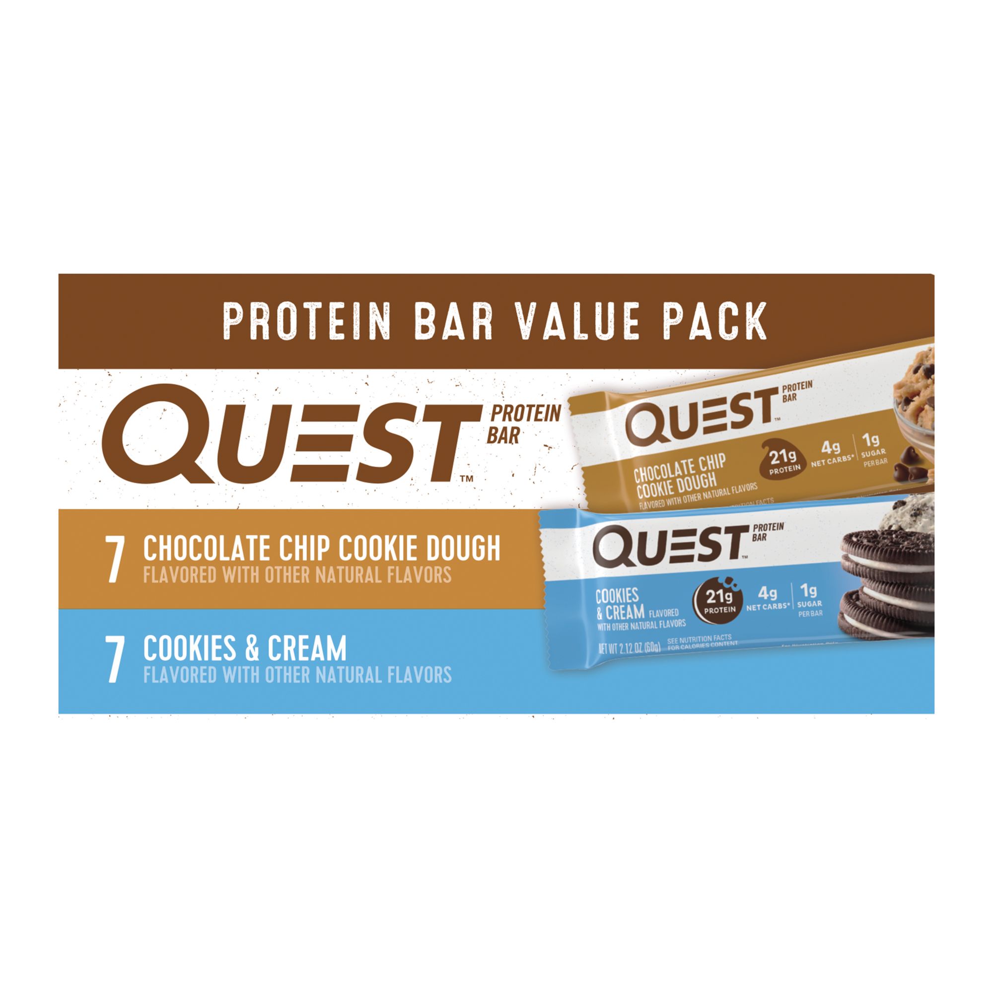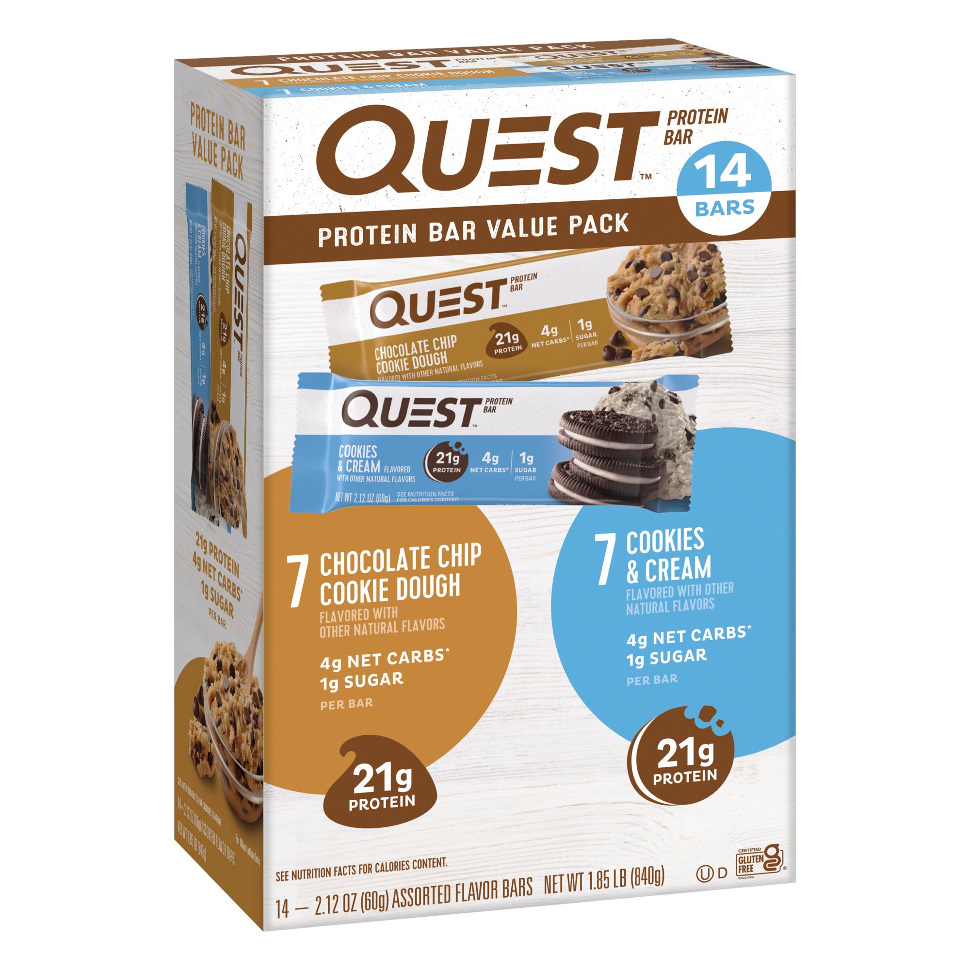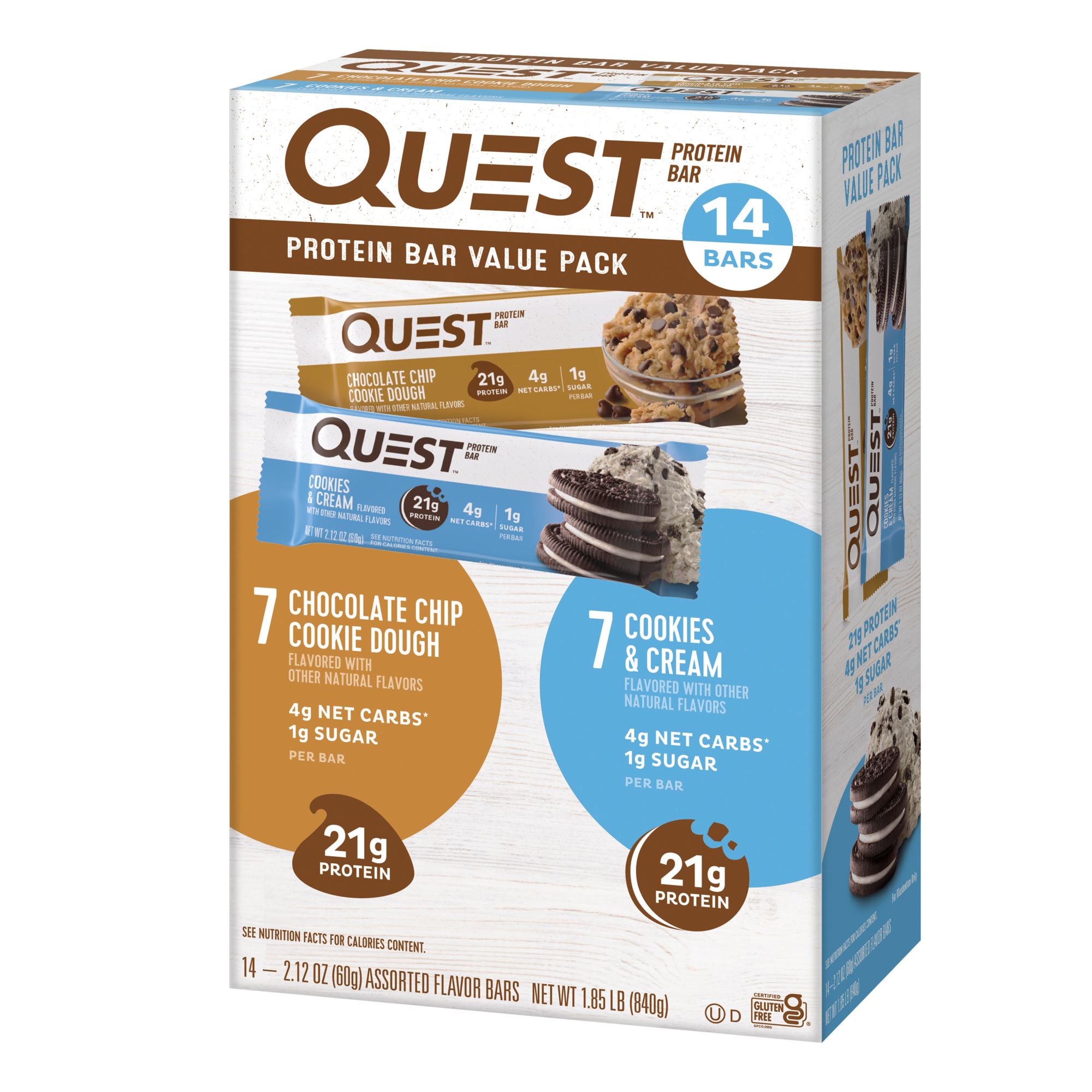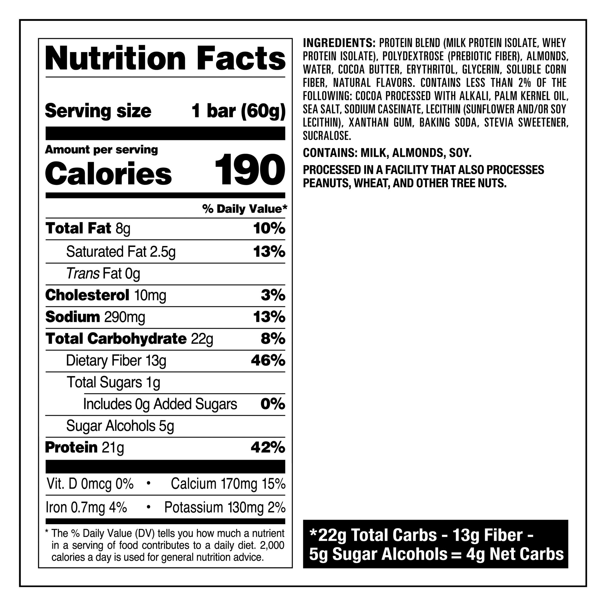 Portable, soft and chewy anytime snack 21g protein per bar Made with complete dairy-based protein isolates 1g sugar per bar 4g net carbs per bar 14g-15g of fiber per bar Gluten free certified Chocolate Chip Cookie Dough and Cookies and Cream Flavors Custom-made cookie chunks and chocolate flavored chips throughout the bars Kosher Product of USA Includes 14-count variety protein bars