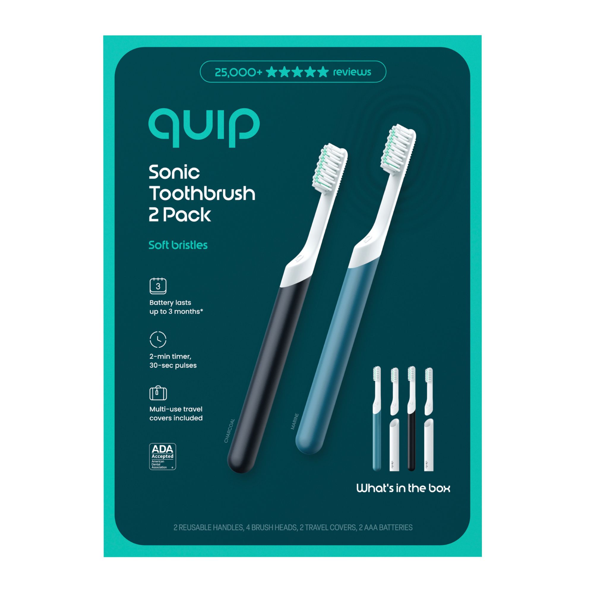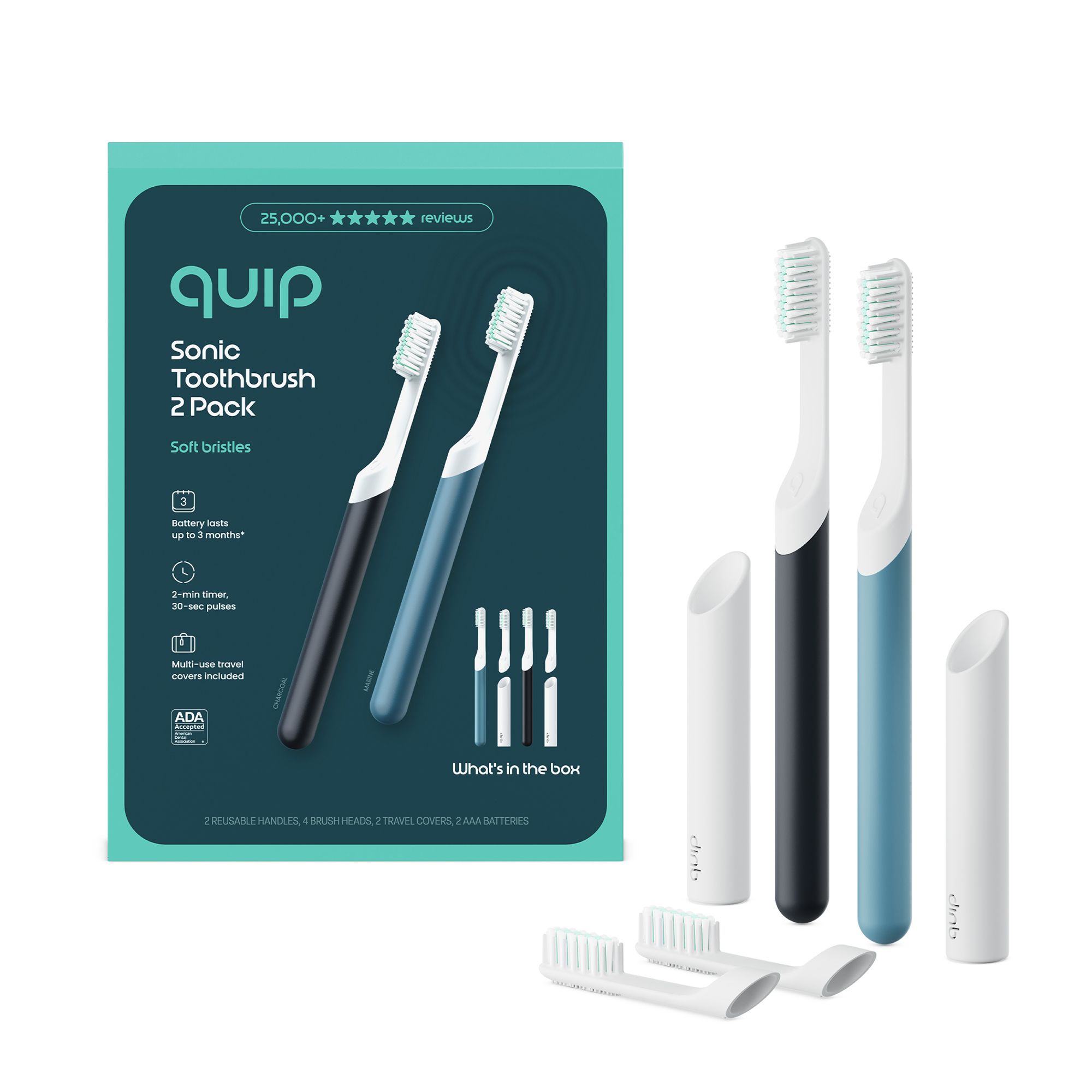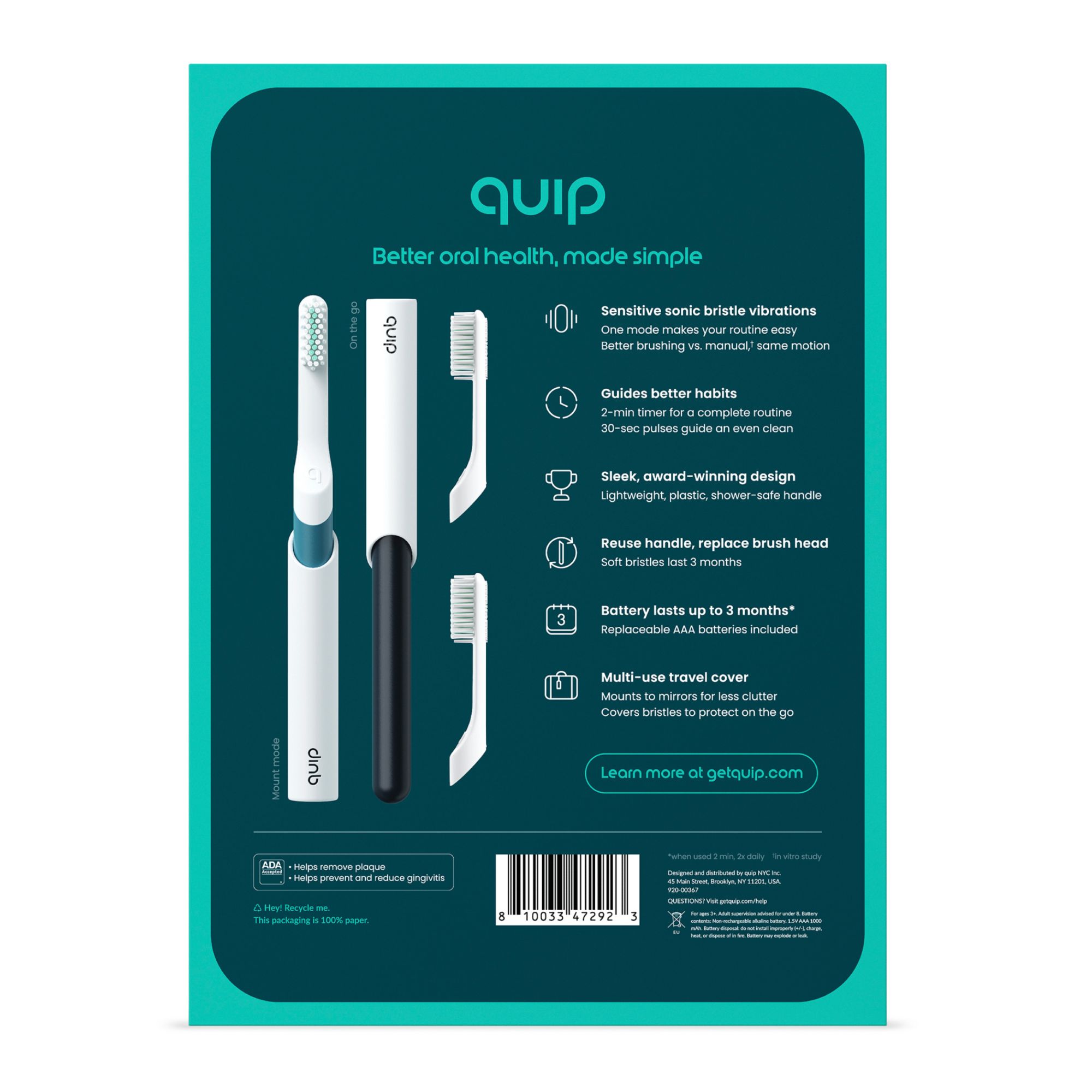 Brush better with good-for-you features, not gimmicks. The quip Sonic Electric Toothbrush 2 pk. makes it simple and sustainable with two premium, reusable handles, four replaceable soft-bristle brush heads (tongue scraper on back), two replaceable AAA batteries, and two multi-use travel covers that double as a mirror mount. Unlike some electric brushes that are big and bulky, quip is slim and lightweight with a long-lasting 3-month battery (no wires or bulky charger). Simply press the "q" button to power a gentle, effective clean with all the guiding features dentists recommend: sensitive sonic vibrations, 2-minute timer, 30-second pulses. The sleek, travel-ready design easily packs into any pocket, purse, or bag for on-the-go. Plus, it's water-resistant and shower-safe. Like most quip oral care products, the quip Electric Toothbrush is American Dental Association-Accepted, and shown to help remove plaque, and help prevent and reduce gingivitis. Better oral health, made simple, affordable, and enjoyable. This product carries a 1-Year Limited Warranty that covers all manufacturing defects from the date of purchase and excludes normal wear and tear, product misuse, or lost items. Reusable product. Packaging contains 100% recycled content, and packaging uses >50% plastic alternative such as FSC-certified paper, aluminum, steel, or glass, with great potential to be widely circular for the majority of product packaging. Refillable product solutions.