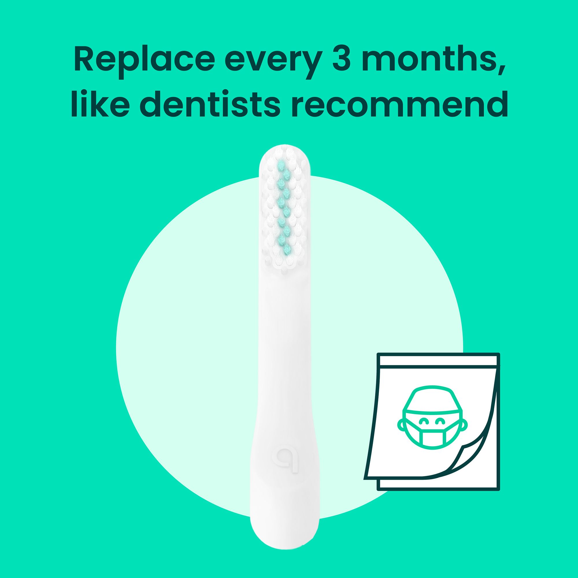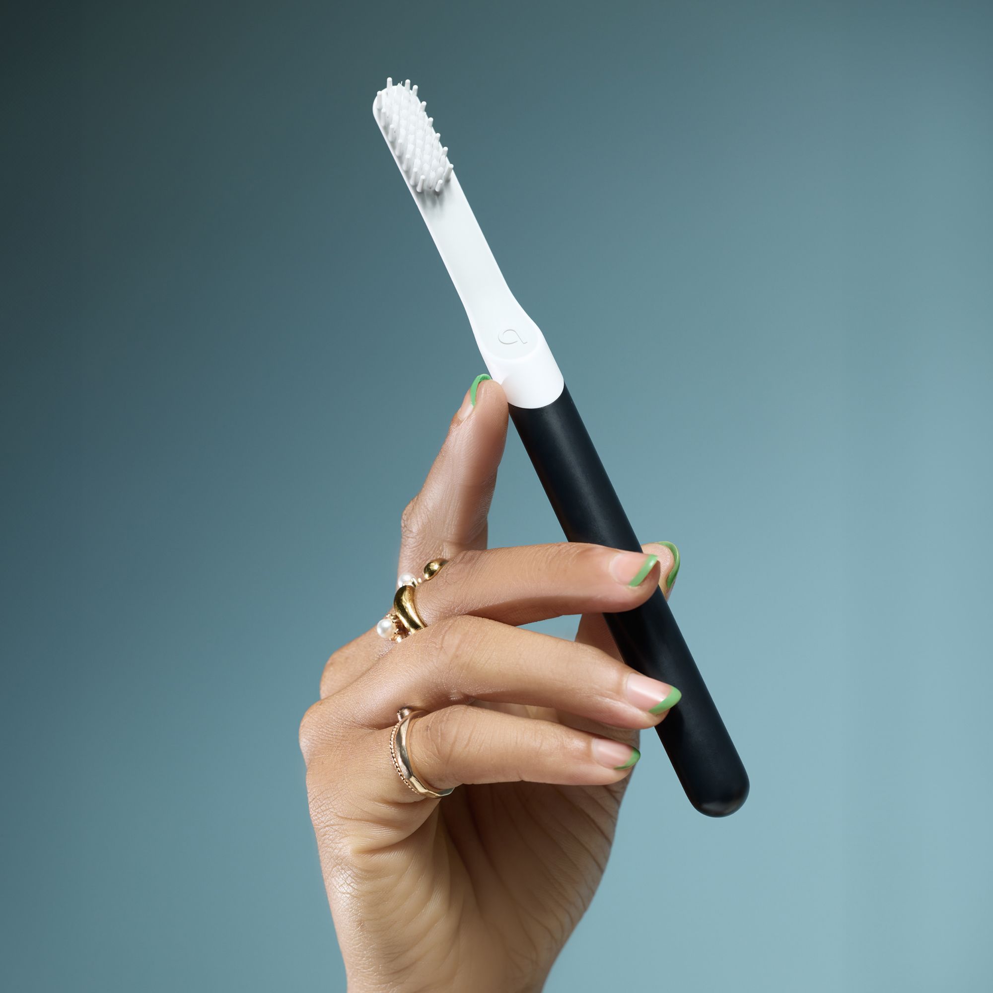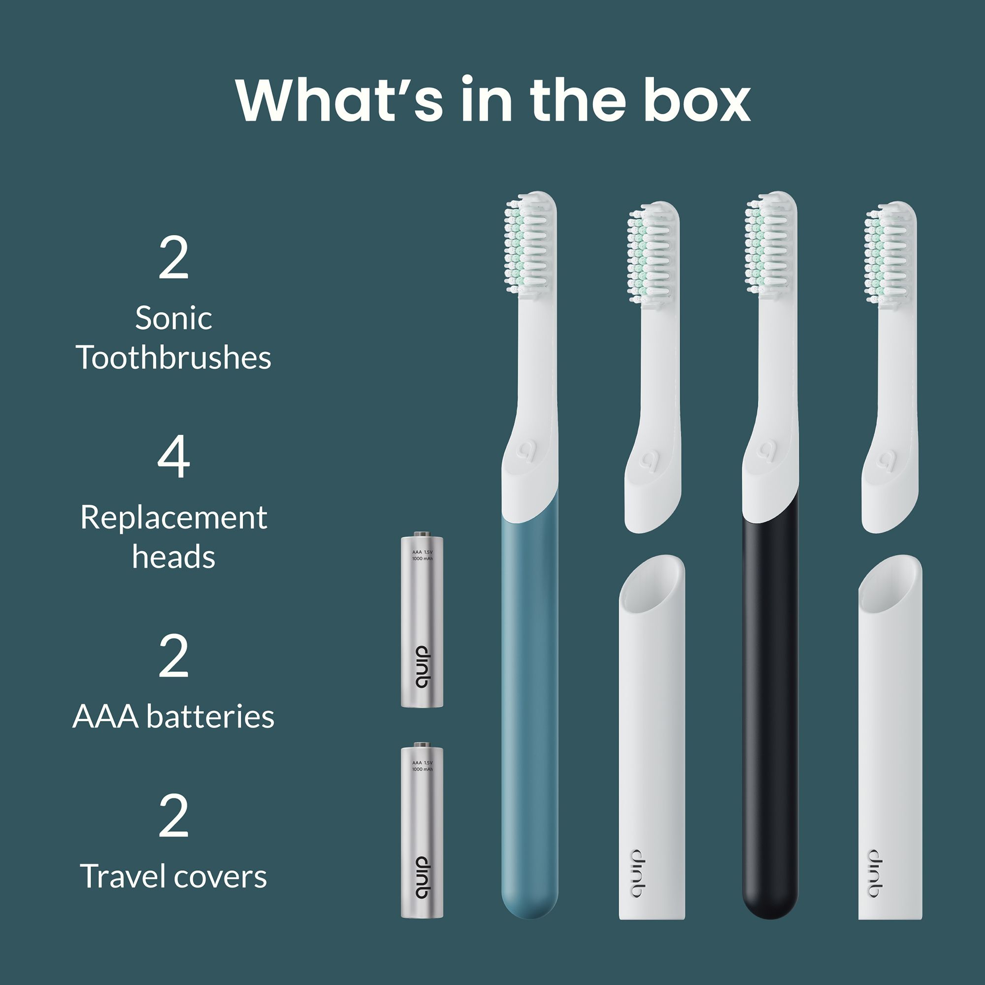 Brush better with good-for-you features, not gimmicks. The quip Sonic Electric Toothbrush 2 pk. makes it simple and sustainable with two premium, reusable handles, four replaceable soft-bristle brush heads (tongue scraper on back), two replaceable AAA batteries, and two multi-use travel covers that double as a mirror mount. Unlike some electric brushes that are big and bulky, quip is slim and lightweight with a long-lasting 3-month battery (no wires or bulky charger). Simply press the "q" button to power a gentle, effective clean with all the guiding features dentists recommend: sensitive sonic vibrations, 2-minute timer, 30-second pulses. The sleek, travel-ready design easily packs into any pocket, purse, or bag for on-the-go. Plus, it's water-resistant and shower-safe. Like most quip oral care products, the quip Electric Toothbrush is American Dental Association-Accepted, and shown to help remove plaque, and help prevent and reduce gingivitis. Better oral health, made simple, affordable, and enjoyable. This product carries a 1-Year Limited Warranty that covers all manufacturing defects from the date of purchase and excludes normal wear and tear, product misuse, or lost items. Reusable product. Packaging contains 100% recycled content, and packaging uses >50% plastic alternative such as FSC-certified paper, aluminum, steel, or glass, with great potential to be widely circular for the majority of product packaging. Refillable product solutions.
