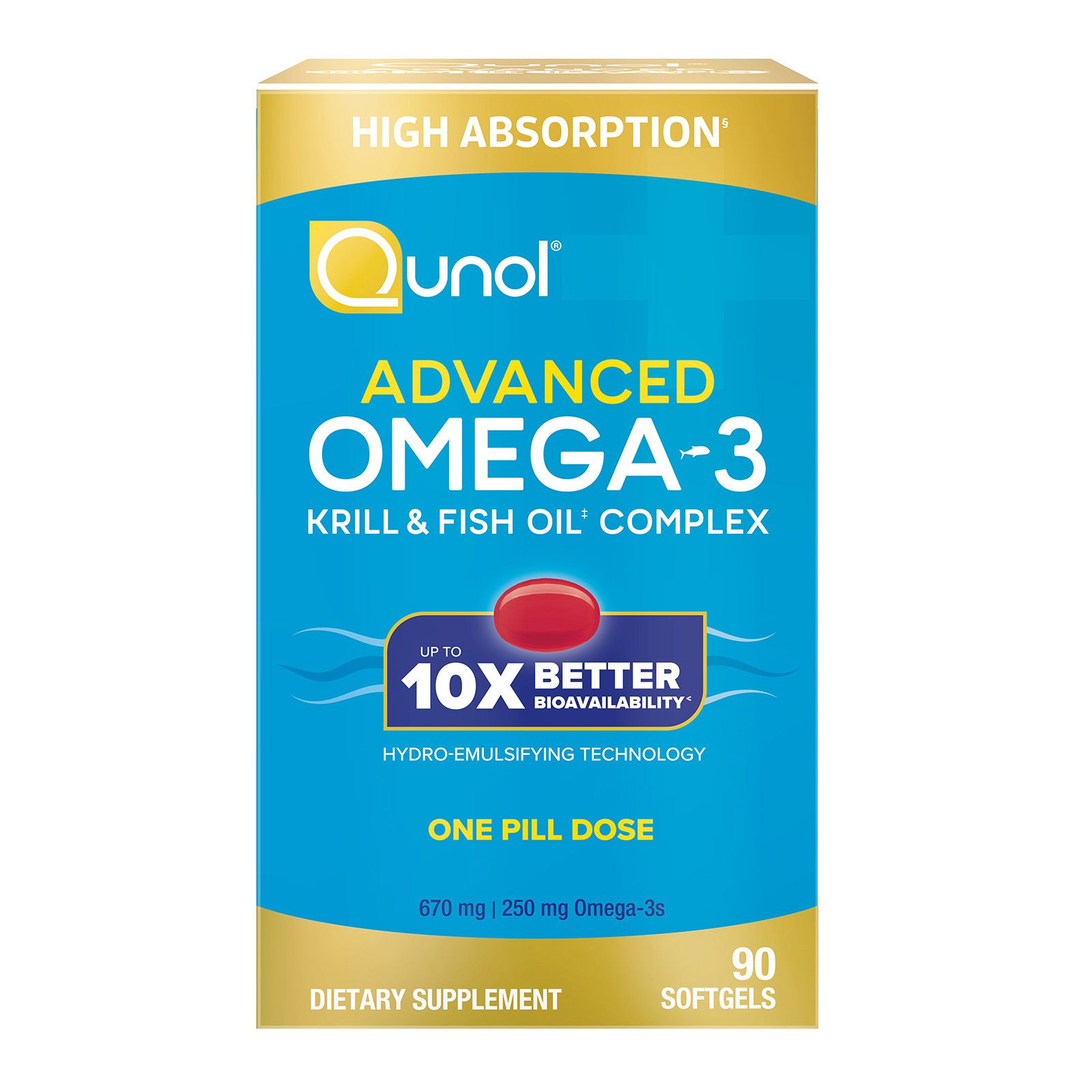 Qunol’s Omgea-3 Krill & Fish Oil Complex uses phospholipid micelle technology, which helps reach your digestive system more efficiently, while delivering up to 10x better bioavailability of EPA (Eicosatetraenoic Acid) and DHA (Docosahexaenoic Acid). The high-absorption softgel contains the same rich benefits of Omega-3 Fish Oil, while requiring less fish. Qunol Advanced Omega-3 also helps support brain, eye, heart, and joint health.