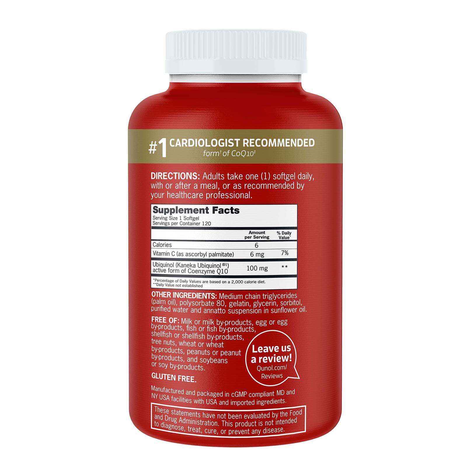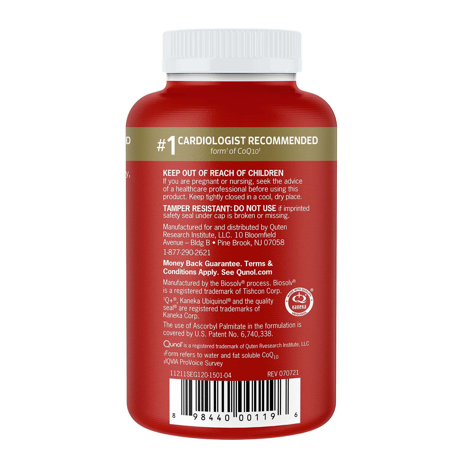 #1 cardiologist recommended Superior absorption Essential nutrient for cellular energy Powderful antioxidant Beneficial to statin drug users Supports heart & vascular health Promotes healthy blood pressure levels Active CoQ10 Dissolves in water & fat Includes Qunol mega ubiquinol CoQ10 120 ct.
