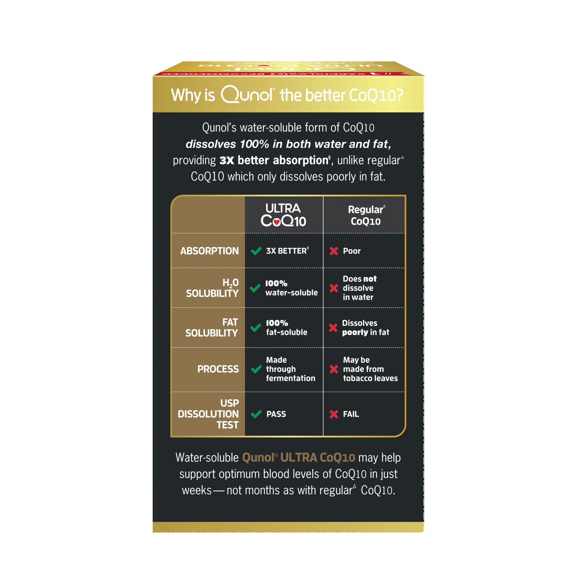 100% natural CoQ10 softgels 100% soluble, dissolves in both water and fats Up to 300% more effective Pharmaceutical grade clinical strength Clinically shown to support heart function Includes 120 count softgels