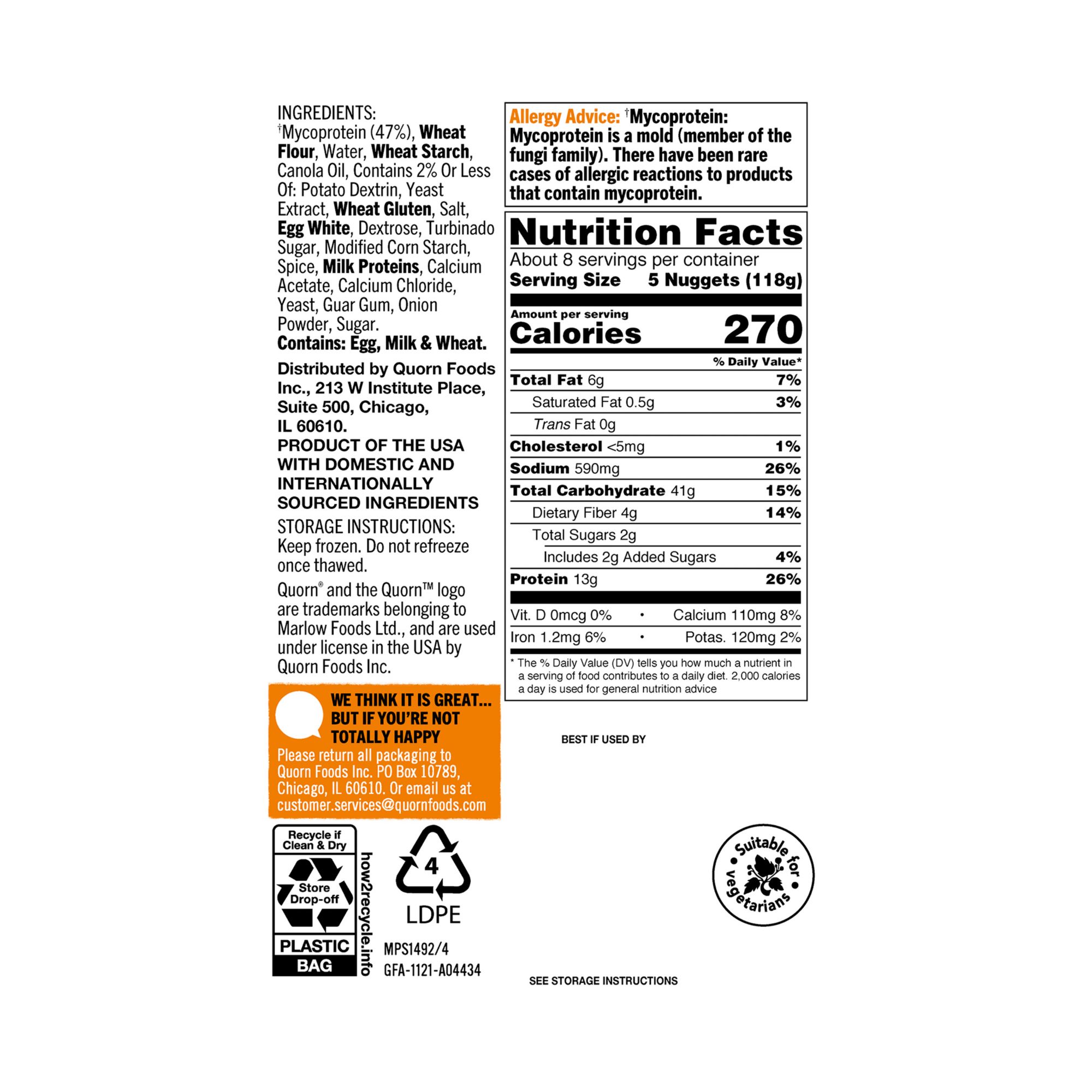 Ingredients:Mycoprotein (32%), Wheat Flour, Canola Oil, Egg White, Yeast Extract. Contains 2% or Less of Wheat Starch, Potato Dextrin, Salt, Wheat Gluten, Dextrose, Whole Egg, Milk Proteins, Textured Wheat Protein (Wheat Protein, Wheat Flour), Pea Fiber, Pectin, Calcium Chloride, Calcium Acetate, Turbinado Sugar, Black Pepper, Yeast, Onion Powder, Sage, Sugar.