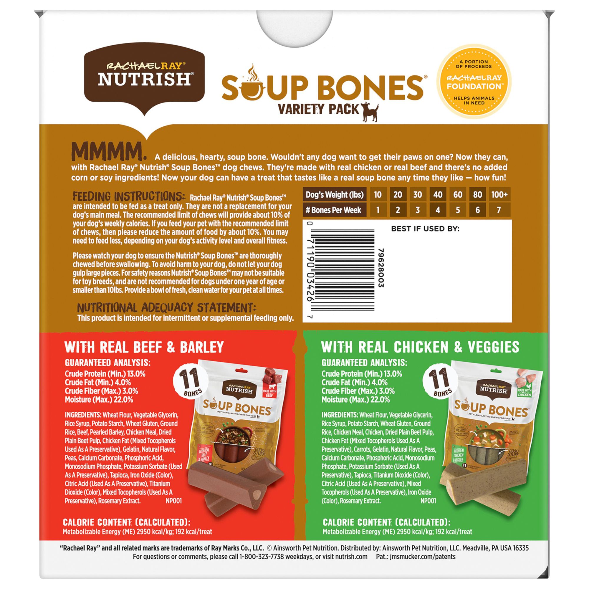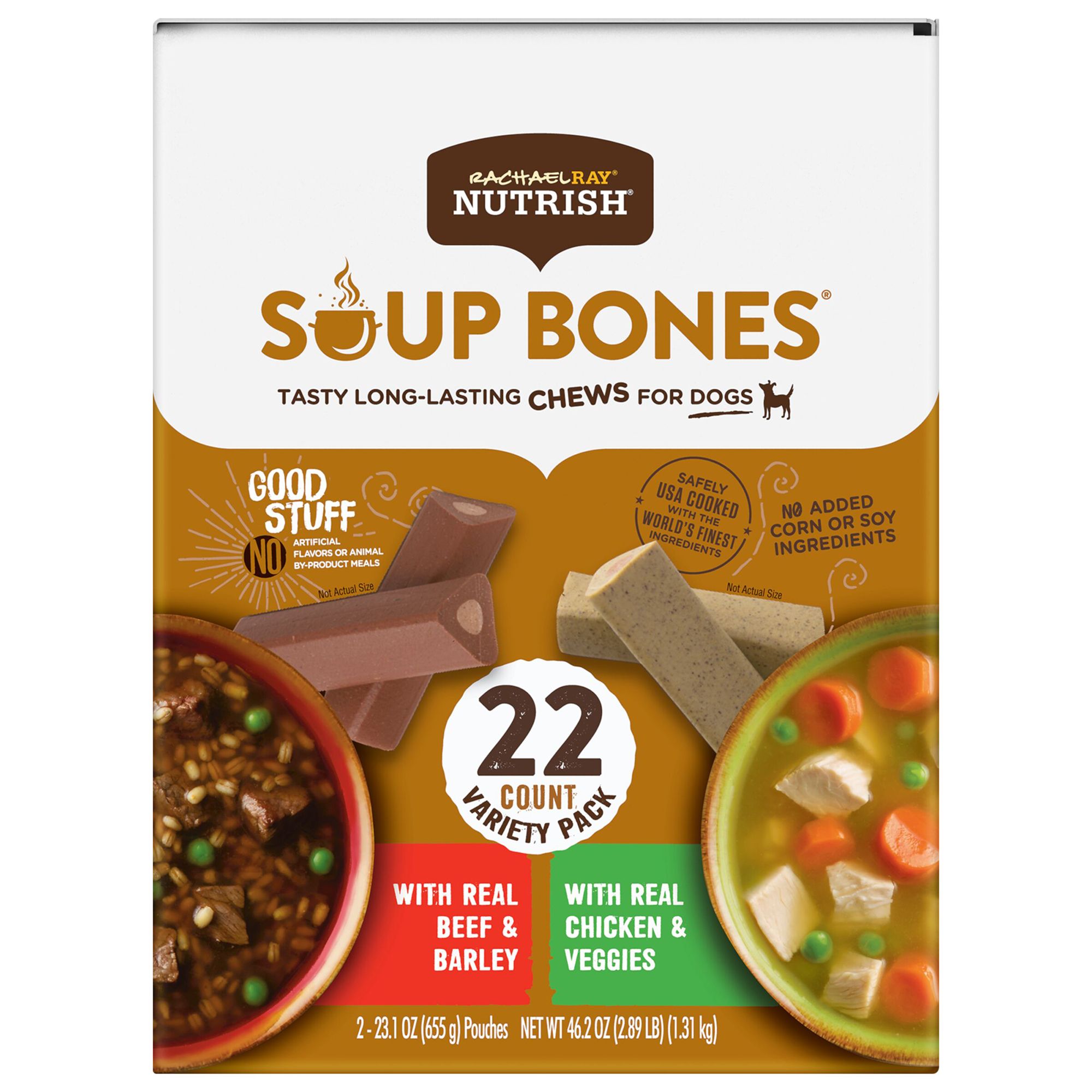 Your pup can’t wait to taste the savory goodness of Rachael Ray Nutrish long-lasting chew bones! Made with real U.S. farm-raised chicken or beef, these treats are packed with rich, hearty flavor your dog will love. Each Rachael Ray Nutrish Soup Bones chew has all the deliciousness of a wholesome soup bone with a tender, meaty center inside. This variety pack includes two 11-count bags of yummy Beef & Barley Flavor and Chicken & Veggies Flavor long-lasting chew bone dog treats.