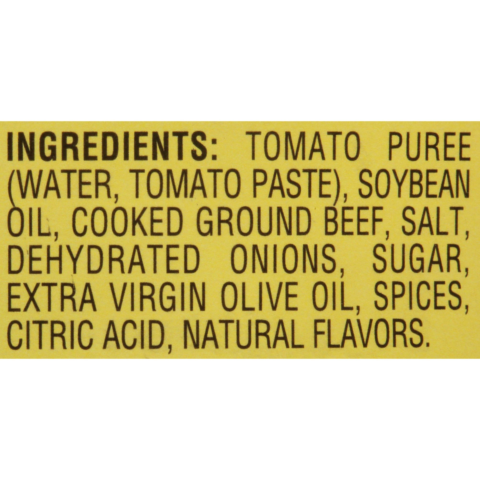 • Ingredients: Tomato Puree (Water, Tomato Paste), Cooked Ground Beef, Salt, Olive Oil, Sugar, Dehydrated Onions, Dehydrated Garlic, Spices, Citric Acid.