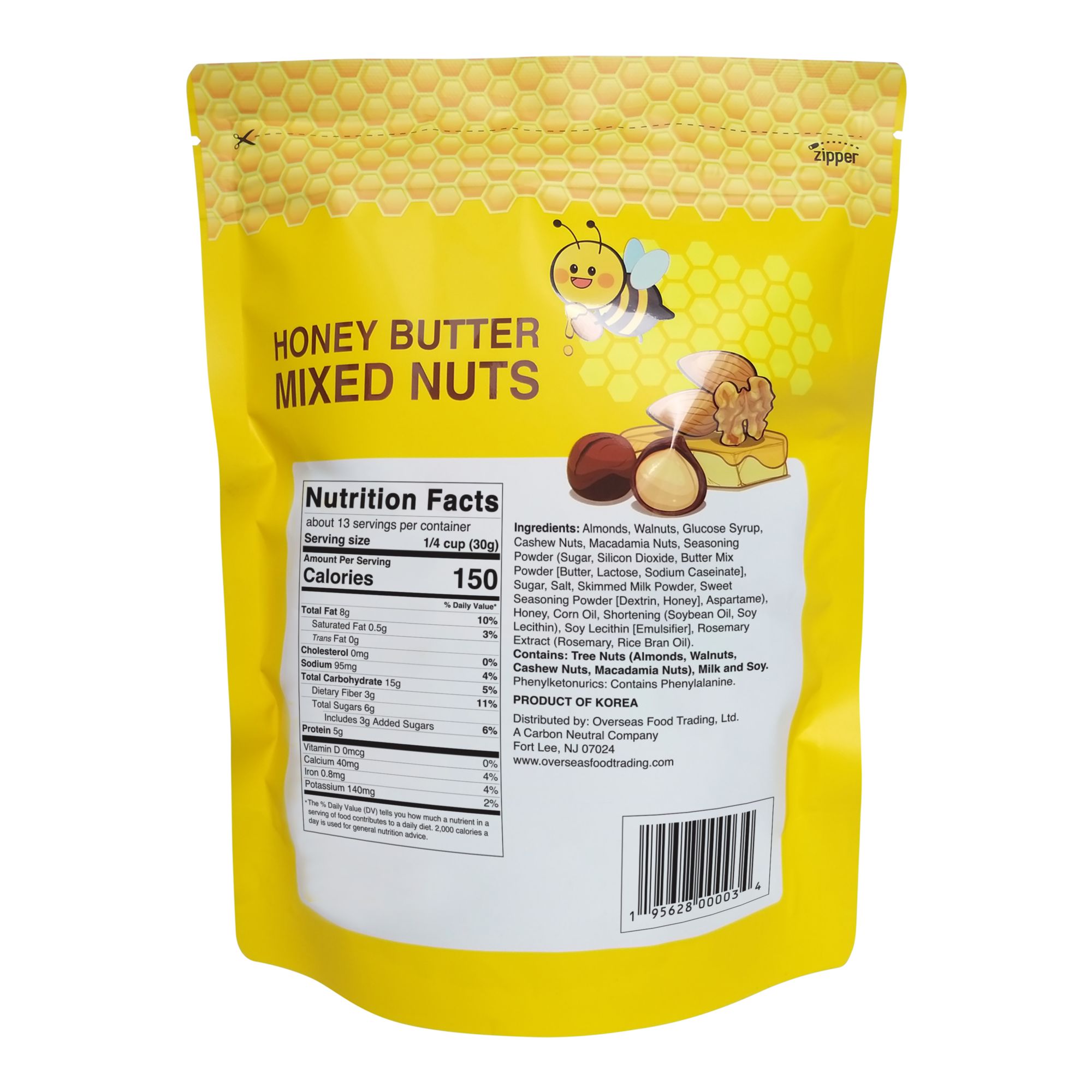Ingredients: Almonds, Walnuts, Glucose Syrup, Cashew Nuts, Sugar, Macadamia Nuts, Seasoning (Sugar, Silicon Dioxide, Seasoning Powder (Butter Mix Powder (Butter, Lactose, Sodium Caseinate), Sugar, Salt, Skimmed Milk Powder, Honey Powder (Dextrin, Honey) Aspartame)), Honey, Corn Oil, Shortening (Soybean Oil, Soy Lecithin), Emulsifier: Soy Lecithin, Herb Extract (Rice Bran Oil, Antioxidant: Rosemary Extract).