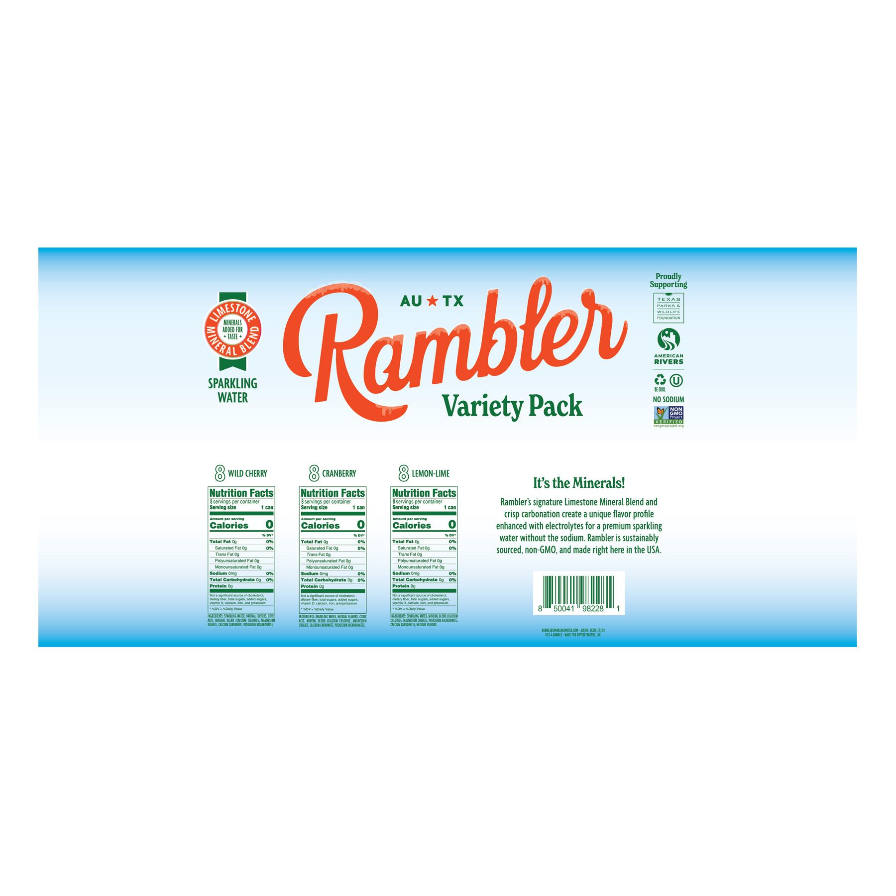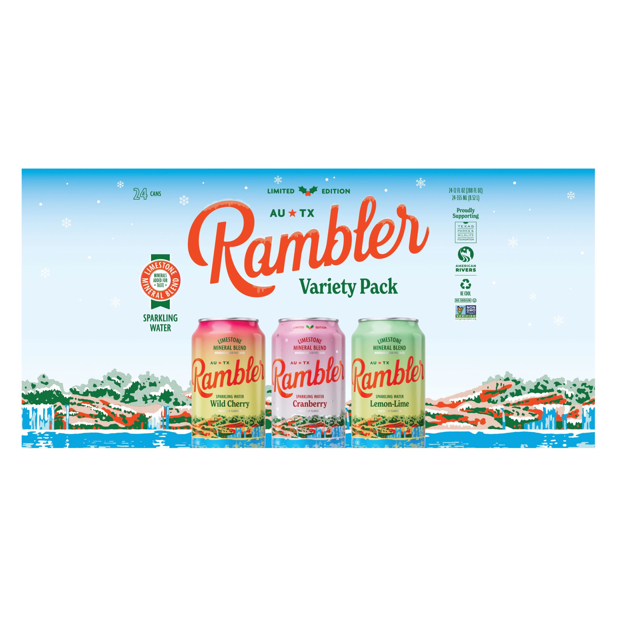 Rambler Sparkling Water - Born in Austin, TX, Rambler is the only sparkling mineral water of its kind. Sustainably sourced, made in America, packed with electrolytes and carbonated to the perfect level. Tasty minerals, crispy bubbles! Filtration: Our purification process is simple. We start with water that is sustainably sourced, then isolate and remove impurities through reverse-osmosis. Remineralize: Our proprietary limestone mineral blend is then added back for taste - calcium, magnesium and potassium. For a clean, balanced sparkling water that is sodium-free. Carbonation: Finding the right balance of carbonation can be tricky. Too much and it overwhelms the taste of the base water; too little and the taste is flat. We inject the perfect measure of bubbles to give Rambler the right amount of sparkle and a balanced mouth-feel that enhances our limestone mineral blend flavor. Giving back: Sustainability is only step one. We’re committed to conserving natural areas and waterways which is why we partner with programs like American Rivers and Texas Parks & Wildlife Foundation at the local level across the country. Zero calories. No sweeteners. Nothing Artificial. 24 cans total.