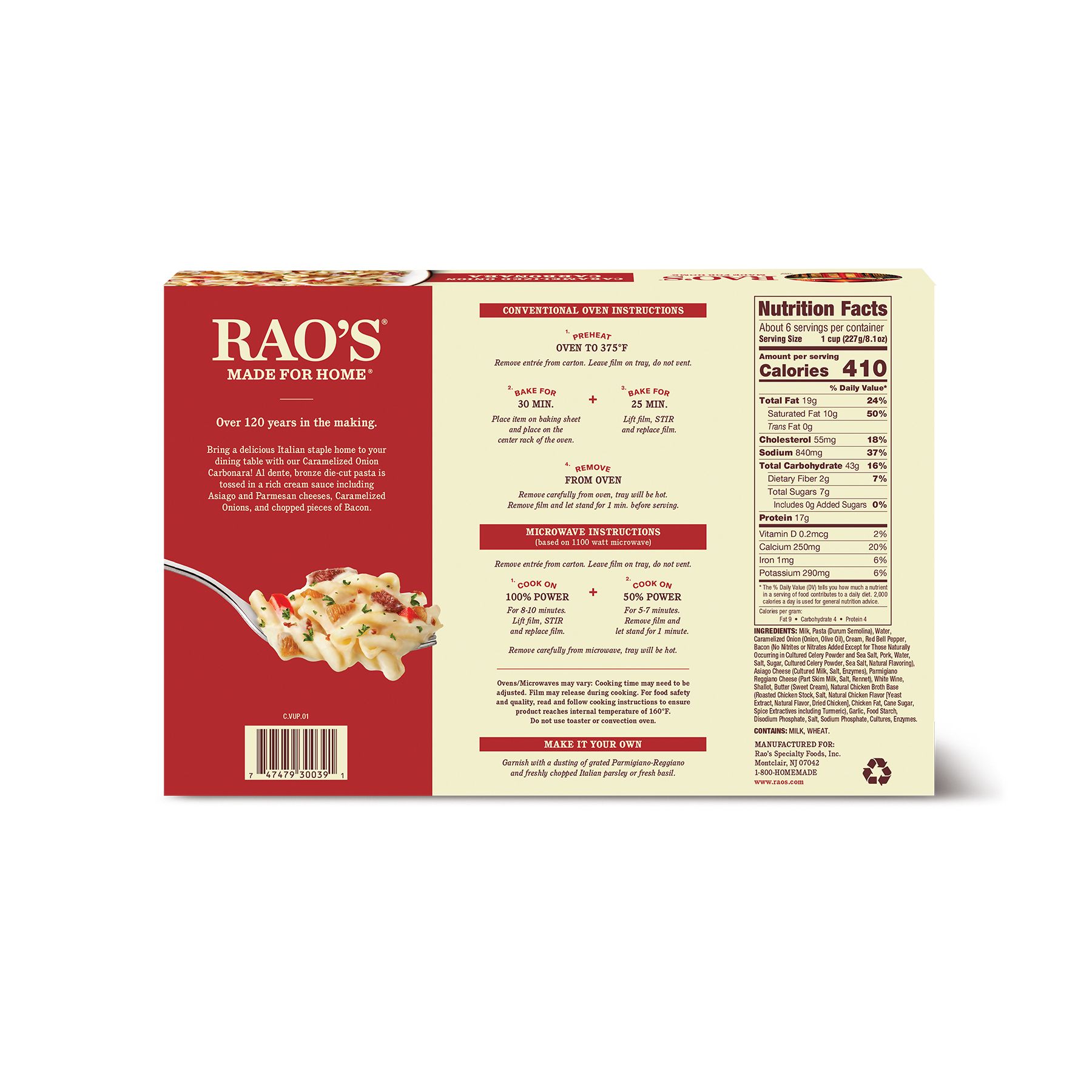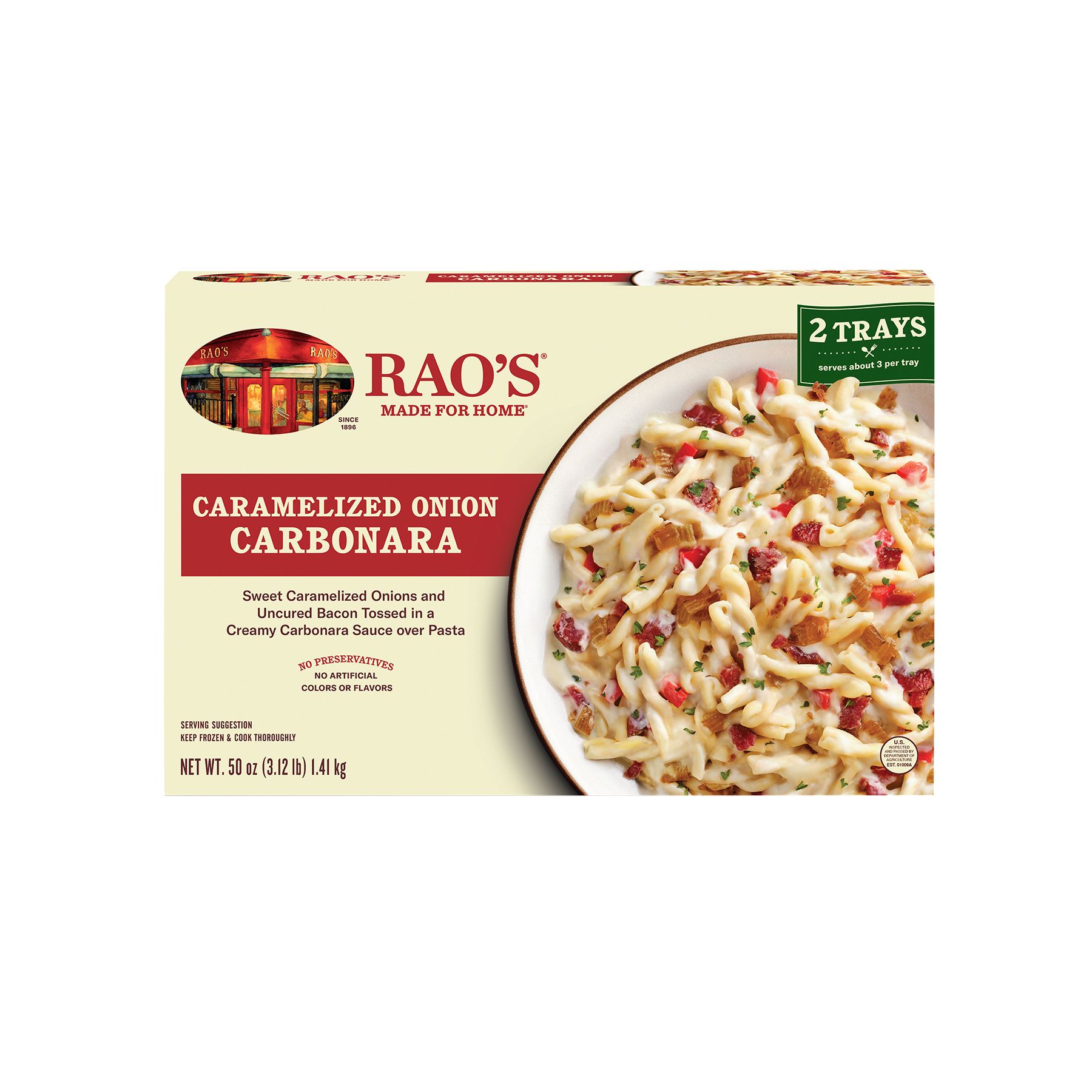 All natural, premium quality: Rao's Made for Home Caramelized Onion Carbonara is a premium, frozen meal made with sweet caramelized onions and uncured bacon, tossed in a creamy carbonara sauce over durum semolina pasta. Each bite brings you the warm, classic flavor of Italian cooking.