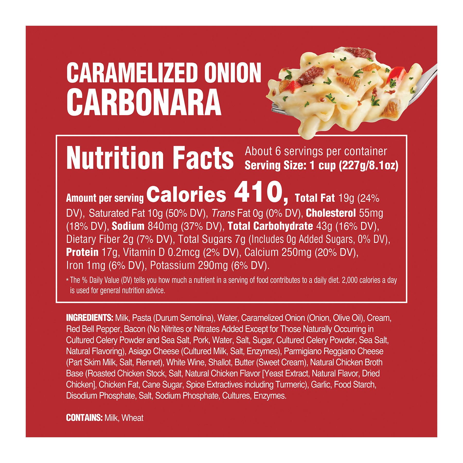 Ingredients: Milk, Pasta (Durum Semolina), Water, Caramelized Onion (Onion, Olive Oil), Cream, Red Bell Pepper, Uncured Bacon (No Nitrites or Nitrates Added Except Those Naturally occurring in Cultured Celery Powder, Pork, Water, Salt, Sugar, Cultured Celery Powder, Sea Salt, Natural Flavoring), Asiago Cheese (Cultured Milk, Salt, Enzymes), Parmesan Cheese (Milk, Cultures, Salt, Rennet, Enzymes), Contains 2% or less of: White Wine, Shallots, Butter (Sweet Cream), Natural Chicken Broth Base (Roasted Chicken Stock, Salt, Natural Chicken Flavor [Yeast Extract, Natural Flavor, Dried Chicken], Chicken Fat, Cane Sugar, Spice Extractives including Turmeric), Garlic, Food Starch, Sodium Phosphate, Salt, Cultures, Enzymes. Contains: Milk, Wheat.