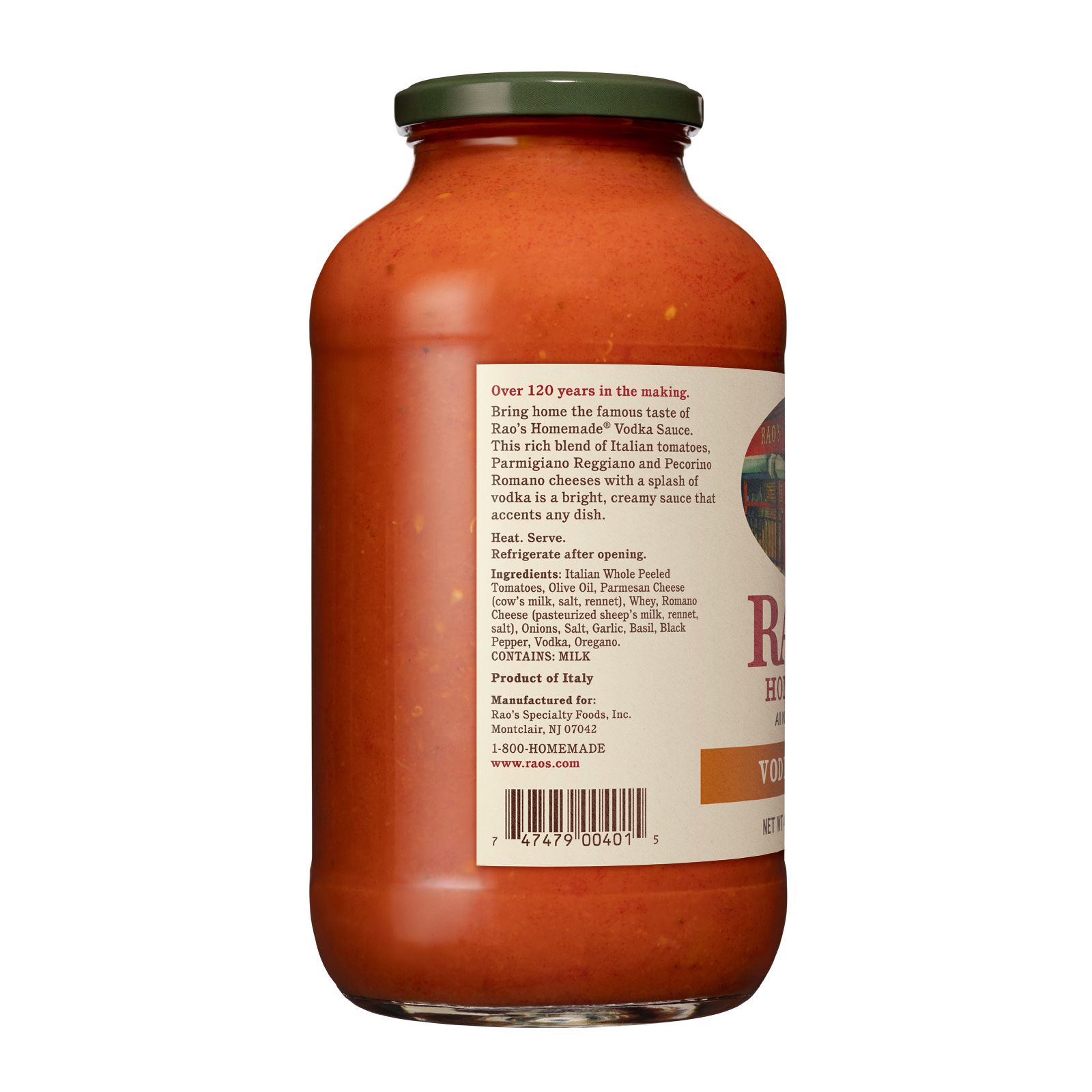 Rao's Vodka Sauce is a velvety blend of Italian tomatoes, Parmigiano Reggiano cheese, Pecorino Romano cheese and vodka. By mixing a quality vodka with Italian tomatoes, onions and garlic, then simmering the alcohol out, Rao's creates a rich and creamy sauce with no alcohol content.