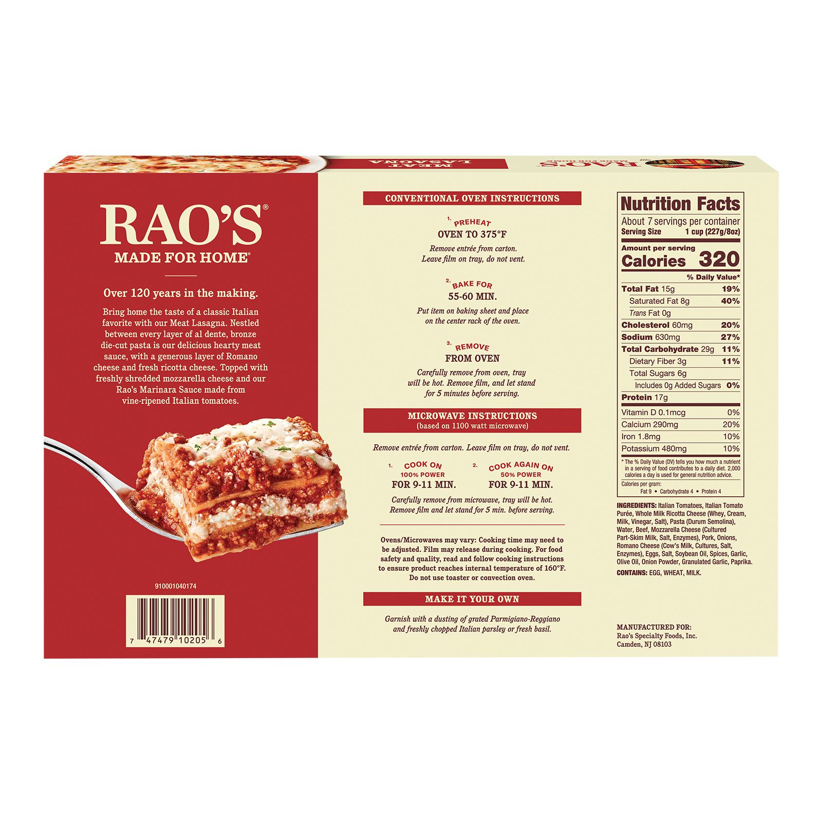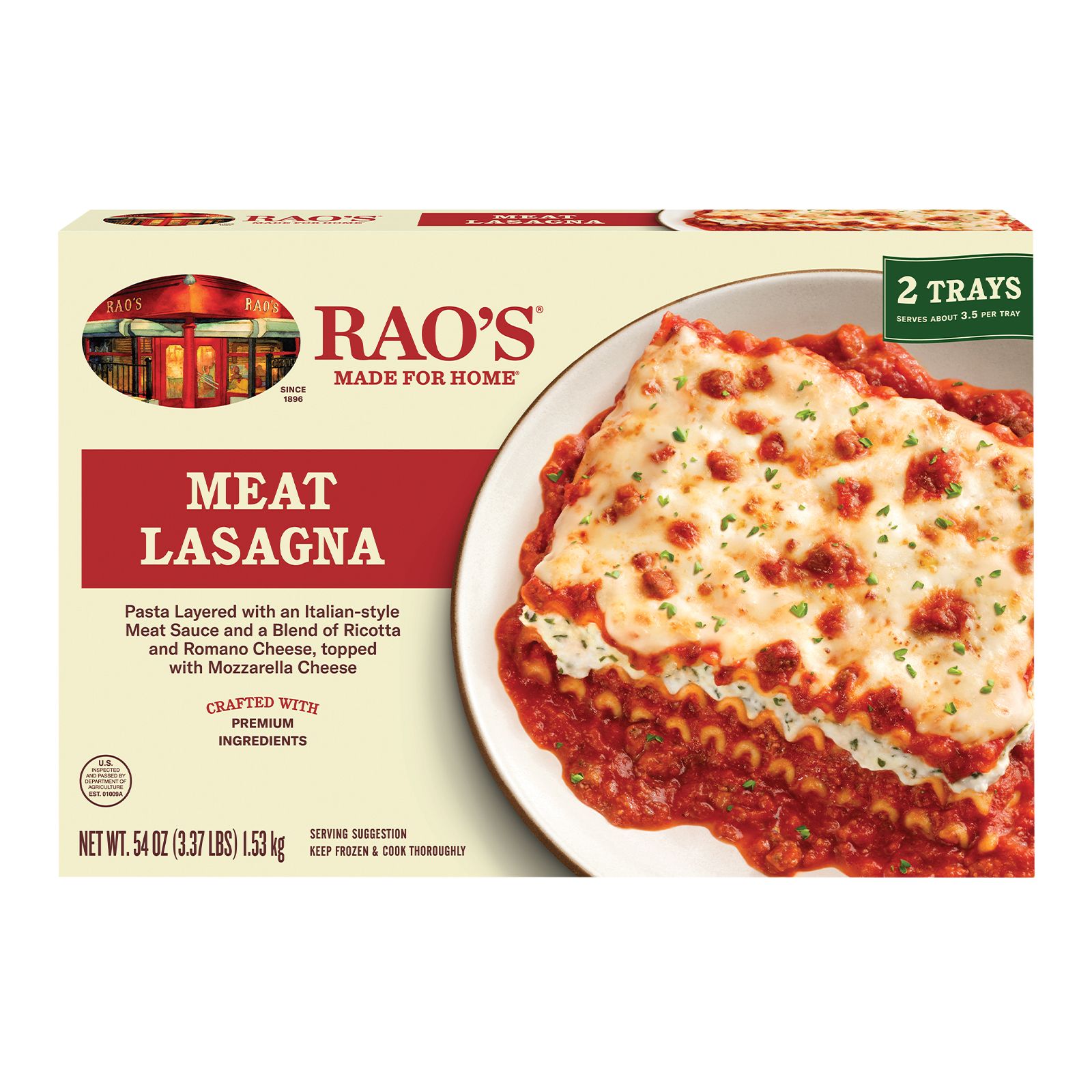 Bring home the taste of a classic Italian favorite with our Meat Lasagna. Nestled between every layer of al dente, bronze die-cut pasta is our delicious hearty meat sauce, with a generous layer of Romano cheese and fresh ricotta cheese. Topped with freshly shredded mozzarella cheese and our Rao's Marinara Sauce made from vine-ripened Italian tomatoes.