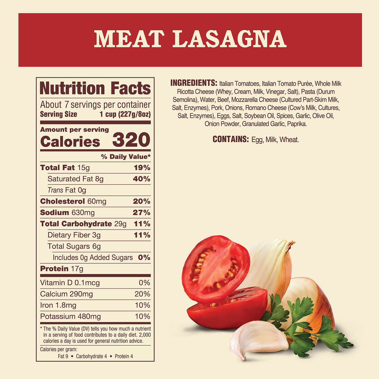 Ingredients: Italian Tomatoes, Italian Tomato Puree, Whole Milk Ricotta Cheese (Whey, Cream, Milk, Vinegar, Salt), Pasta (Durum Semolina), Water Beef, Mozzarella Cheese (Cultured Part-Skim Milk, Salt, Enzymes), Pork, Onions, Romano Cheese (Cow's Milk, Cultures, Salt, Enzymes), Eggs, Salt Soybean Oil, Spices, Garlic, Olive Oil, Onion Powder, Granulated Garlic, Paprika.